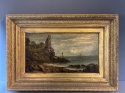 Europeisk 1800-tals oljemålning med strand och hav. Ramyttermått: 66,5cm x 46,5 cm. Åldersslitage.