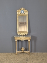 Spegel: Höjd ca 98cm Bredd ca 39cm. Konsollbord: Höjd 66cm Bredd 56cm Djup ca 30cm. Avslag/slitage, främst på bordsbenen.