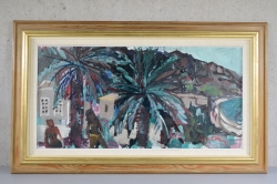 Motiv av Göta Kanalbolags kontorsbyggnad i Motala Hamn. Ca 71x62cm.