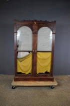 Höjd 158cm Bredd 102cm Djup 28,5cm. Tygbeklädd baksida. Nyckel saknas. Defekt.
