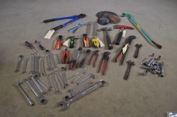 Diverse verktyg. Bl.a yxa, hammare, tänger, kapskivor mm.