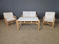 Glassskiva saknas. Soffa: Rygghöjd 70cm Bredd 115cm Djup 70cm. Dynor: Fläckar och solblekta. Bruksslitage.