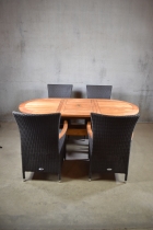 Grönmålat med guldmålade detaljer. 8st stolar varav två karmstolar. Stolarna är snarlika och 1700-tal samt senare kopior.