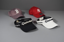 2st TaylorMade, sminkrester, begagnade. New Era Cap röd, oanvänd. New Era Cap lila, sminkrester, begagnad.