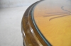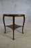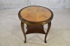 19. Sidobord, 1900-talets andra hälft, skiva med intarsia, hylla undertill, höjd 62,5cm och 63cm i diameter