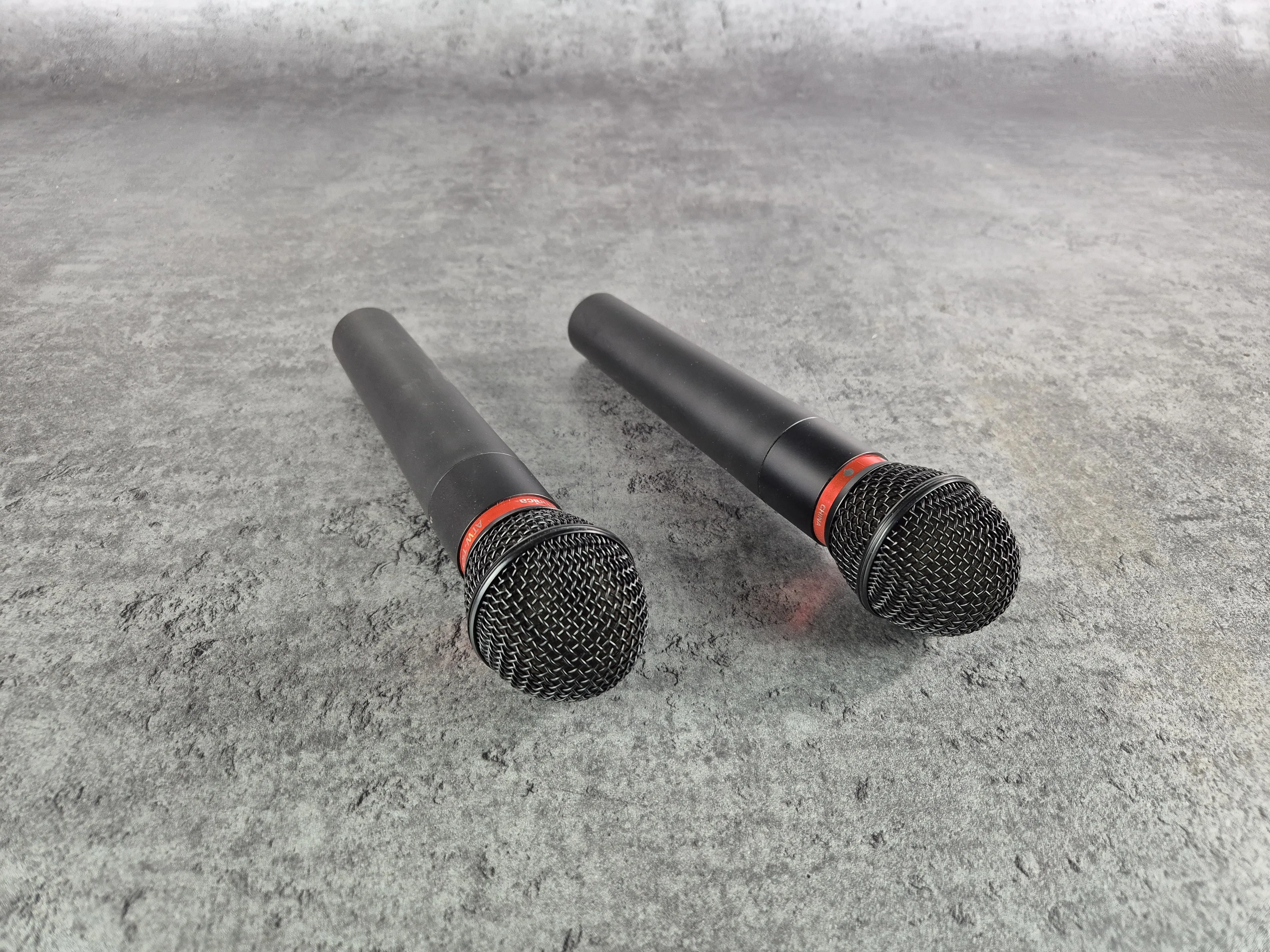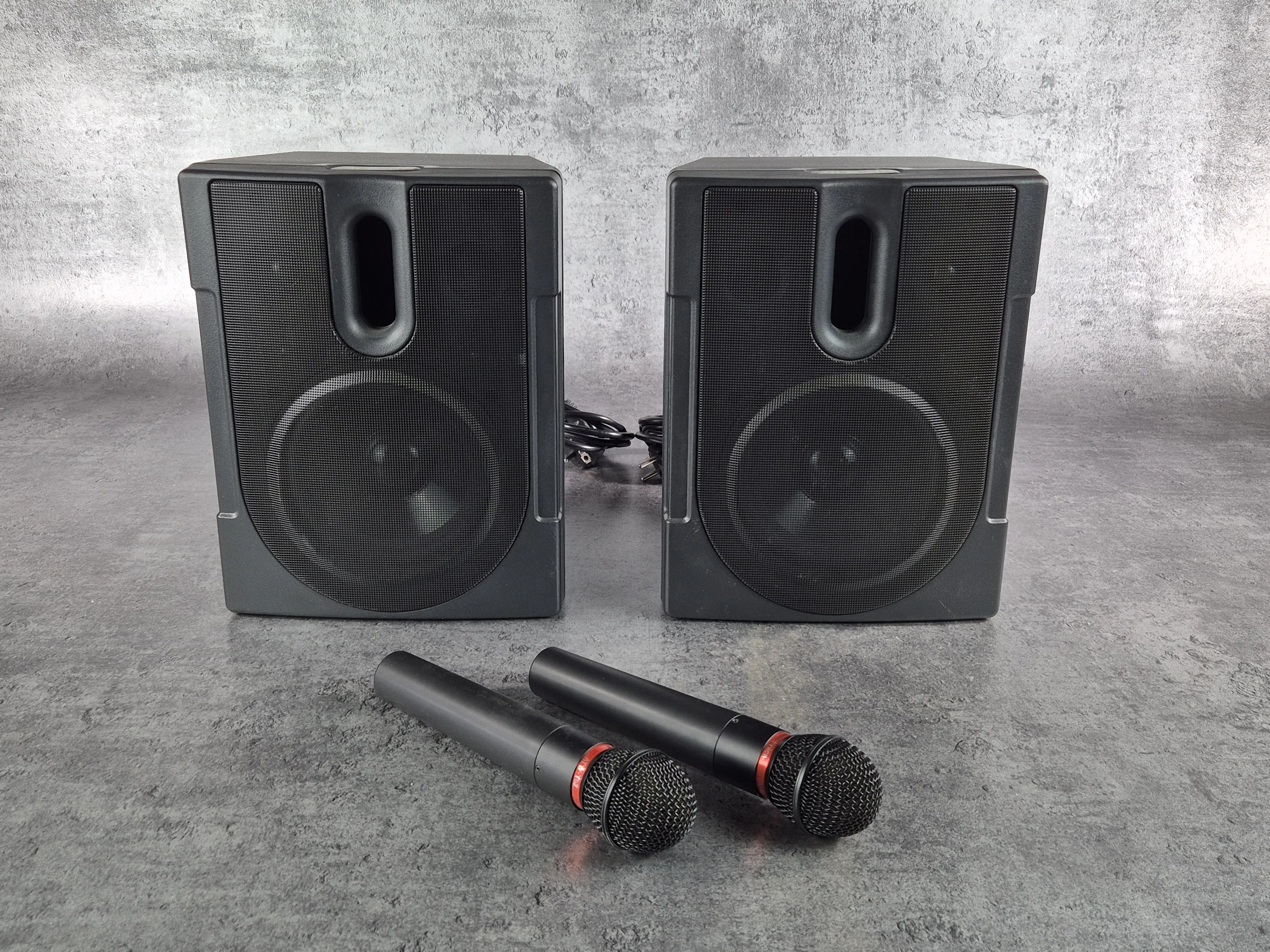 Paret aktiva högtalare samt microfoner, ej funktionstestad.
