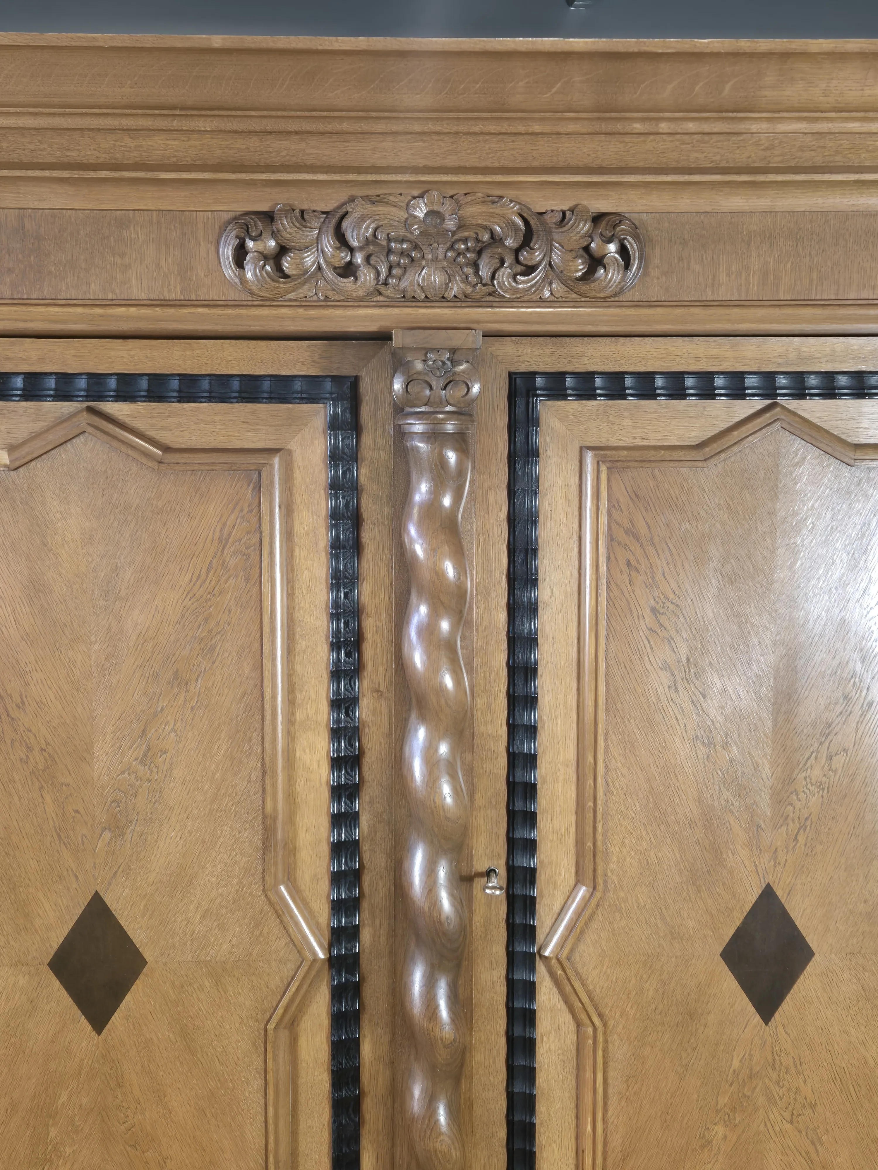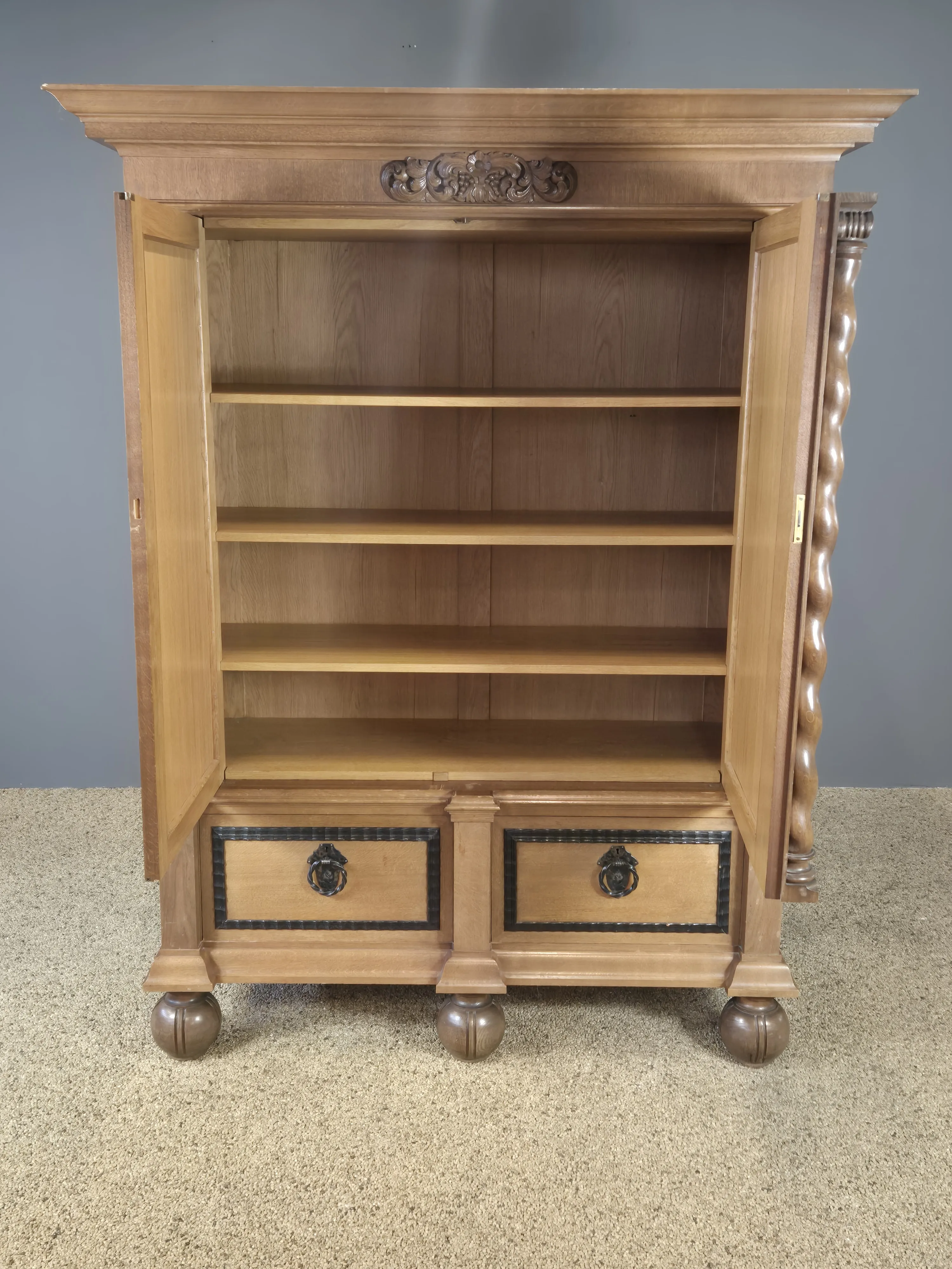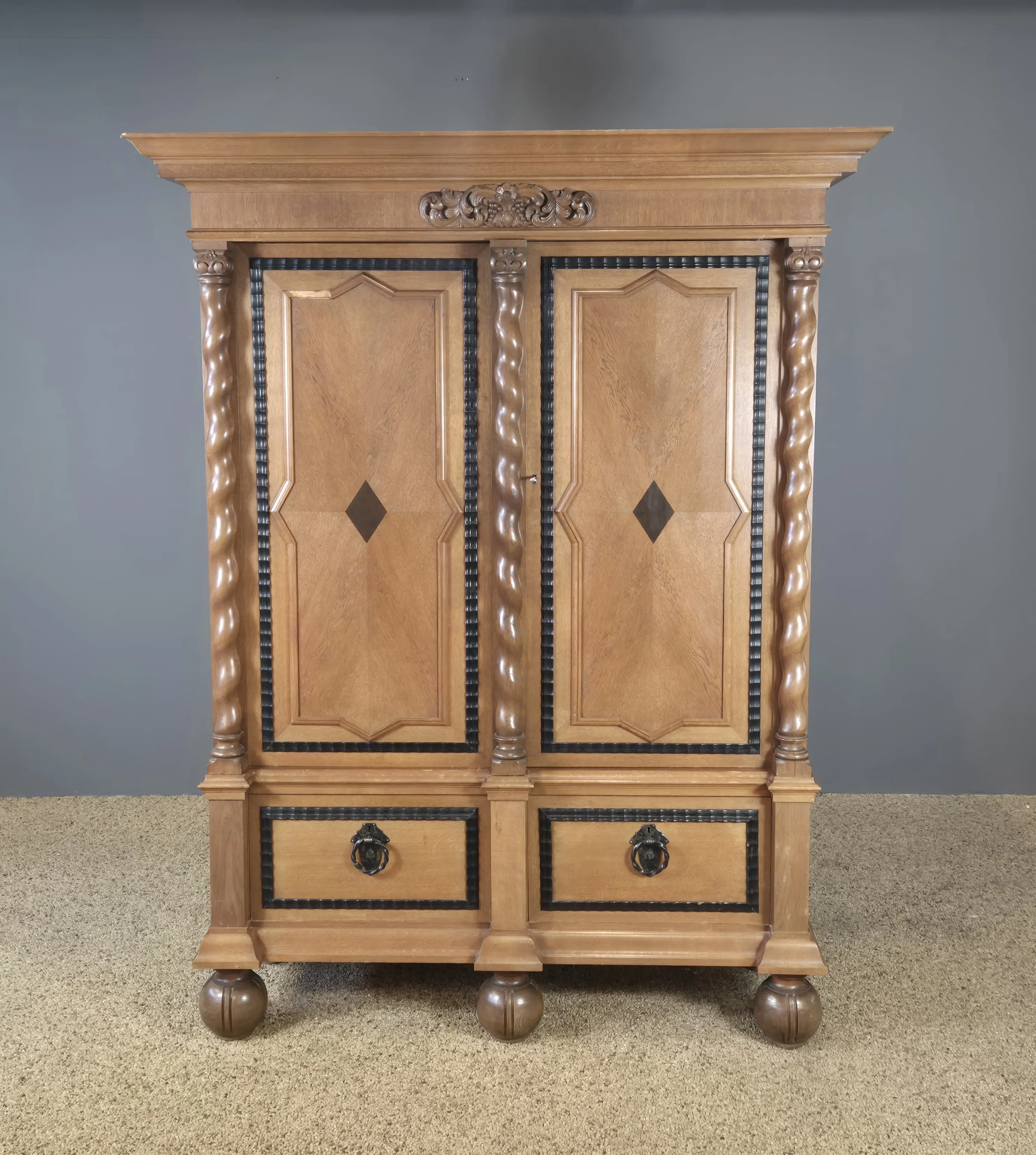 Skåp med klotfötter och svarvade kolonner. En list saknas. En nyckel finns. Bredd:162cm Höjd:209cm Djup:65cm. Åldersslitage