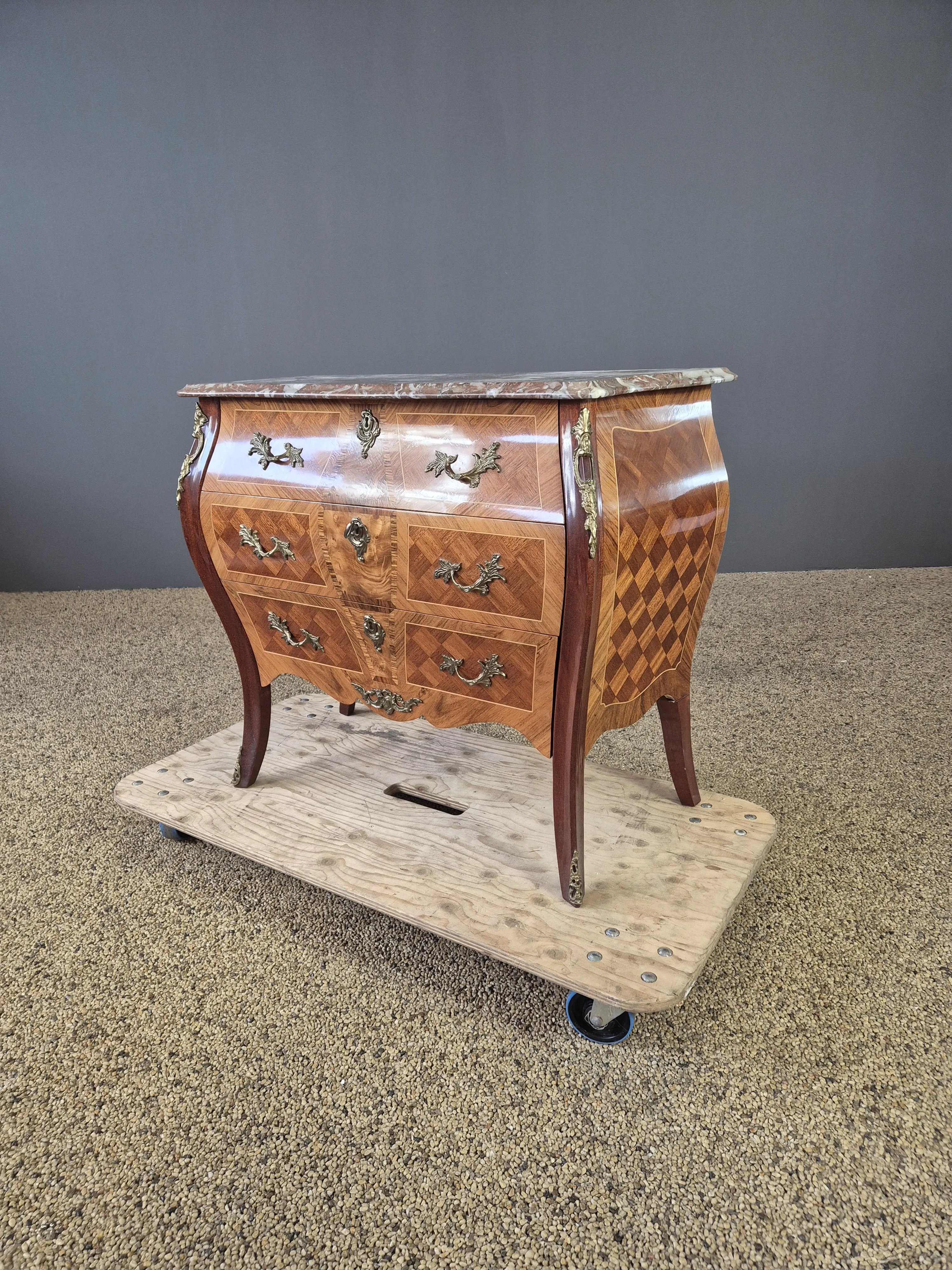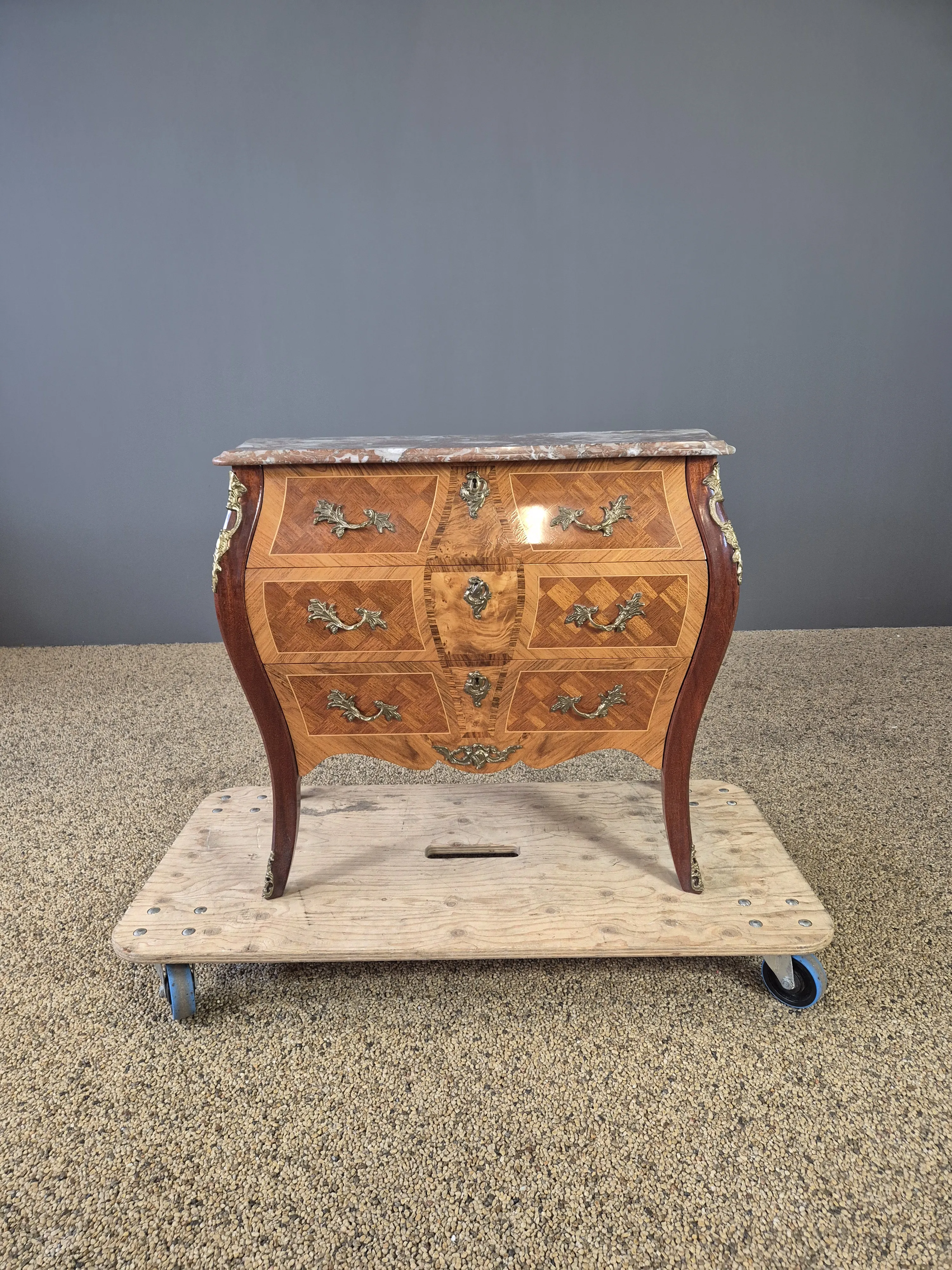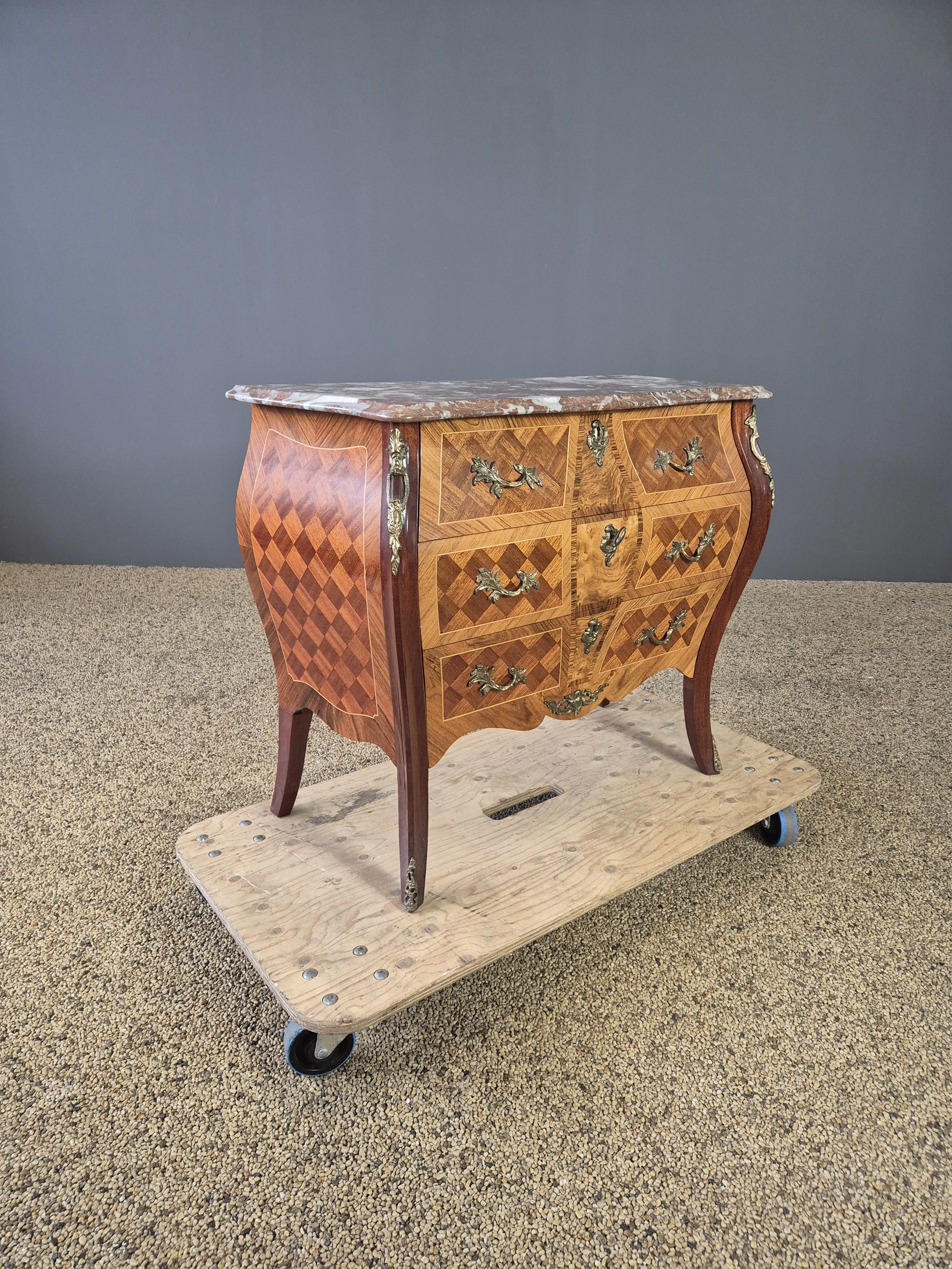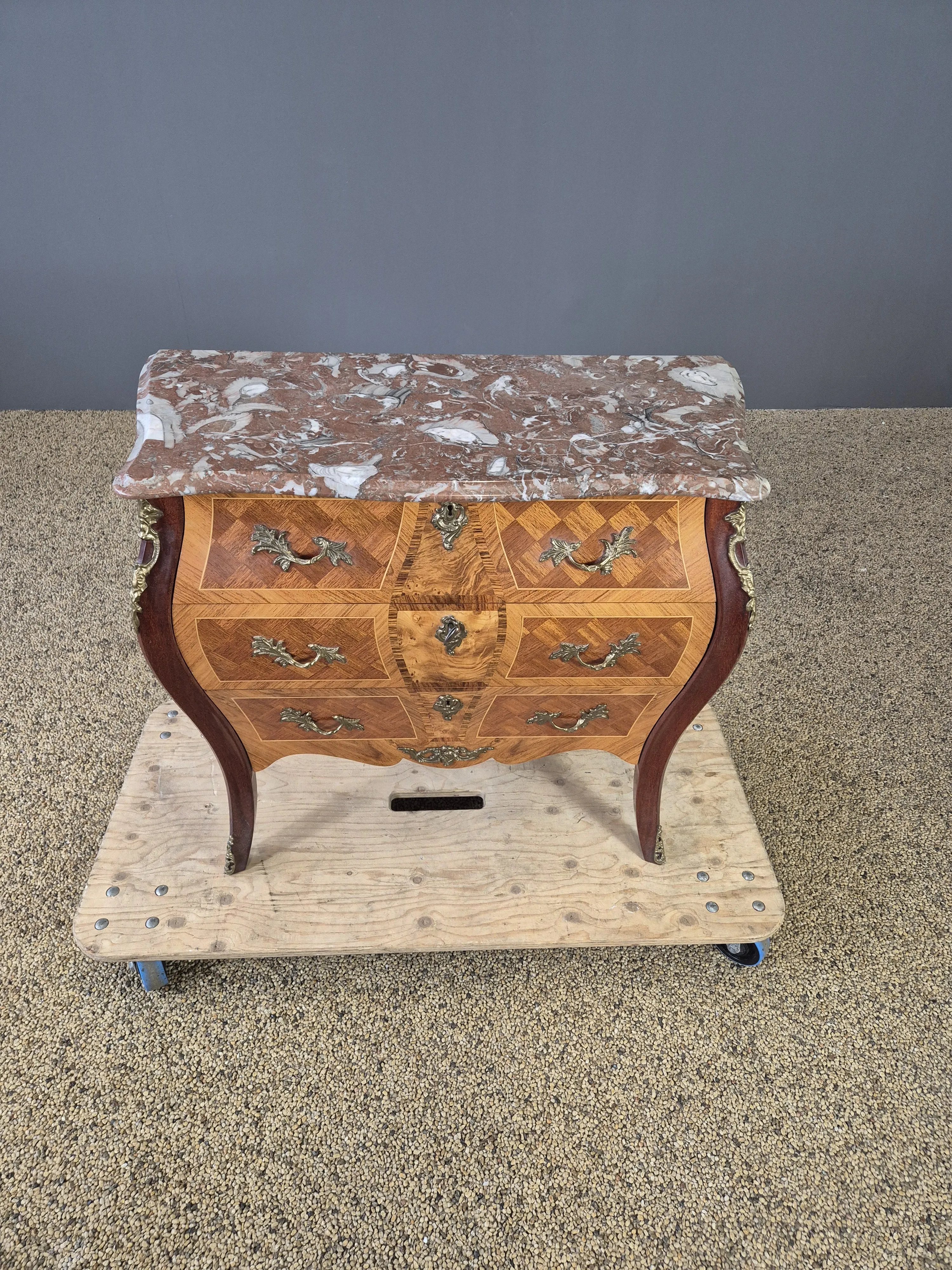 Byrå med marmorskiva och beslag i metall. En nyckel medföljer. Bruksslitage. Höjd:77 cm Bredd: 90cm Djup:43 cm.
