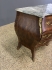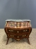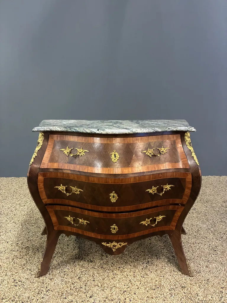 Klassisk modell med grå/grön-melerad stenskiva. Div fanérskador samt åldersslitage. Nyckel saknas Höjd: 81cm, Bredd:102cm Djup:51cm