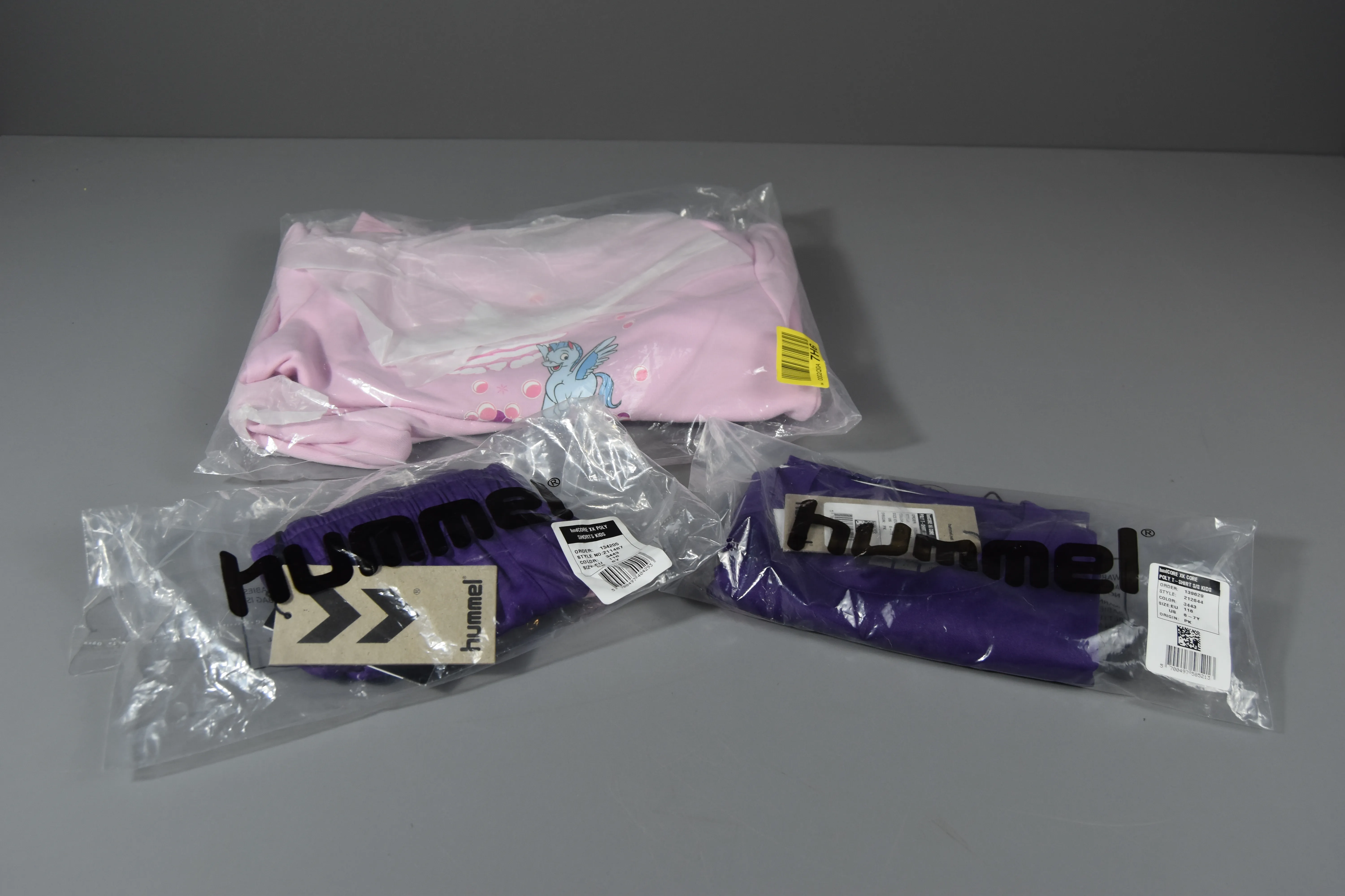 208. Byxor och två t-shirts. Adidas Disney och Hummel. Strl 5-7år.