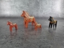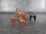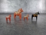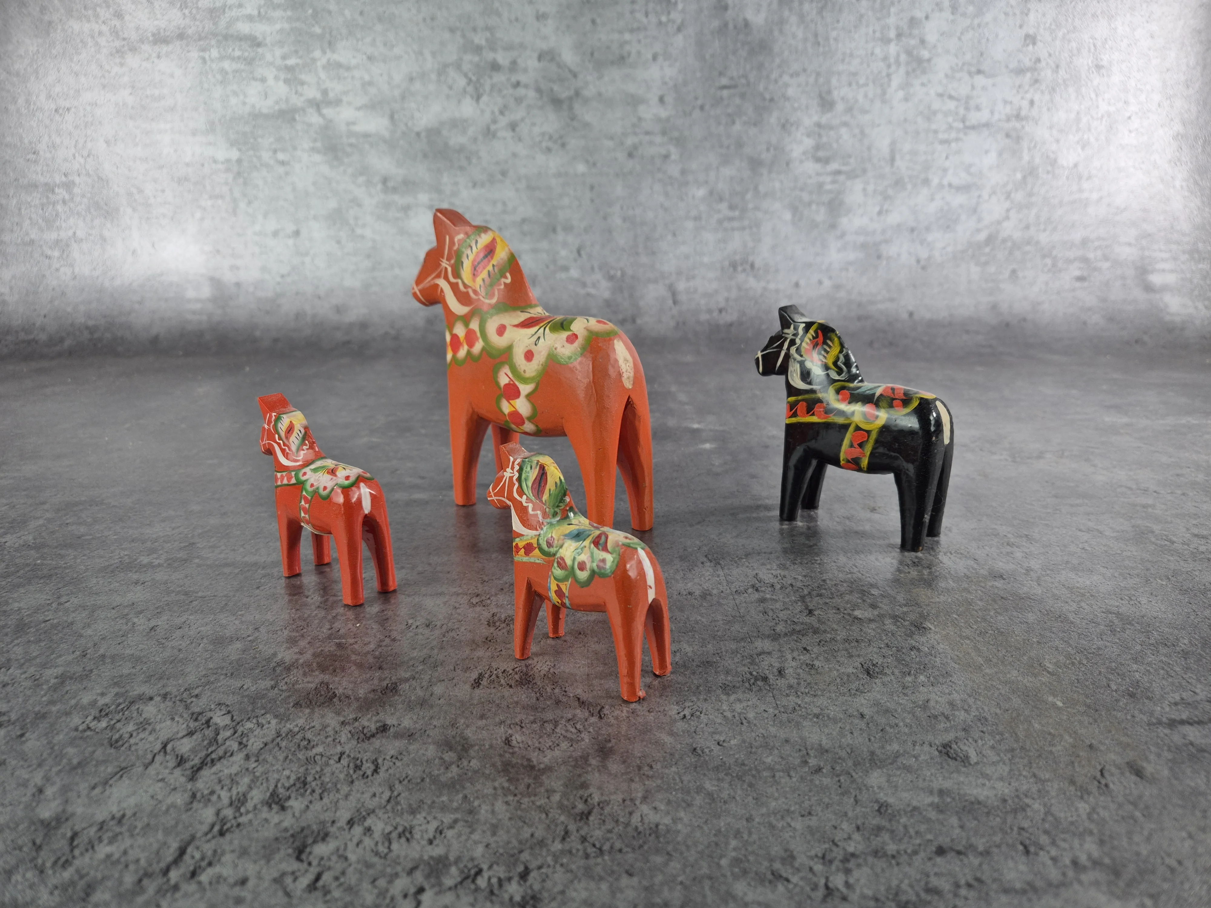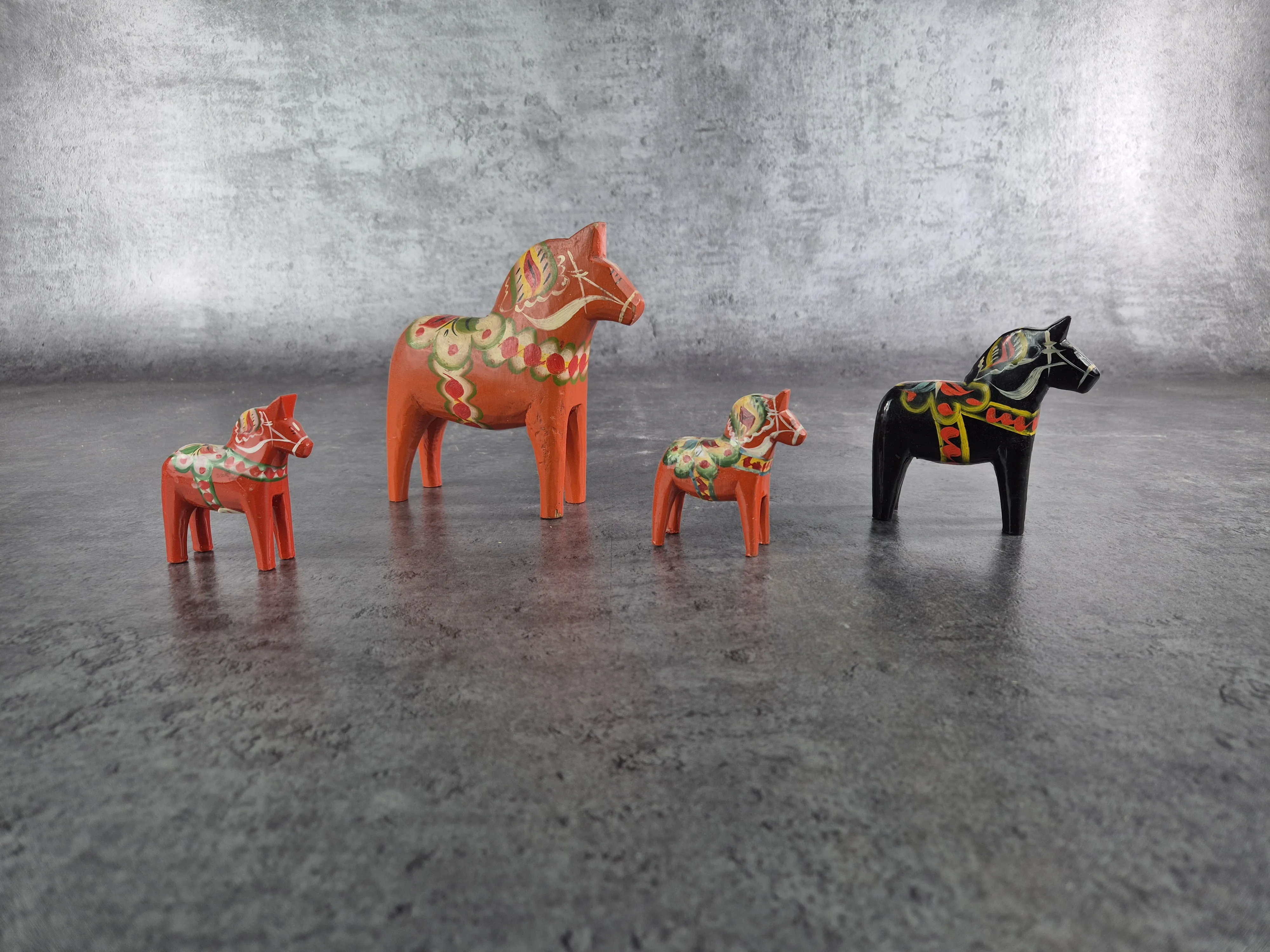 Fyra dalahästar i bemålat trä i varierande storlek. Åldersrelaterat slitage. Den högsta är 15cm. De tre mindre med etikett från Nusnäs G-A Olsson samt Nils Olsson.