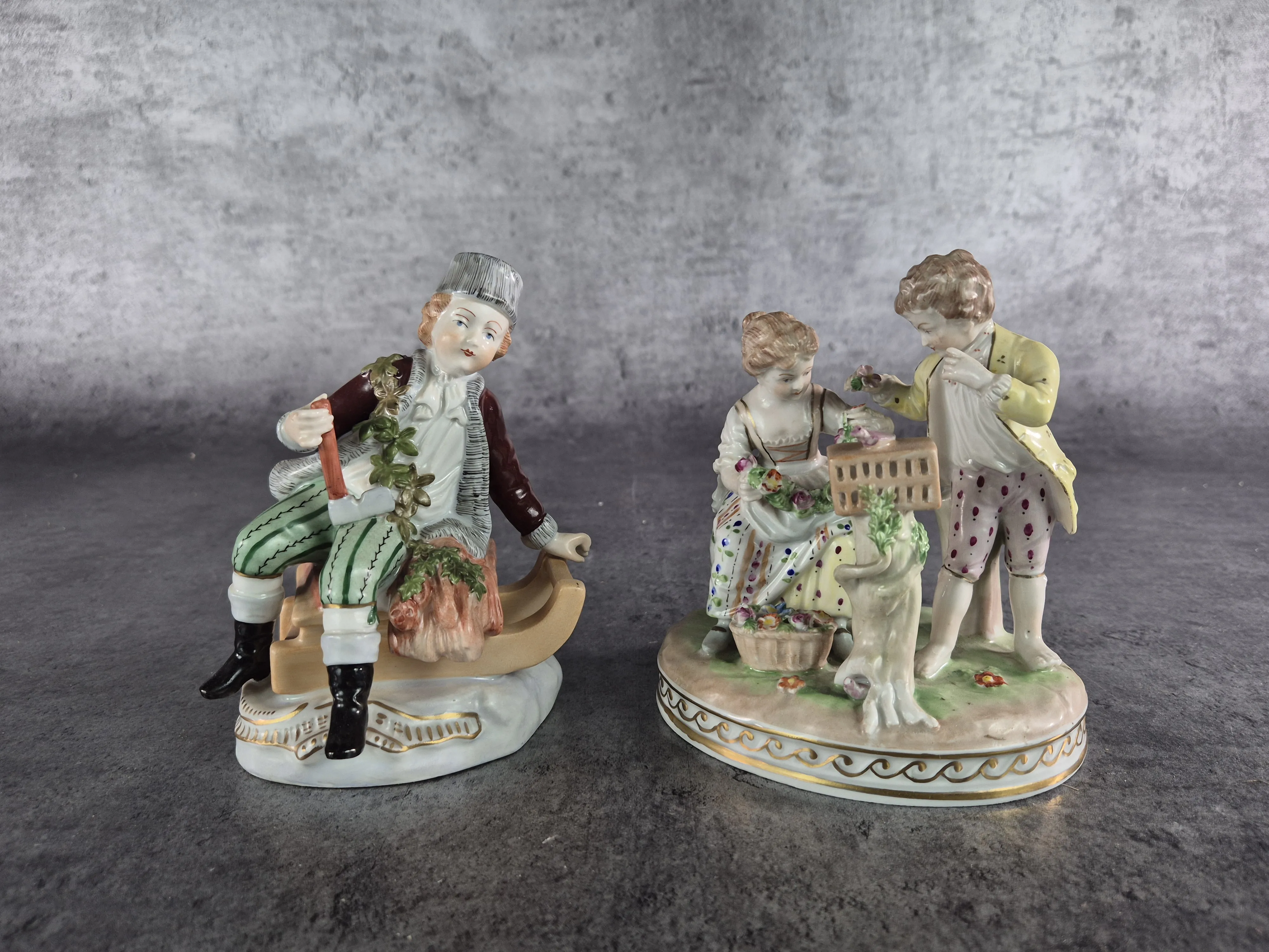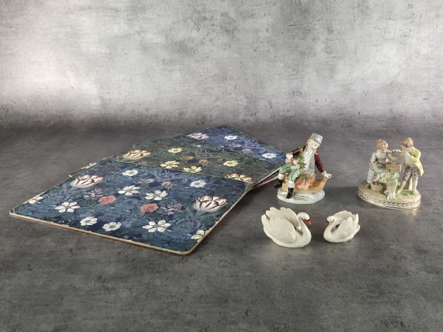 Figuriner, Dresden: Höjd 13cm. Bruksslitage. Bordsunderlägg: märken, slitage.