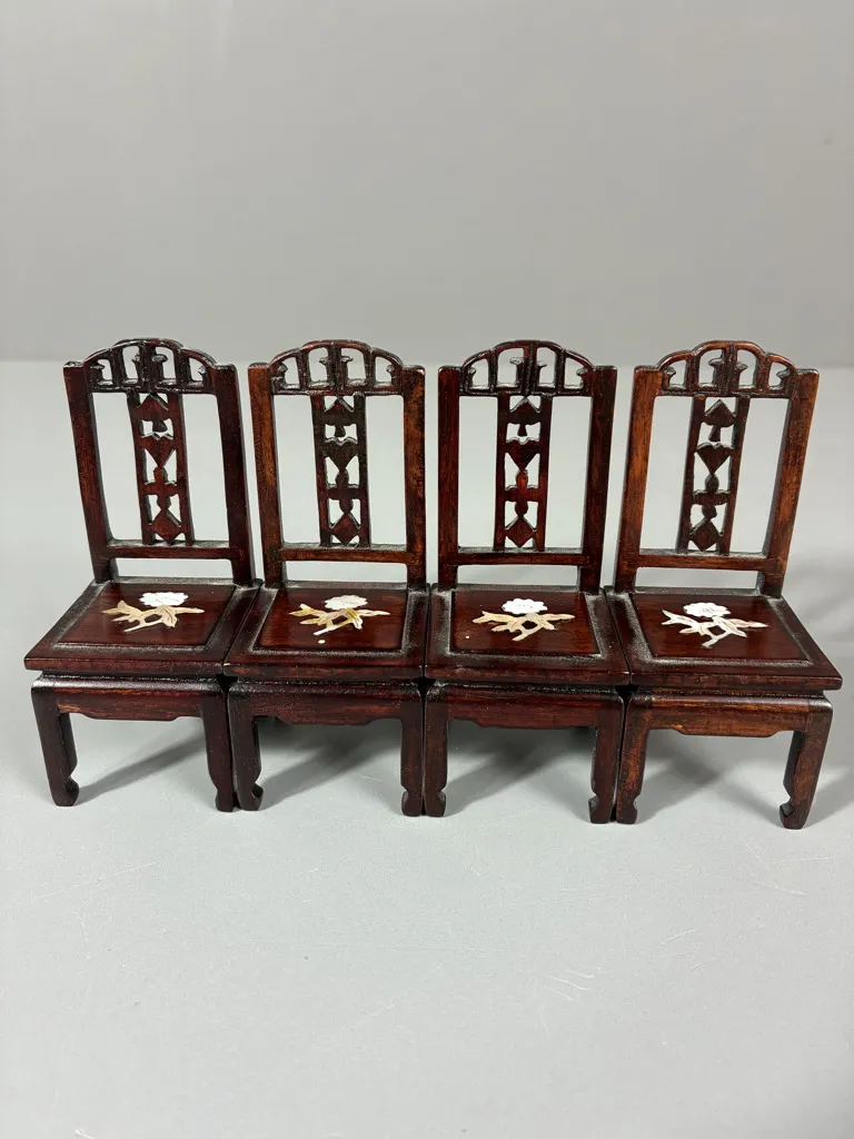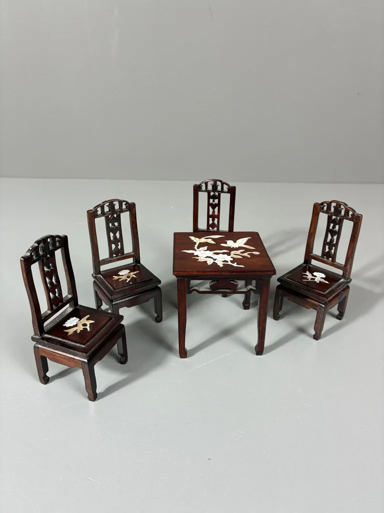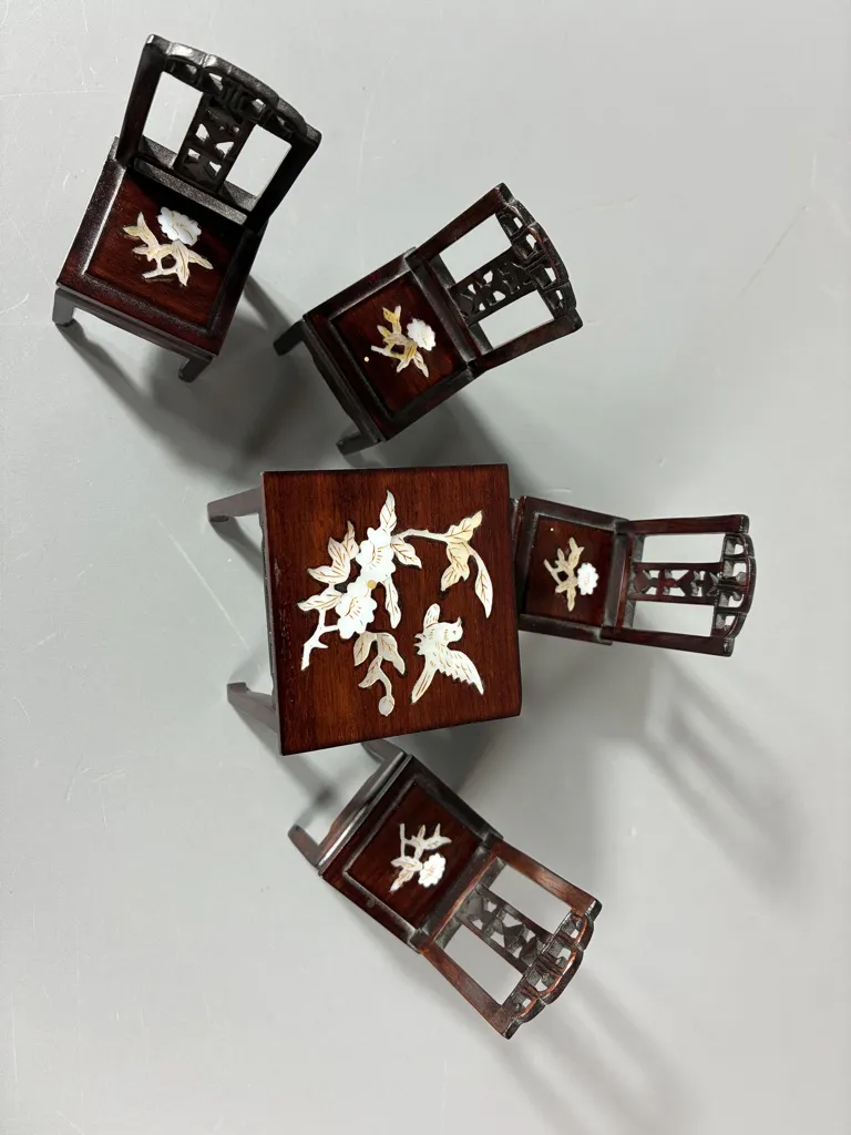 Möbelgrupp i asiatisk stil. Inläggningar med pärlemoreffekt. Höjd på bordet cm 7cm.