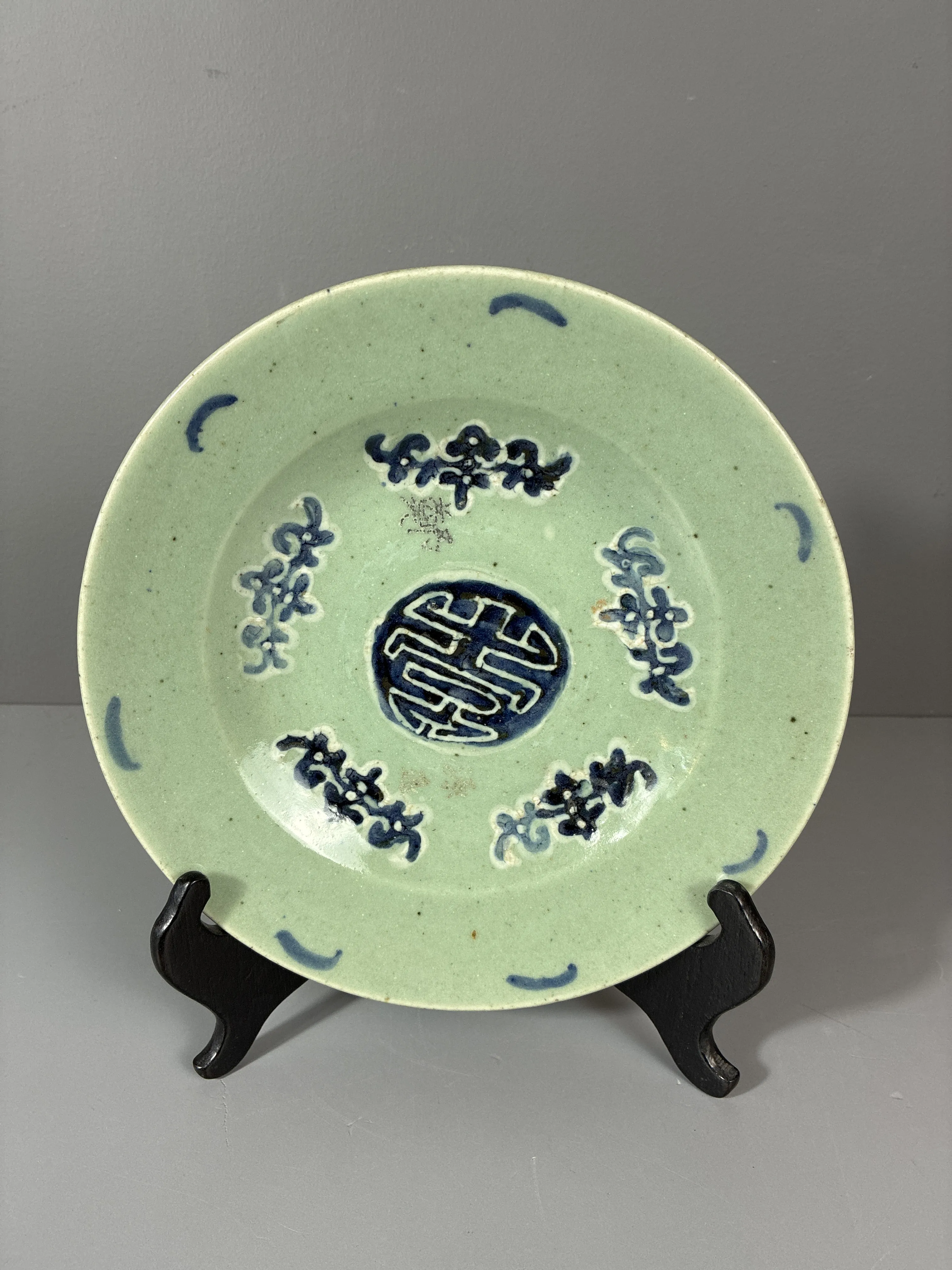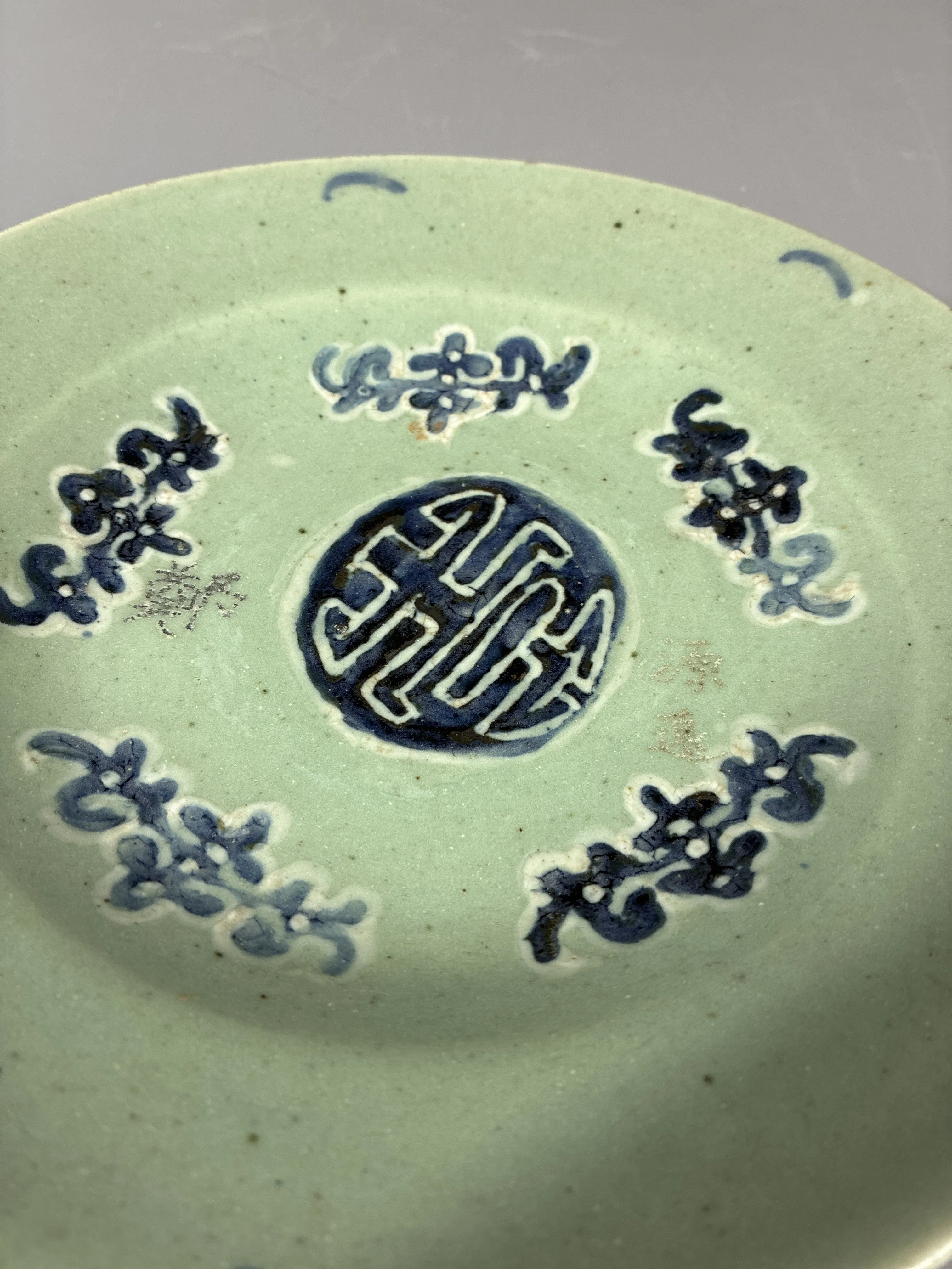Dekor med fem stiliserade fladdermöss. Åldersslitage. 23,5 cm i diameter.
