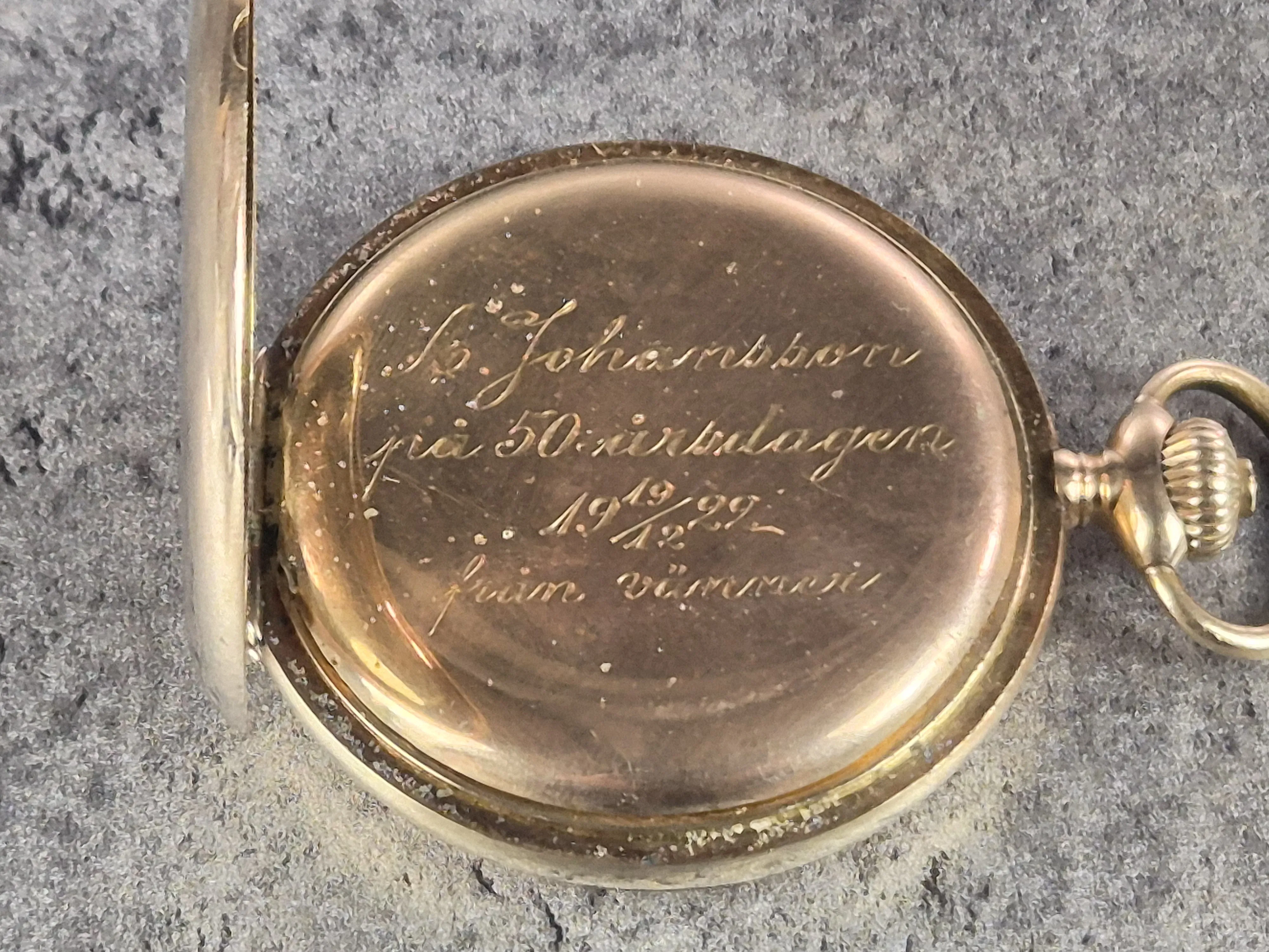 Graverad på innerboett. Innerboett ej guld. Totalvikt: 94,3g.