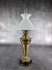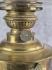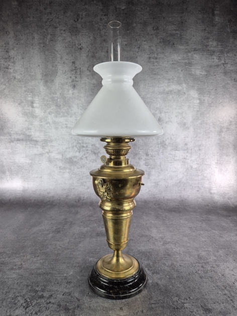 Fungerande och vacker lampa med fot i mässing på en platå av marmorerad sten. Dekor med maskaron. Höjd:64cm.