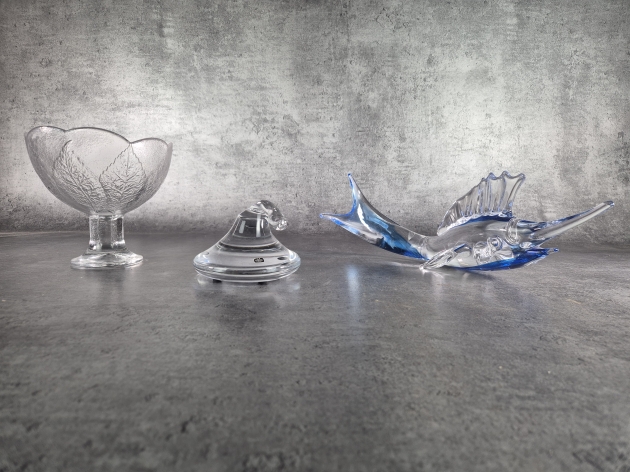 Glasföremål. Bl.a. Vas Vitreum Vadstena.