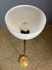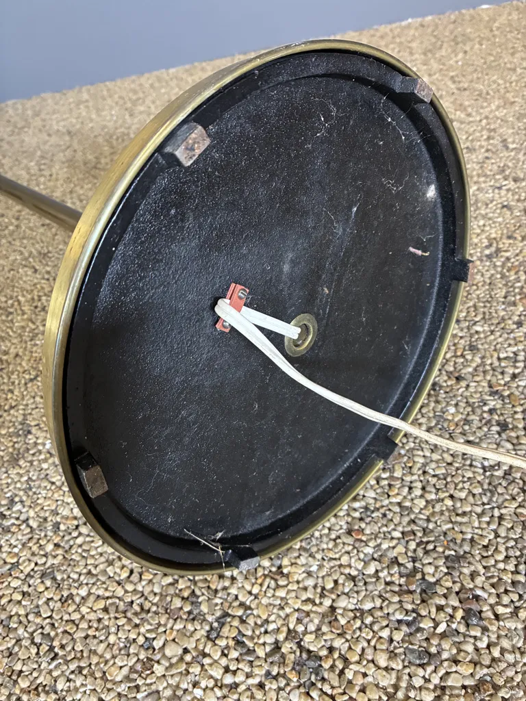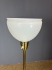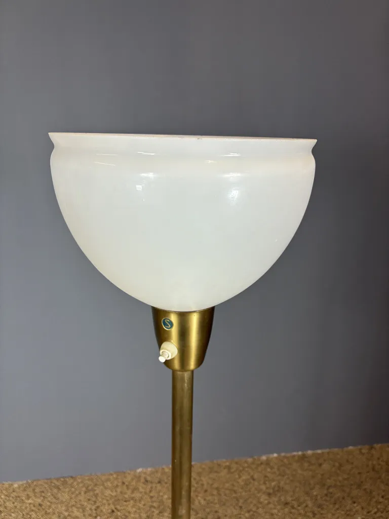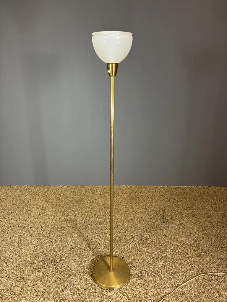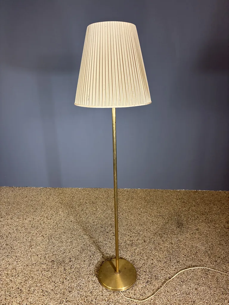 Lampa med mässing samt kupa i glas och klädd lampskärm. Smutsig samt åldersslitage. Höjd: 168cm