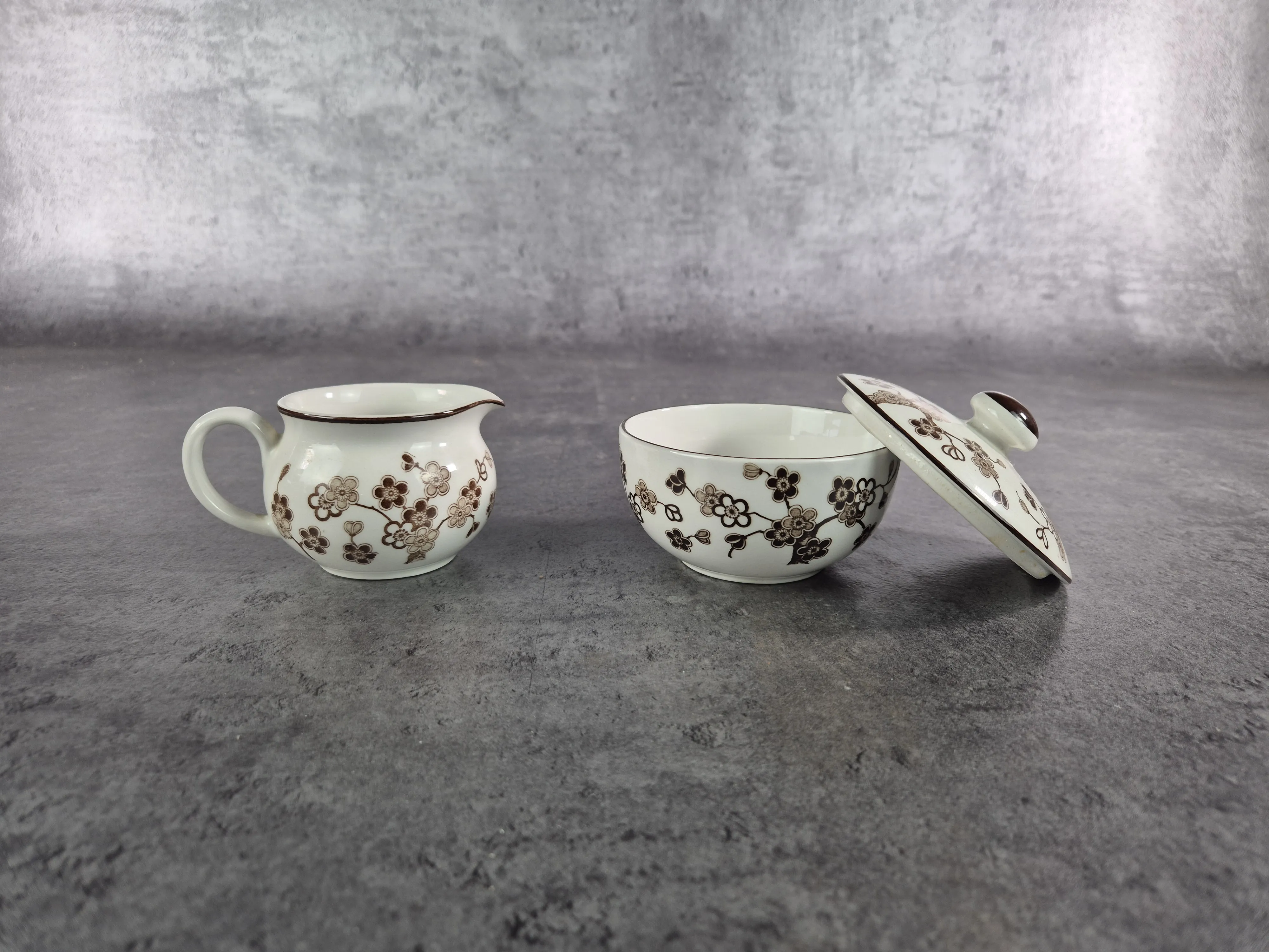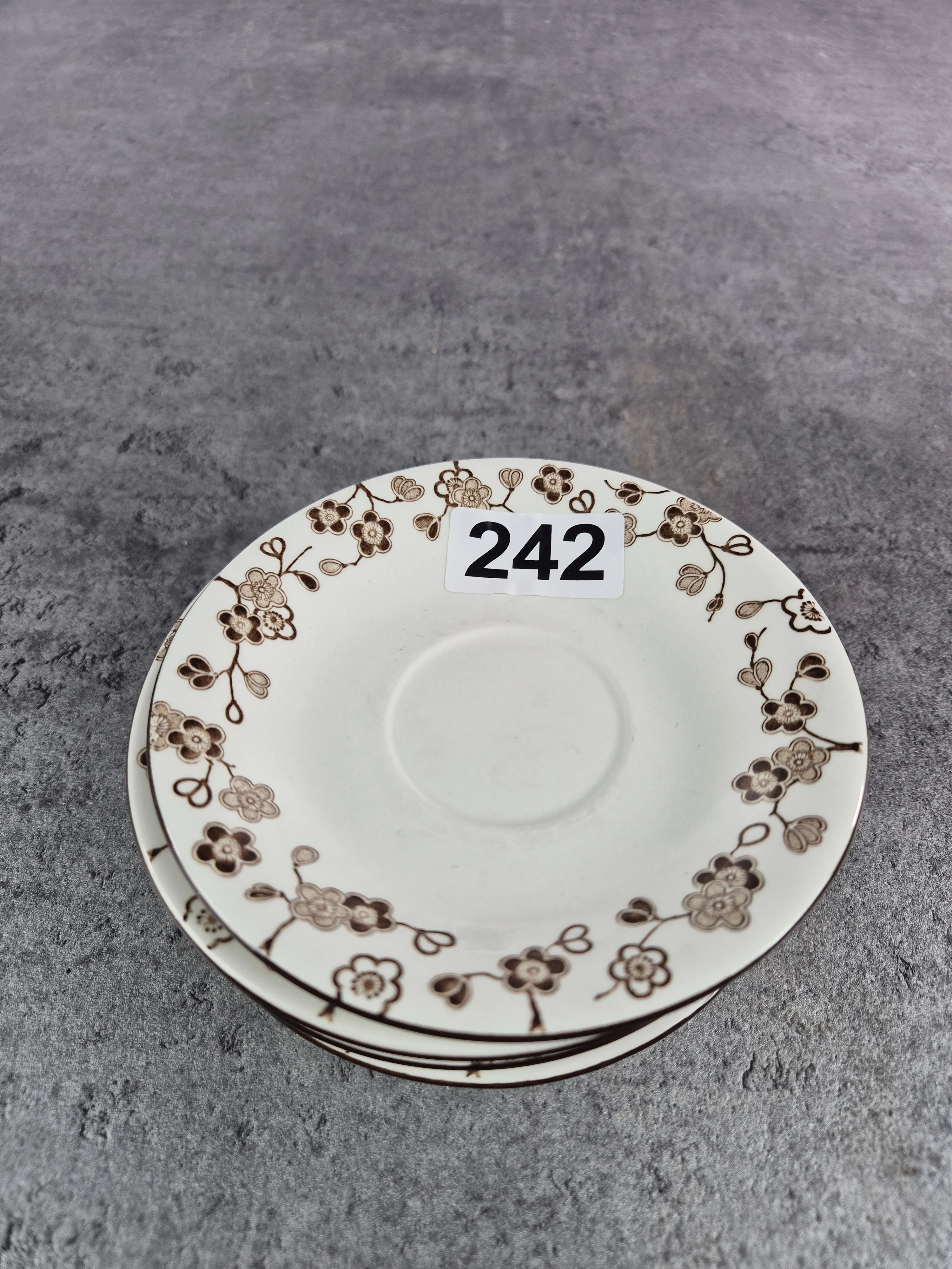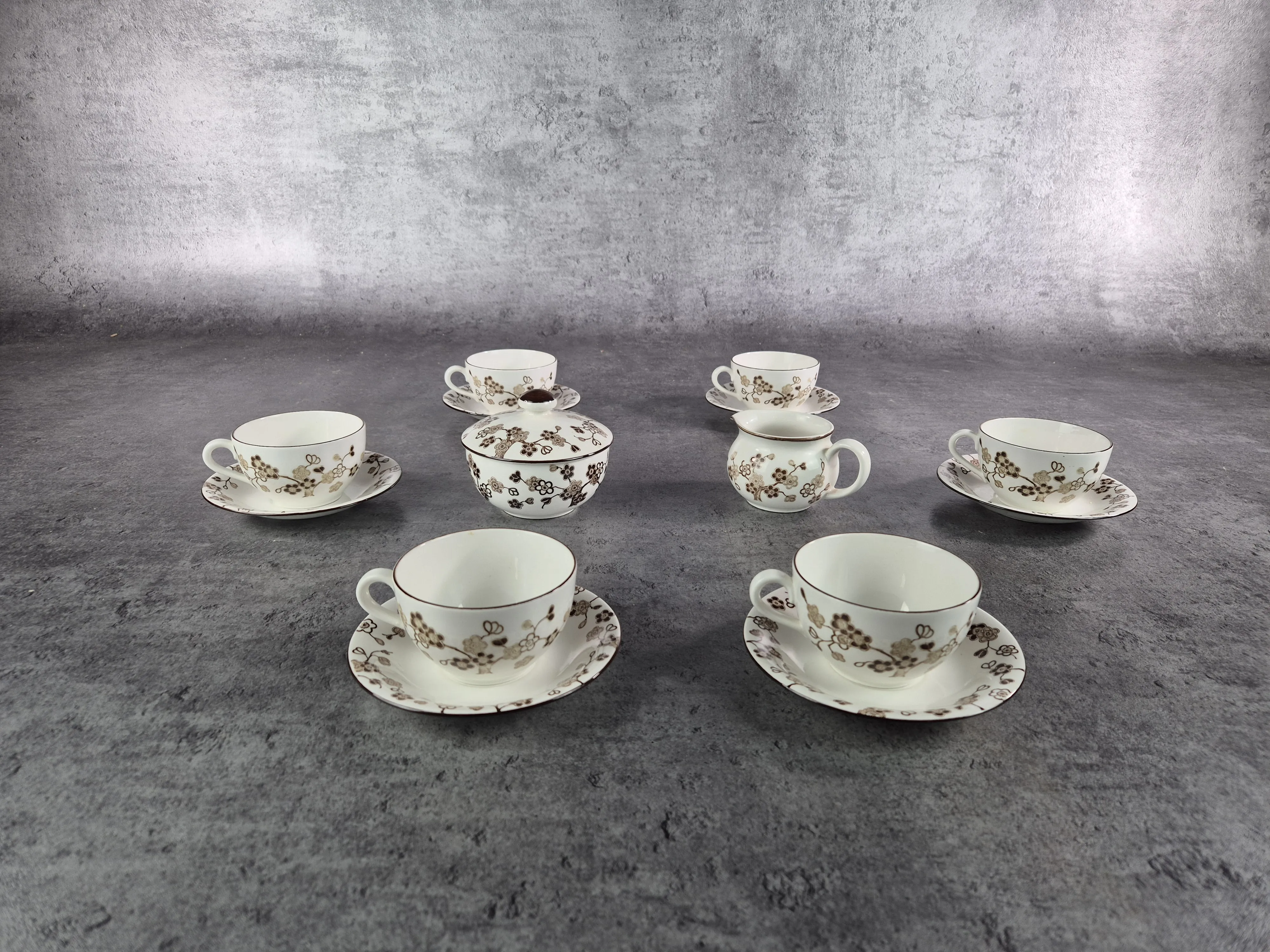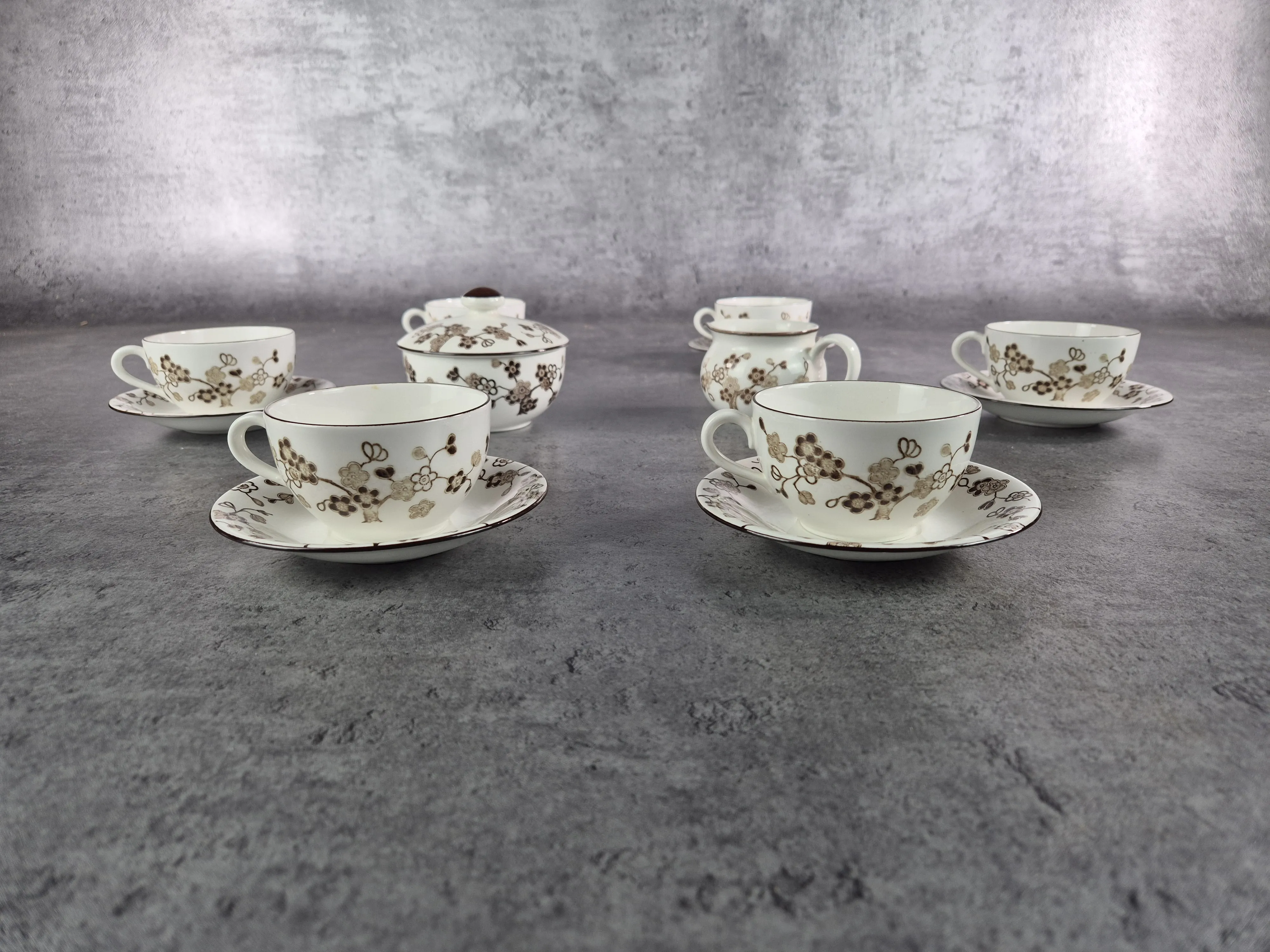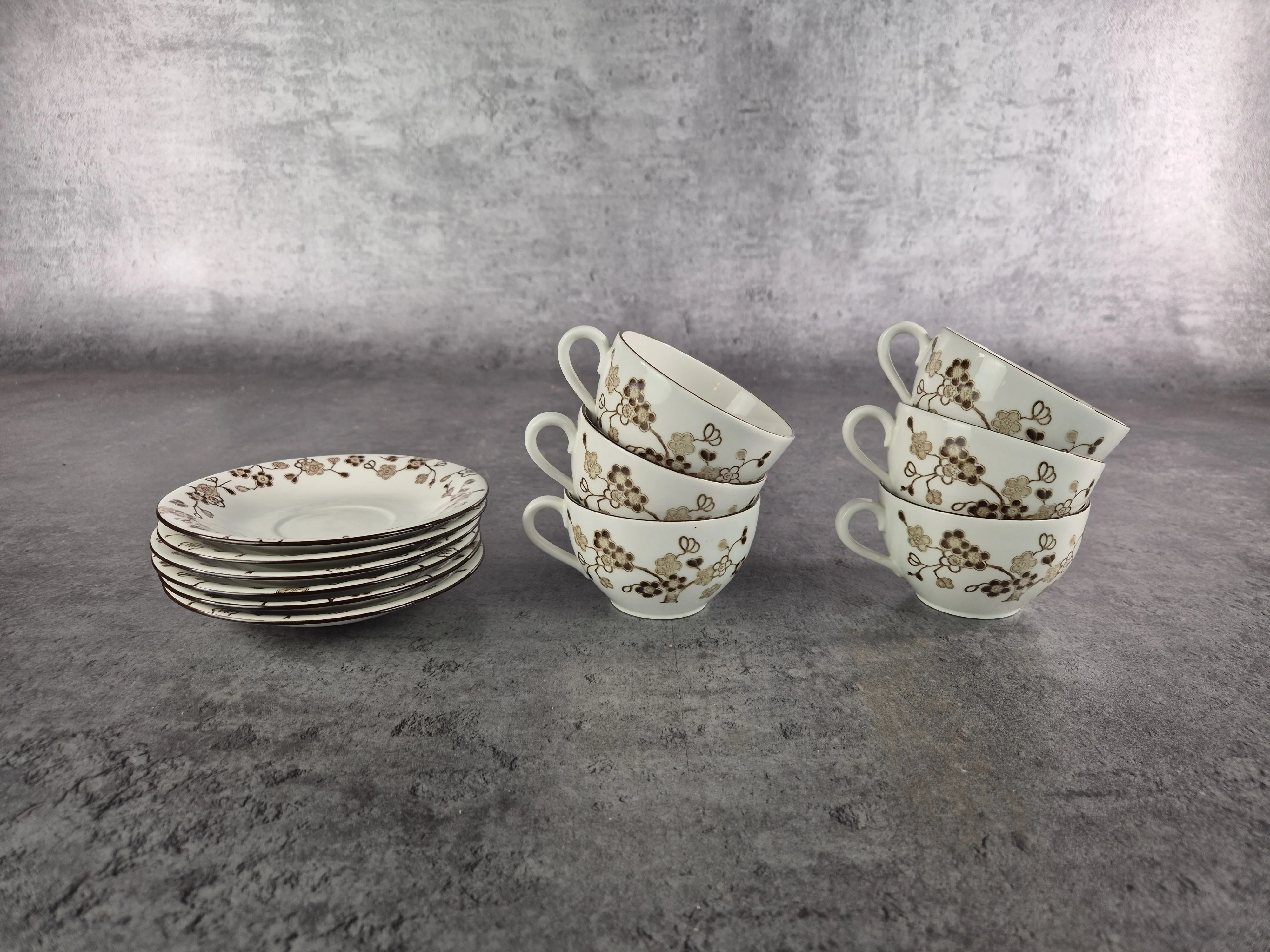 Parti kaffekoppar med fat i porslin, modellen Japonica från Rörstrand. Bruksslitage.