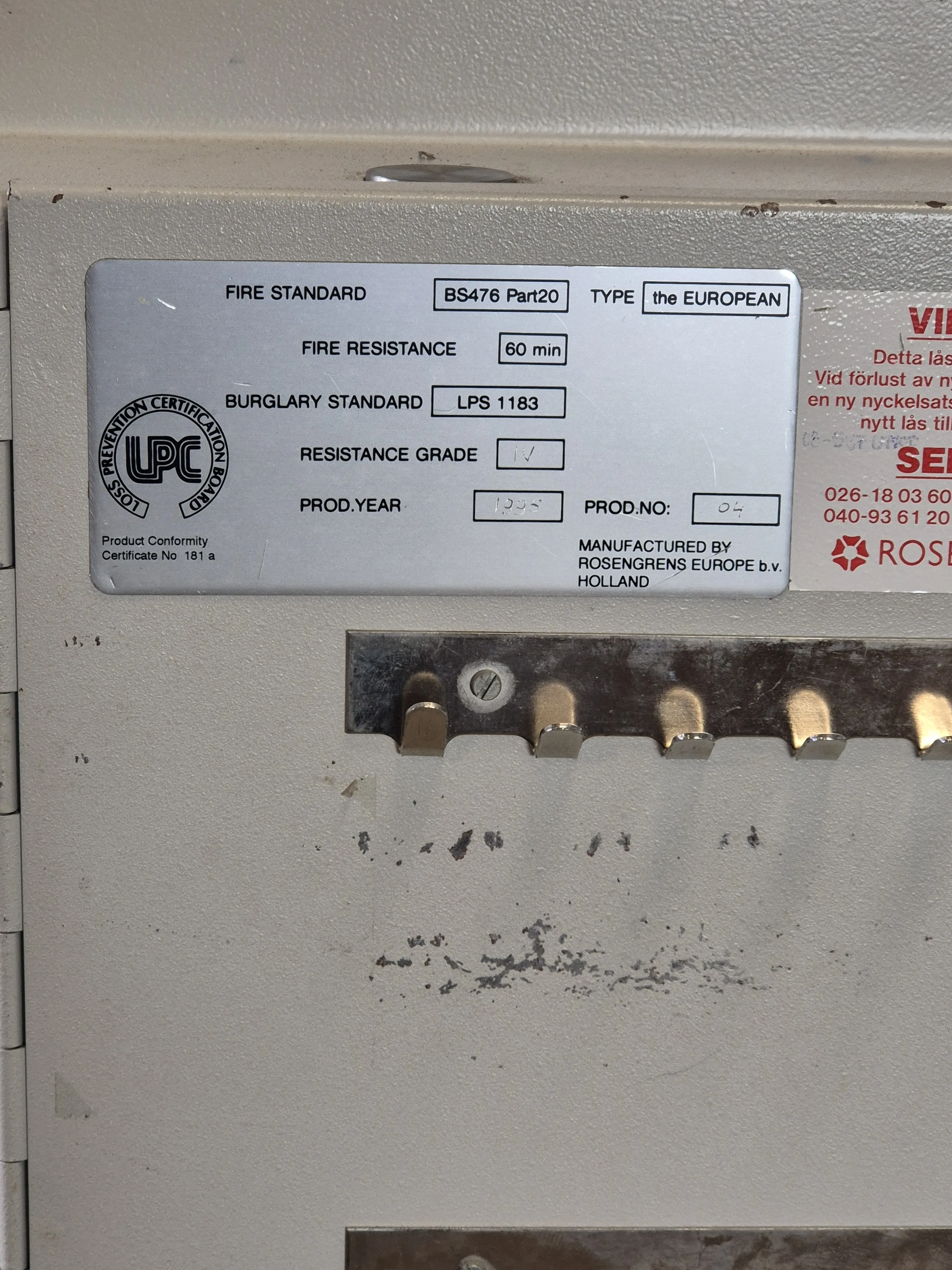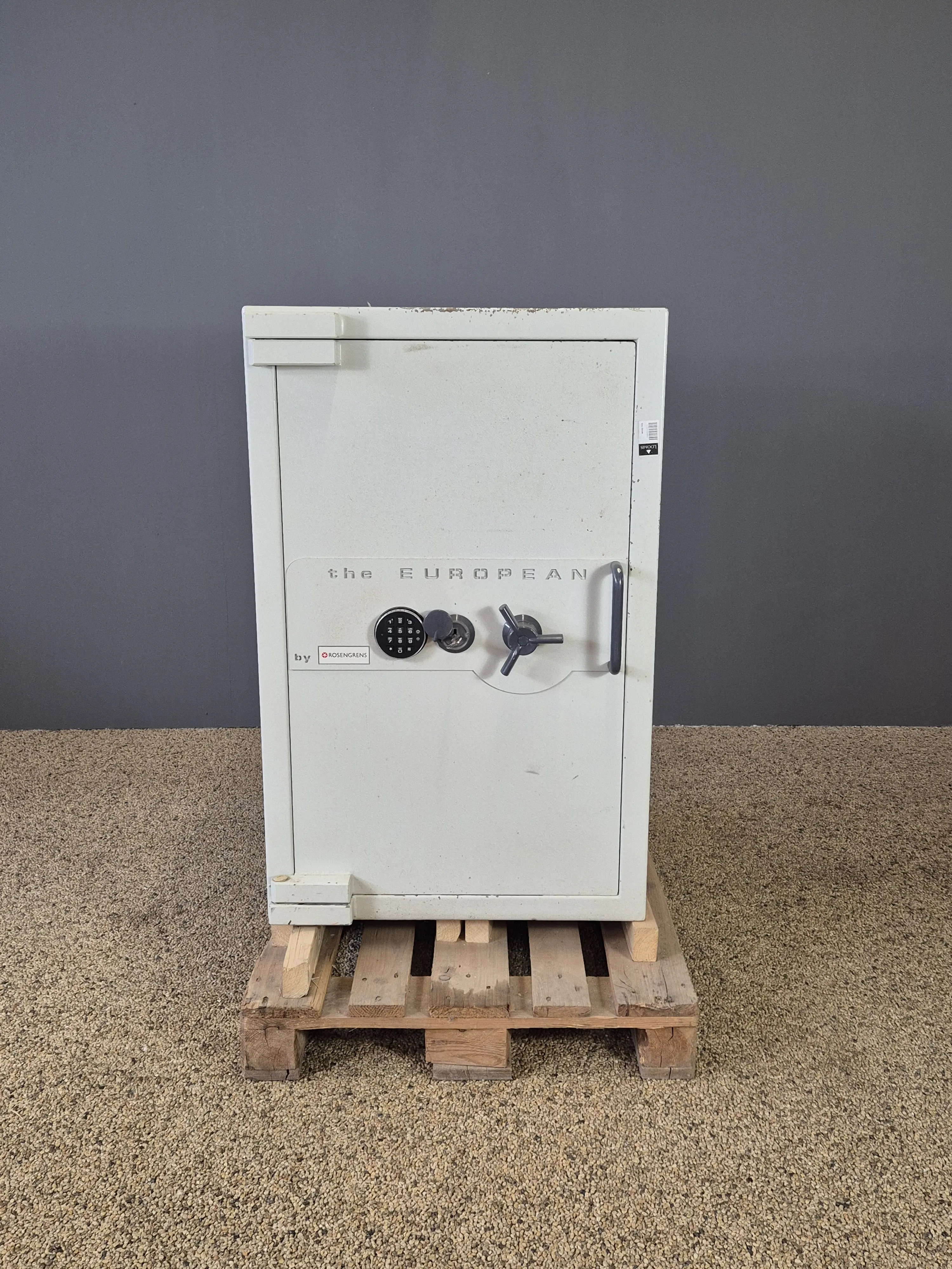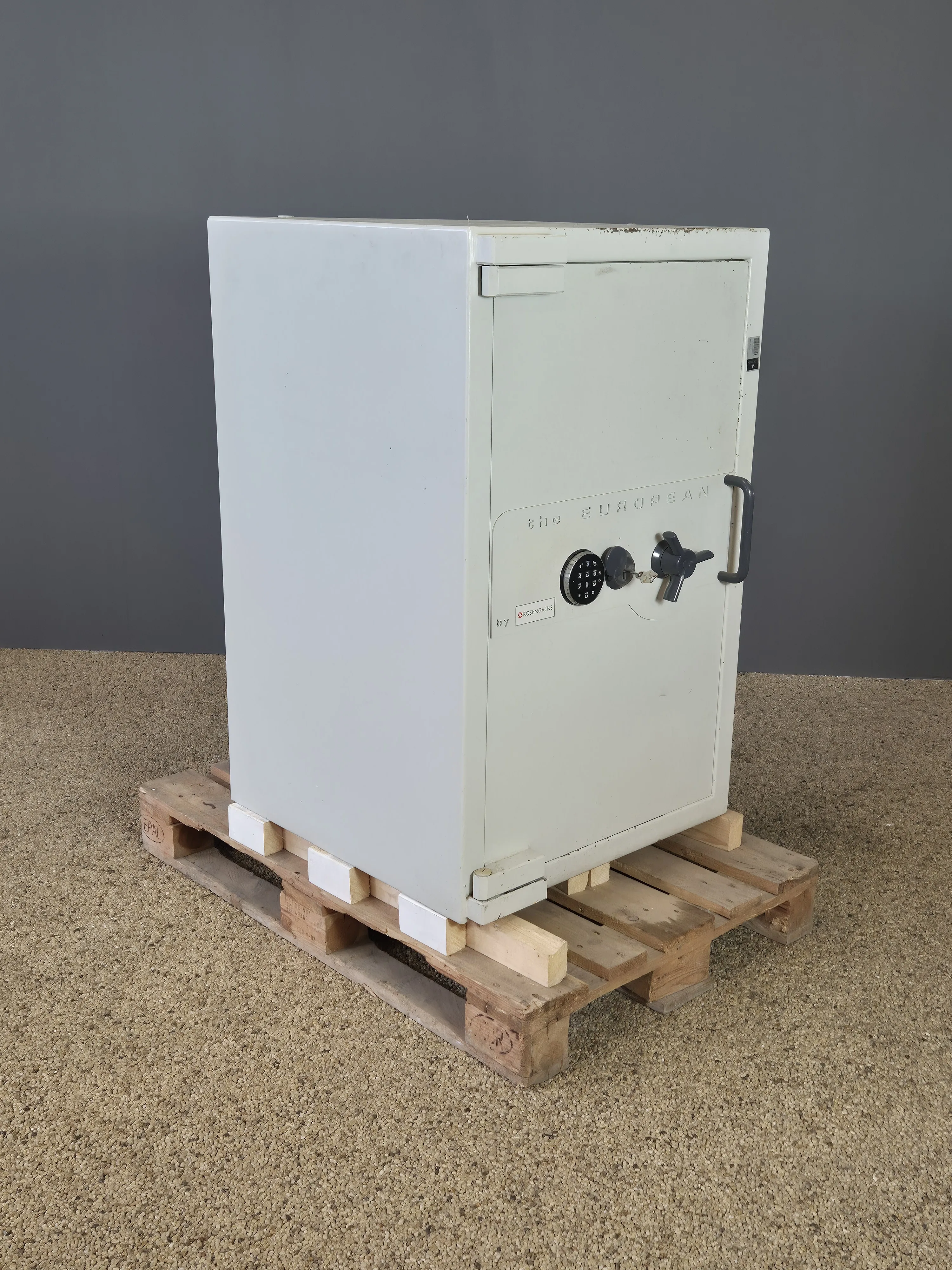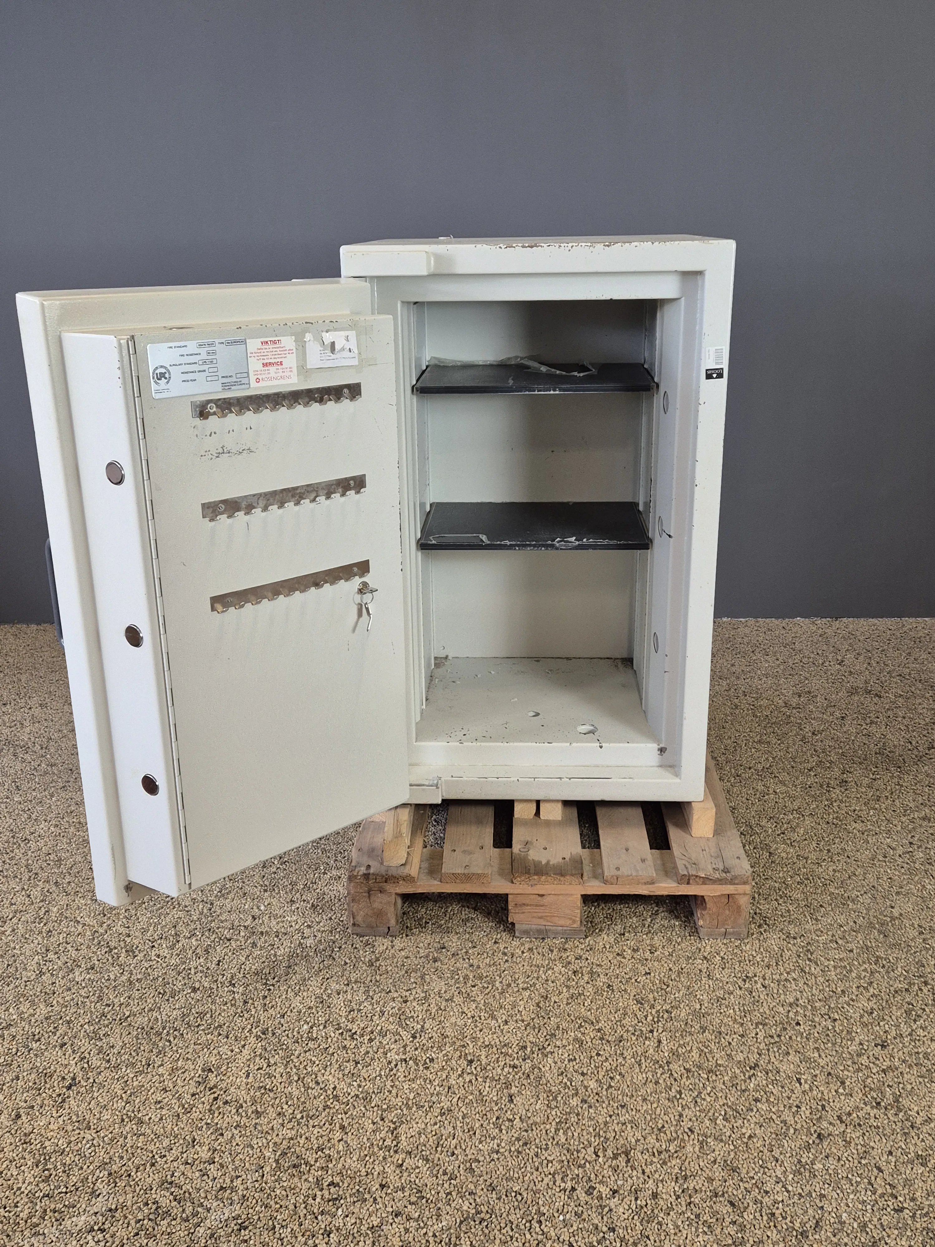 Brandsäkert 60min. En nyckel finns, kod saknas. Höjd:110 cm Bredd:70 cm Djup: 70 cm. Vikt: tungt men står på pall.