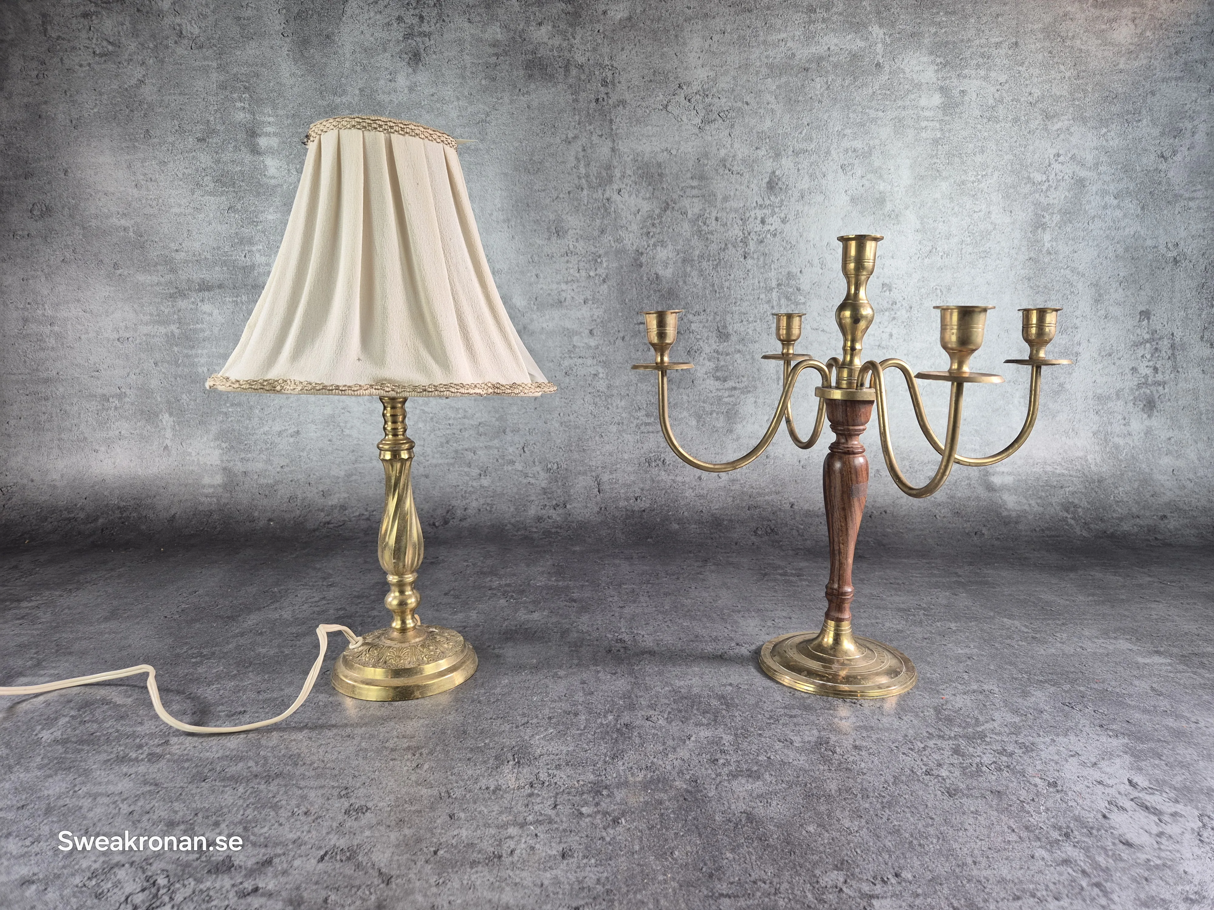 Kandelaber: Höjd 35cm. Bordslampa ej funktionstestad. Bruksslitage.