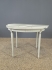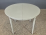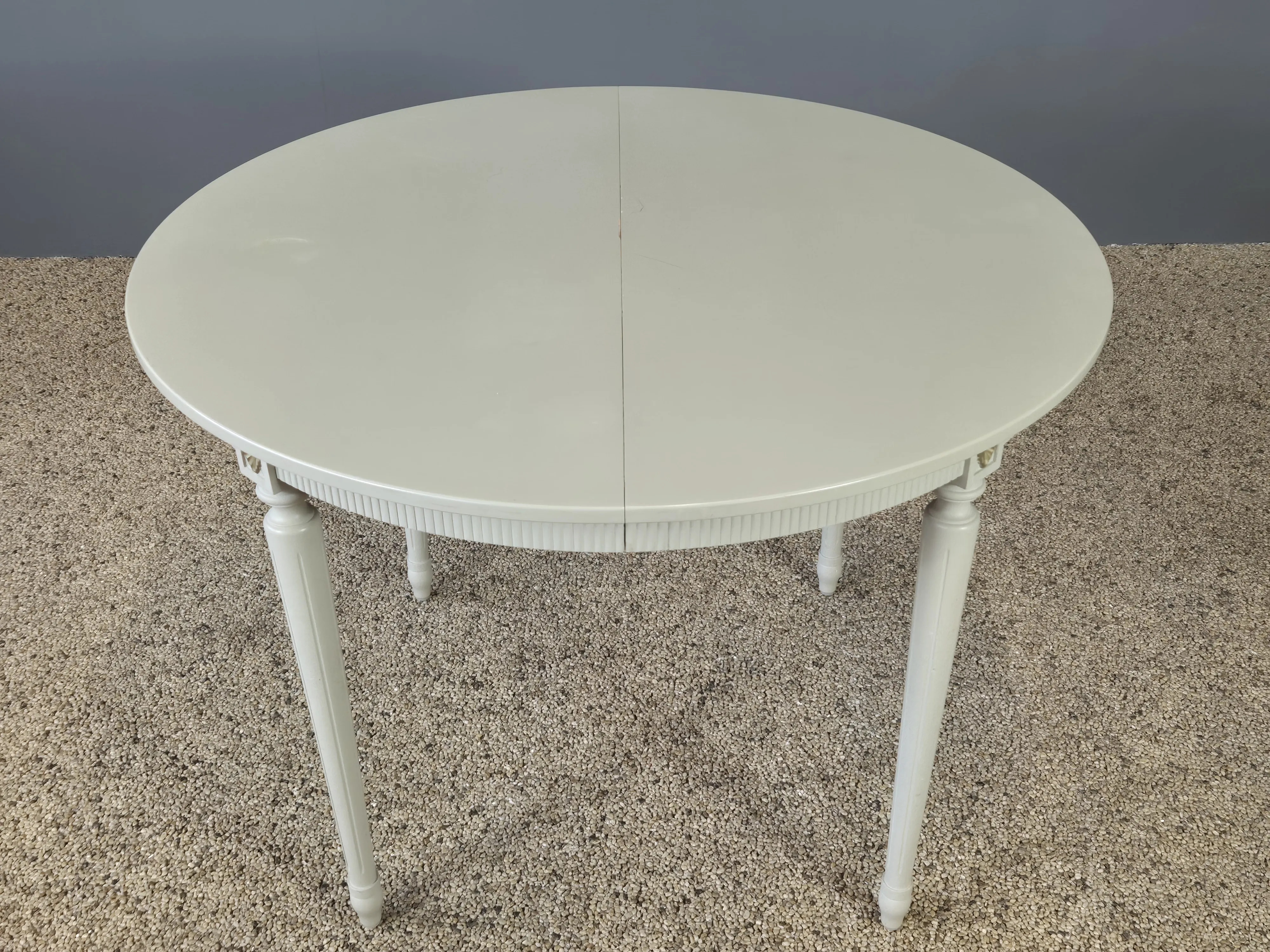Matbord i grå kulör med fyra stolar. Längd 104 cm samt två iläggsskivor om 34 cm vardera. Bruksslitage.
