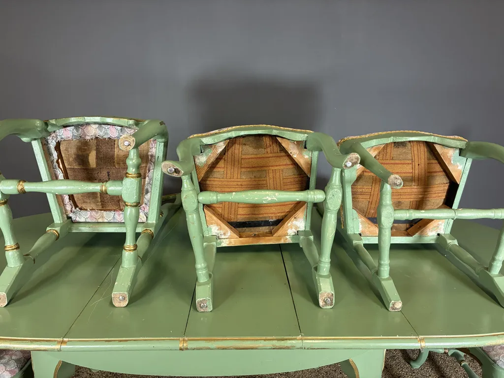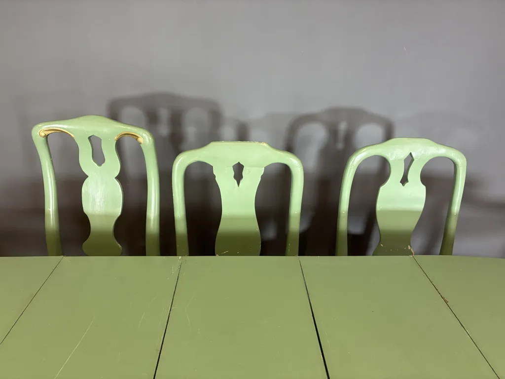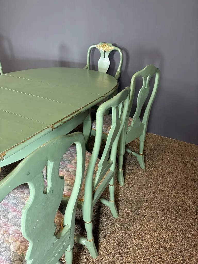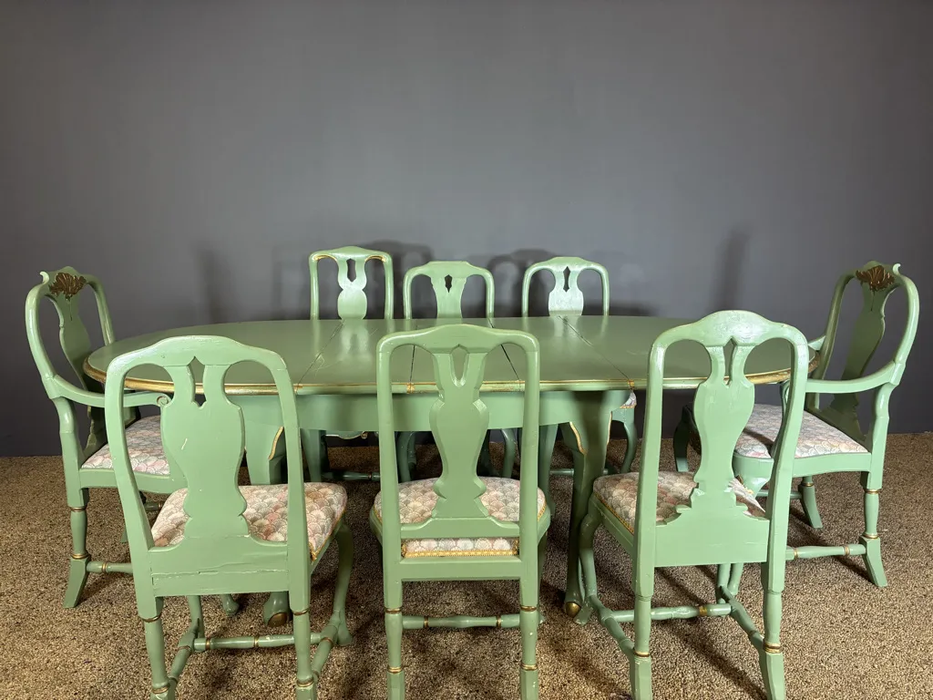 Grönmålat med guldmålade detaljer. 8st stolar varav två karmstolar. Stolarna är snarlika och 1700-tal samt senare kopior. Bordet har tre iläggsskivor om en storlek av 28,5cm vardera. Bord utan iläggsskivor är 144cm långt. Bredd:105cm. Div färgsläpp samt bruksslitage.