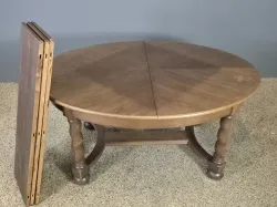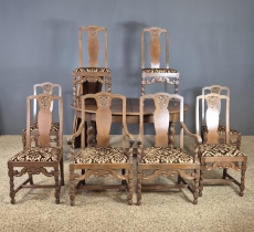 Bord 158cm som med tre iläggsskivor blir 263cm, bredd:118cm. Samt 8st stolar varav två med karm. Bruksslitage.