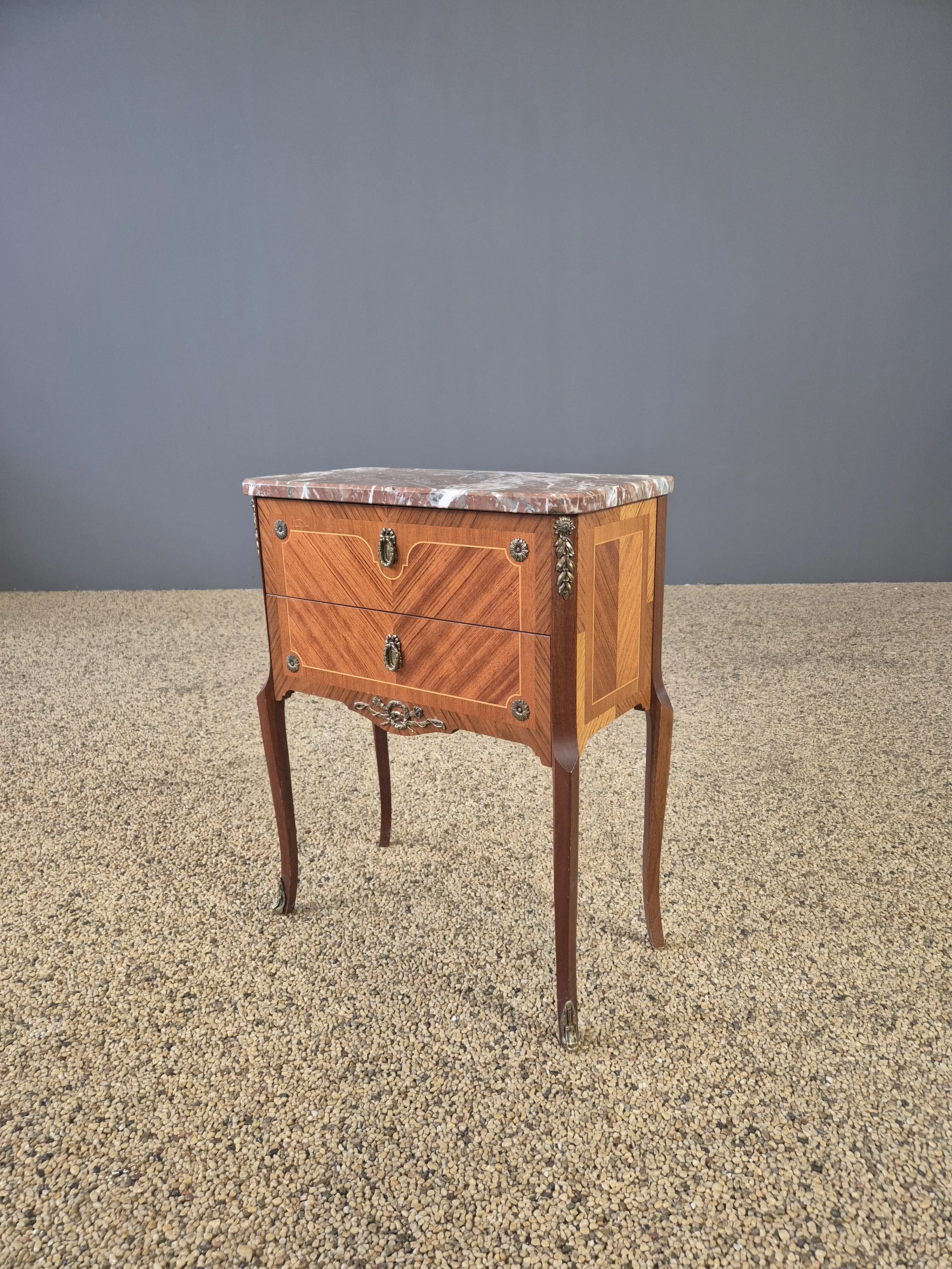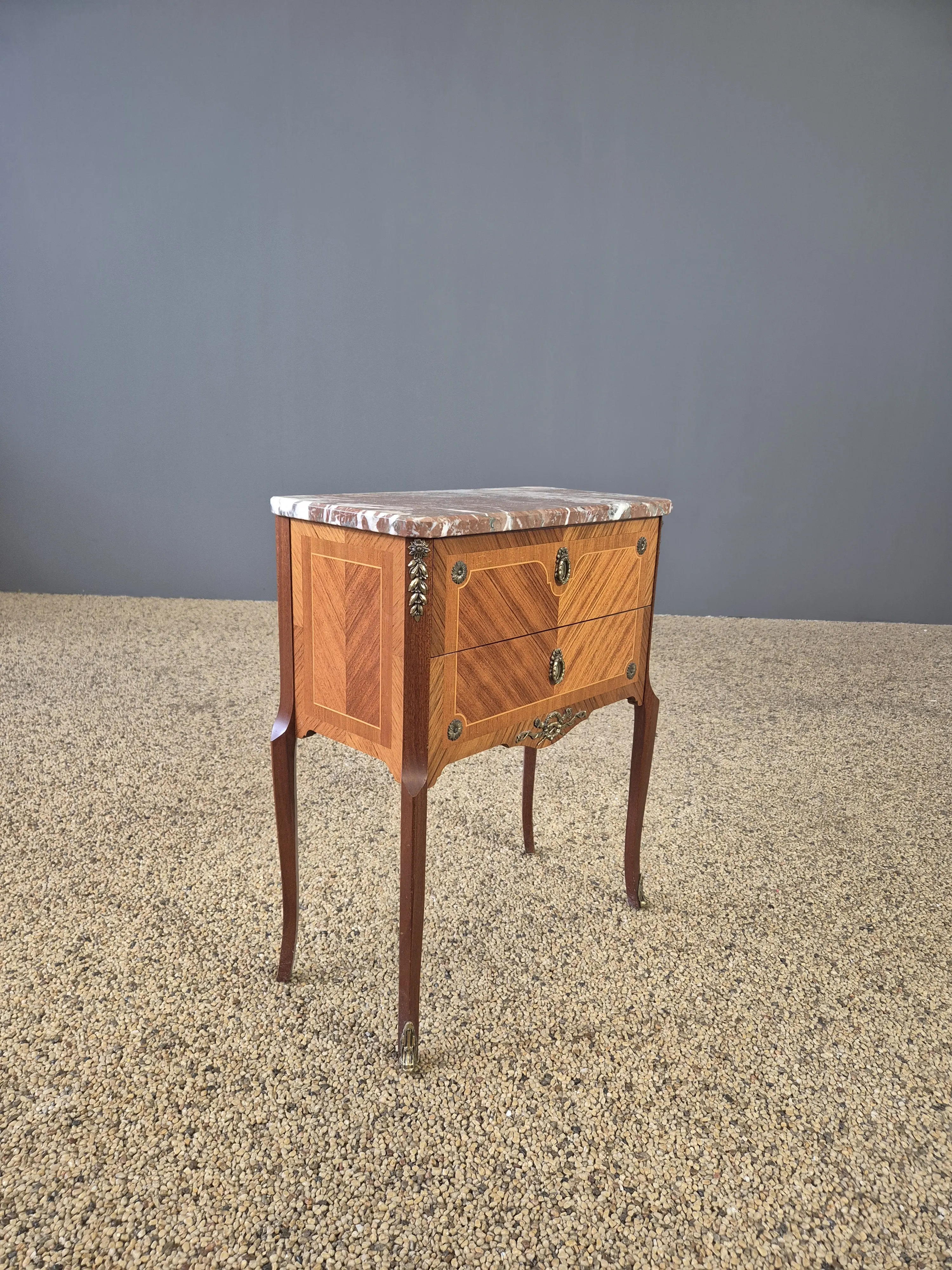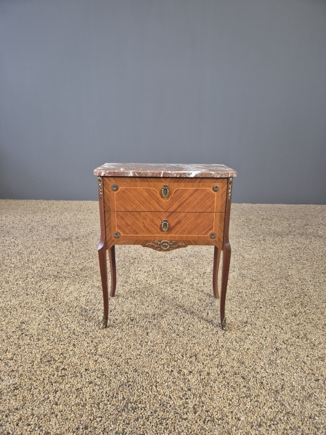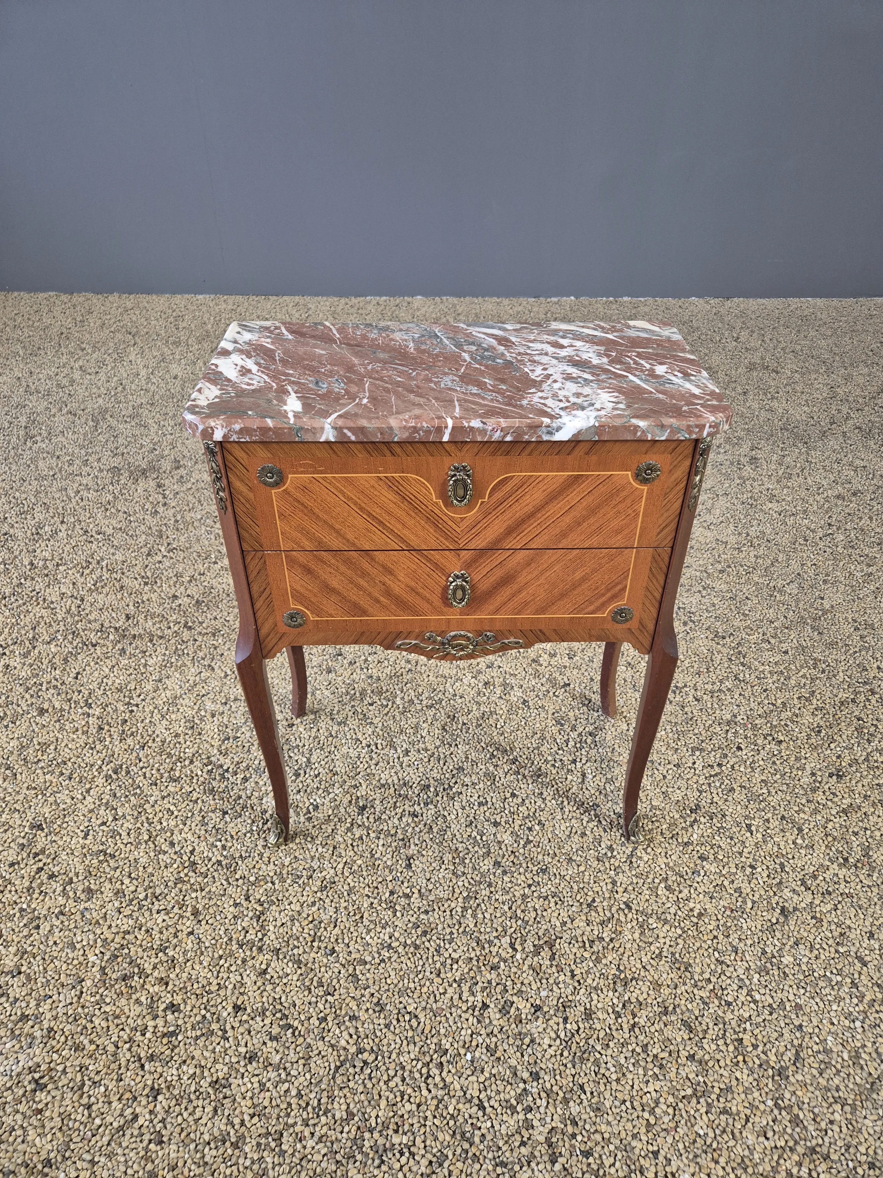 Mindre byrå med två lådor och stenskiva. Bruksslitage. Höjd: 63 cm. Bredd: 50 cm. Djup: 25 cm.