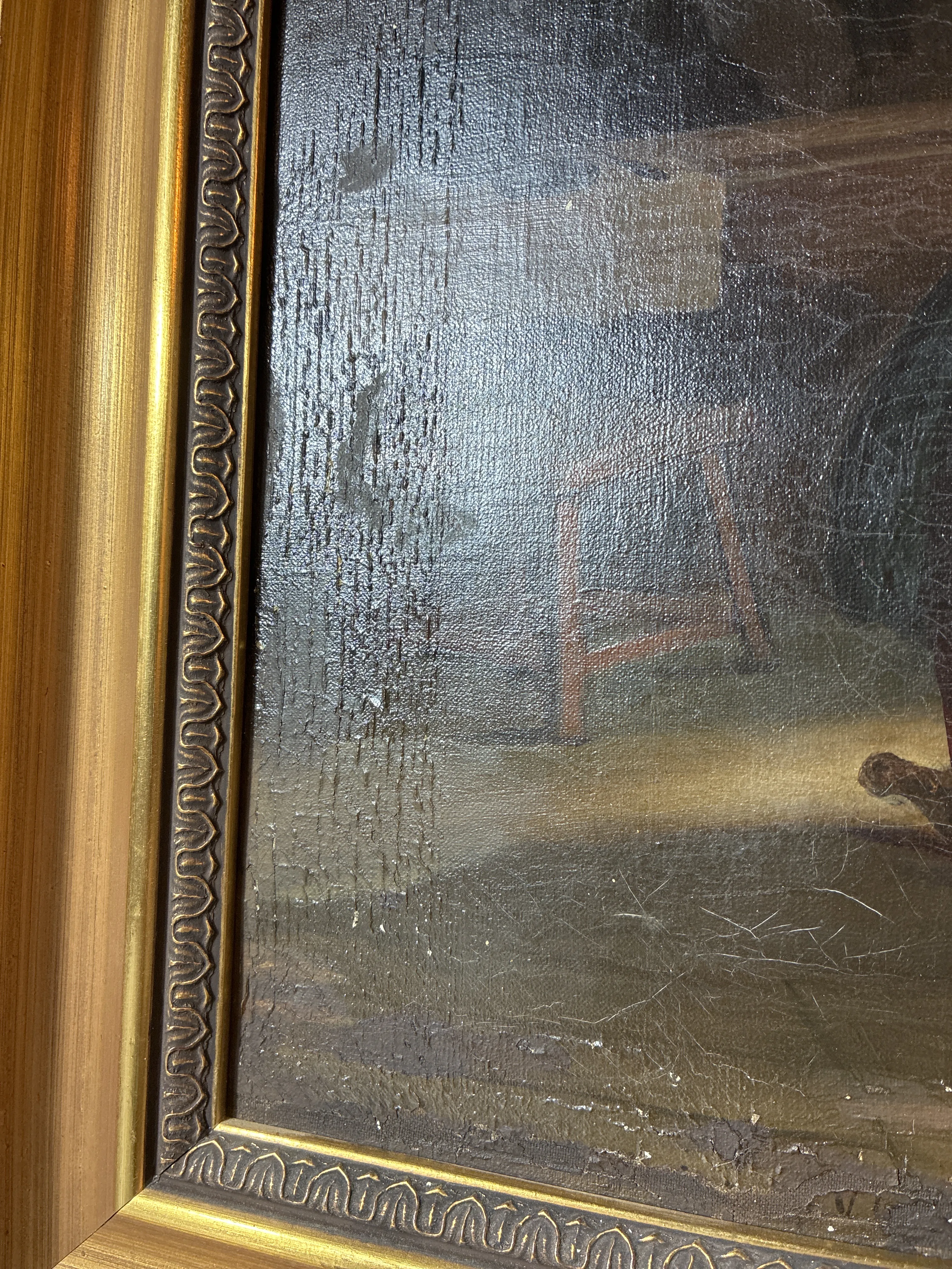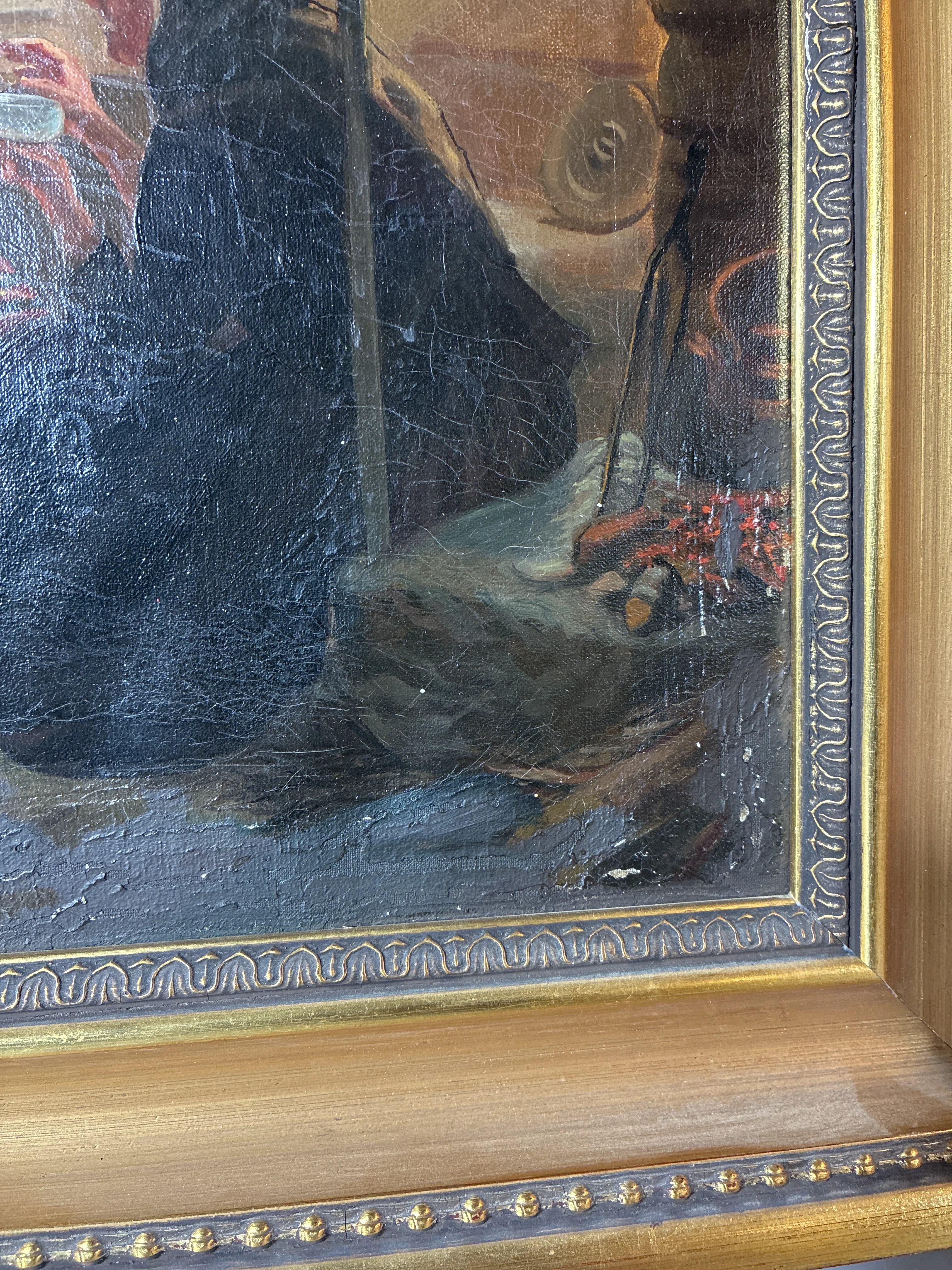 Olja på duk, osignerad kopia efter Adolph Tidemand, Spågumma på besök hos dalkulla. Ramyttermått: 60cm x 48cm. Krackeleringar, skador och färgsläpp.