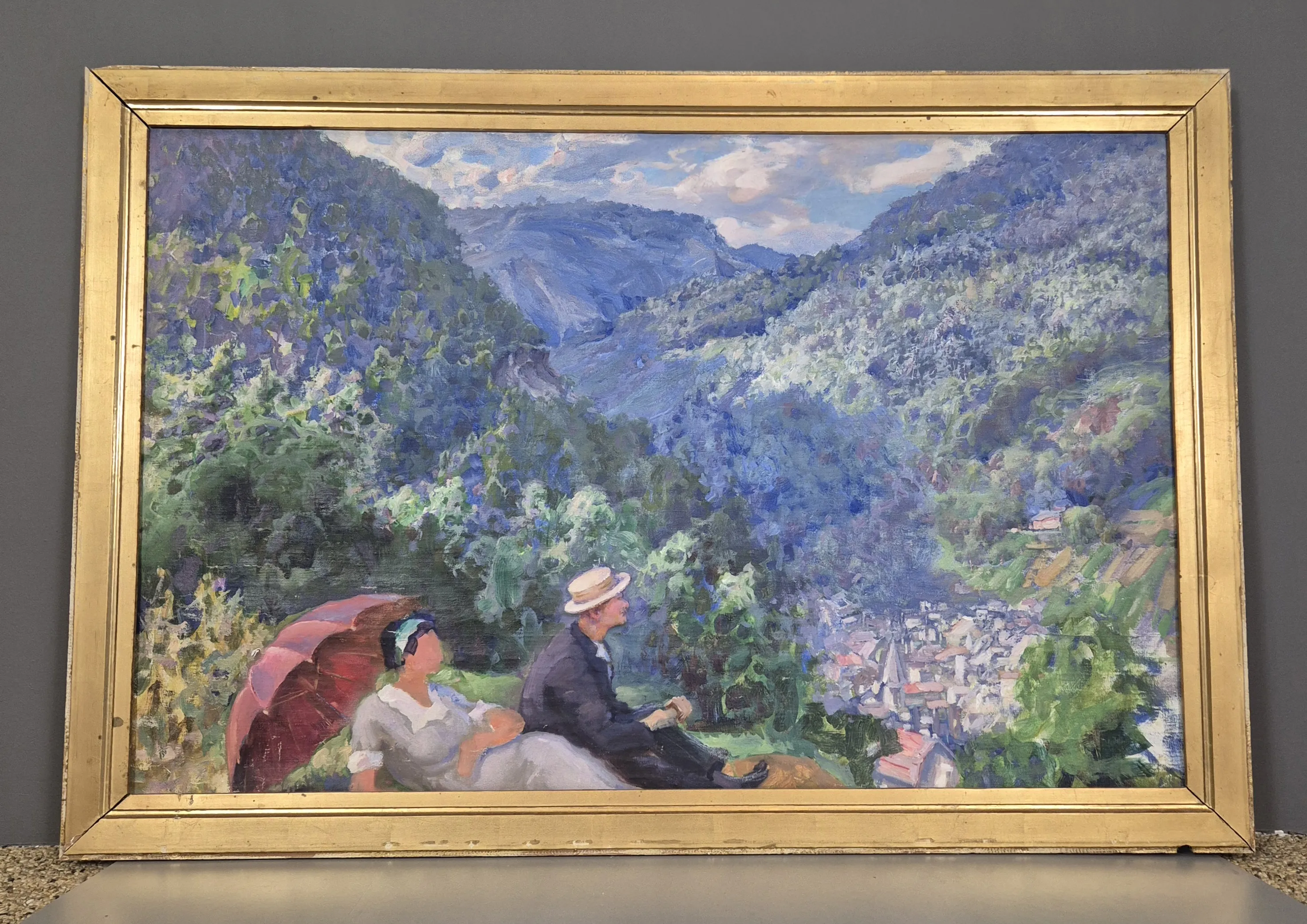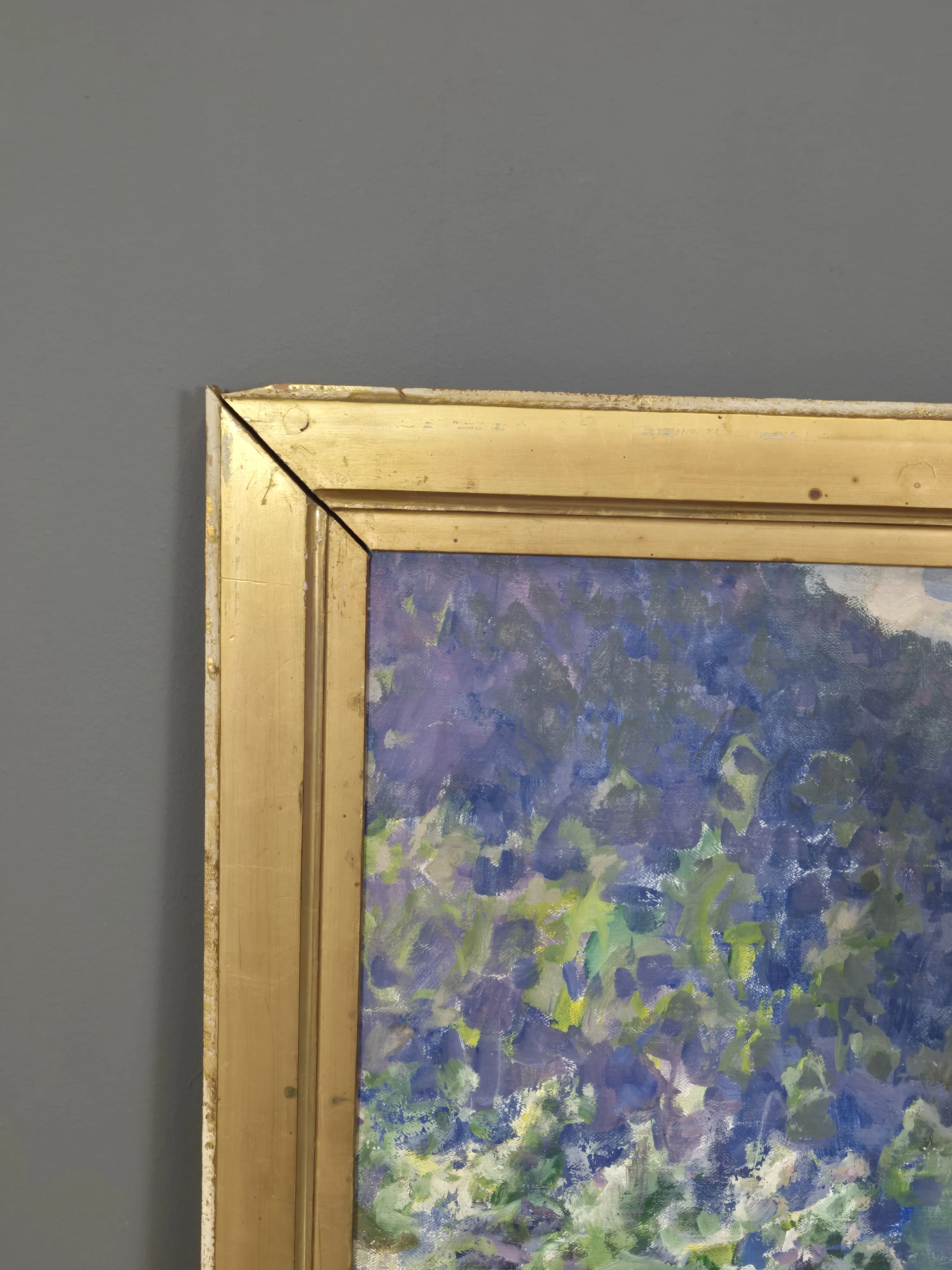 Målning av landskap. Duken är invikt i nederkant för att passa ramen. Ramyttermått:90cm x 130cm.