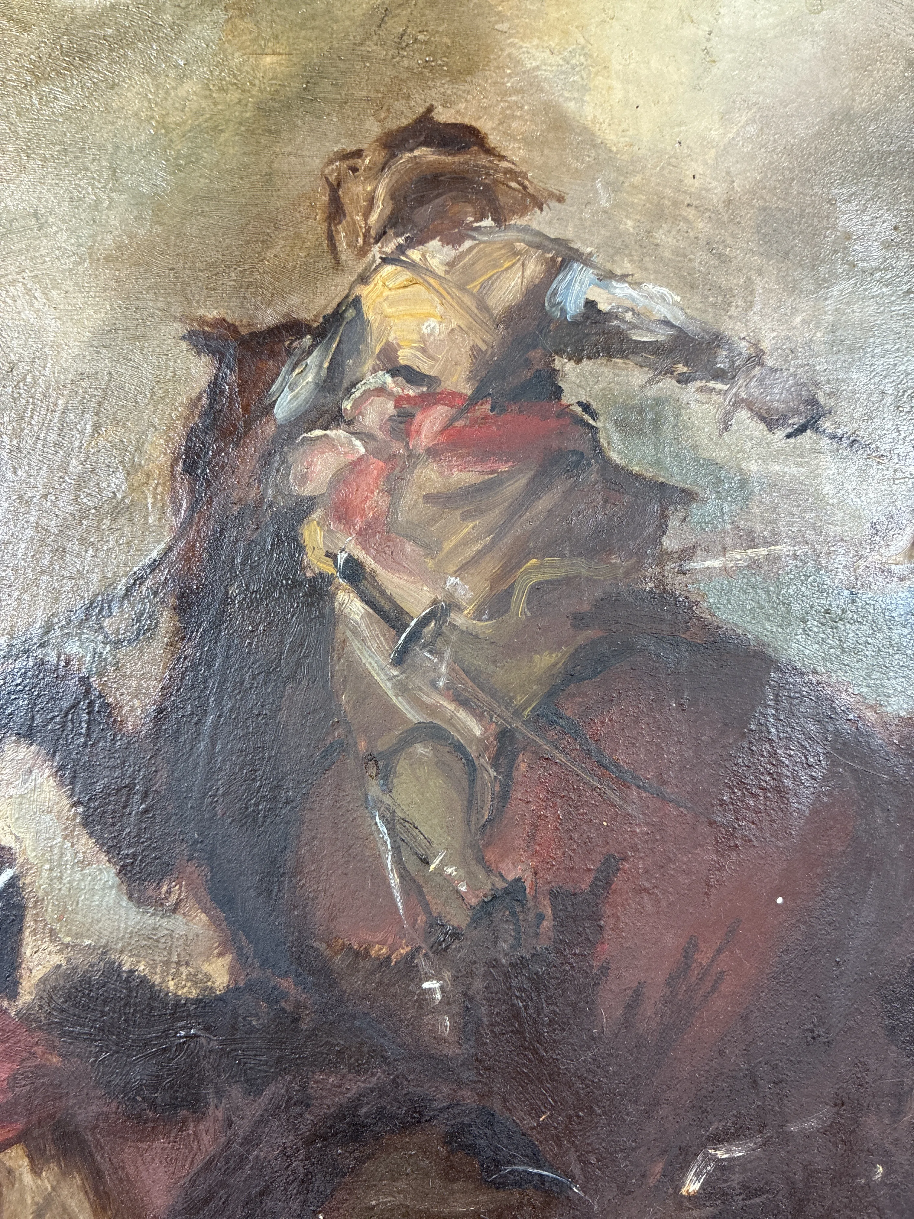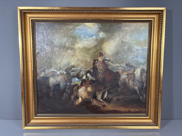 Oljemålning med scen från slagfält. Okänd konstnär. Ramyttermått: 73cm x 63cm.
