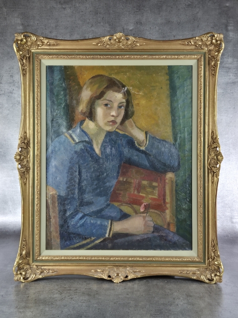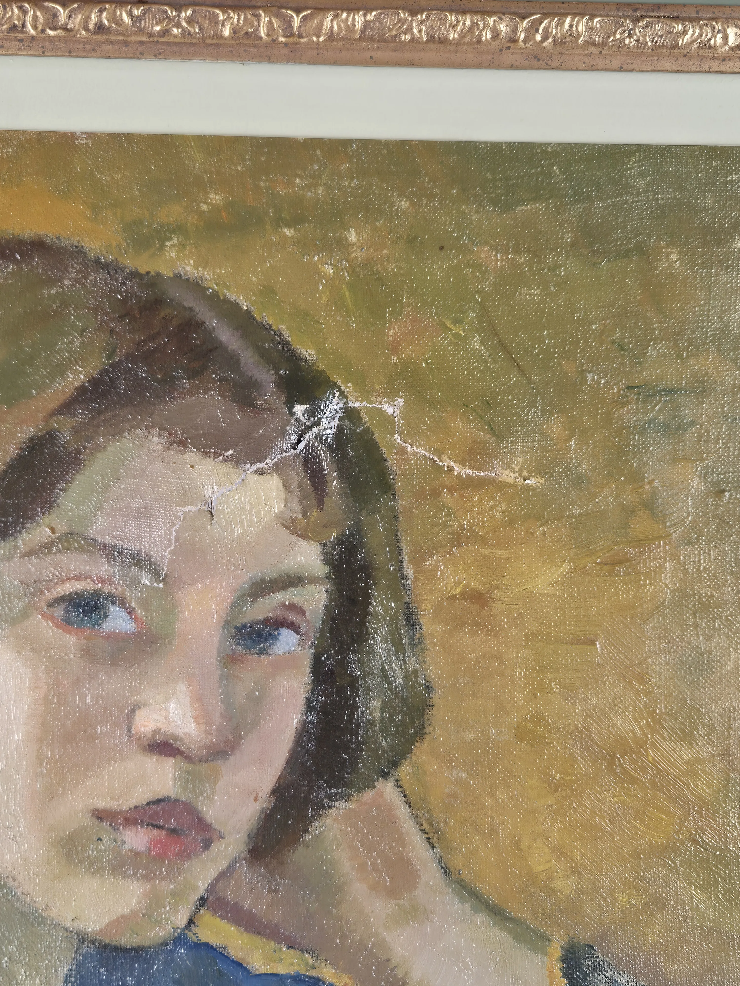 Porträtt med skada i duken enl bild. Ramyttermått: 71cm x 85cm