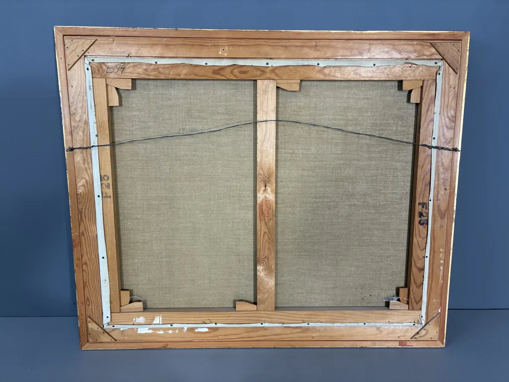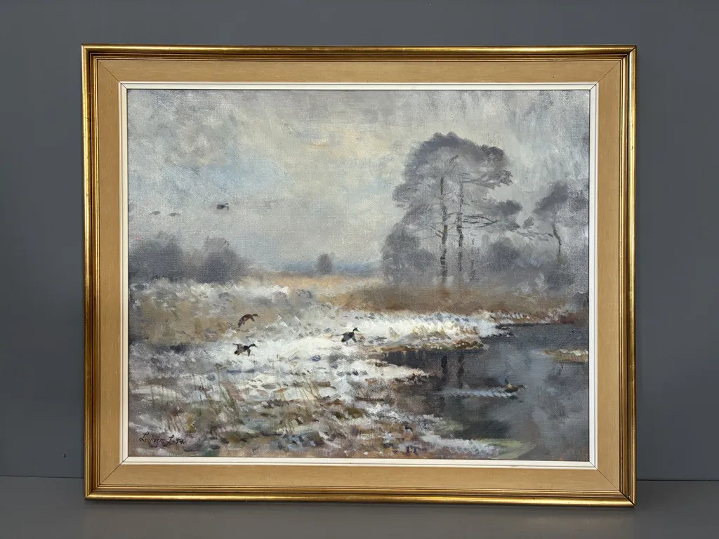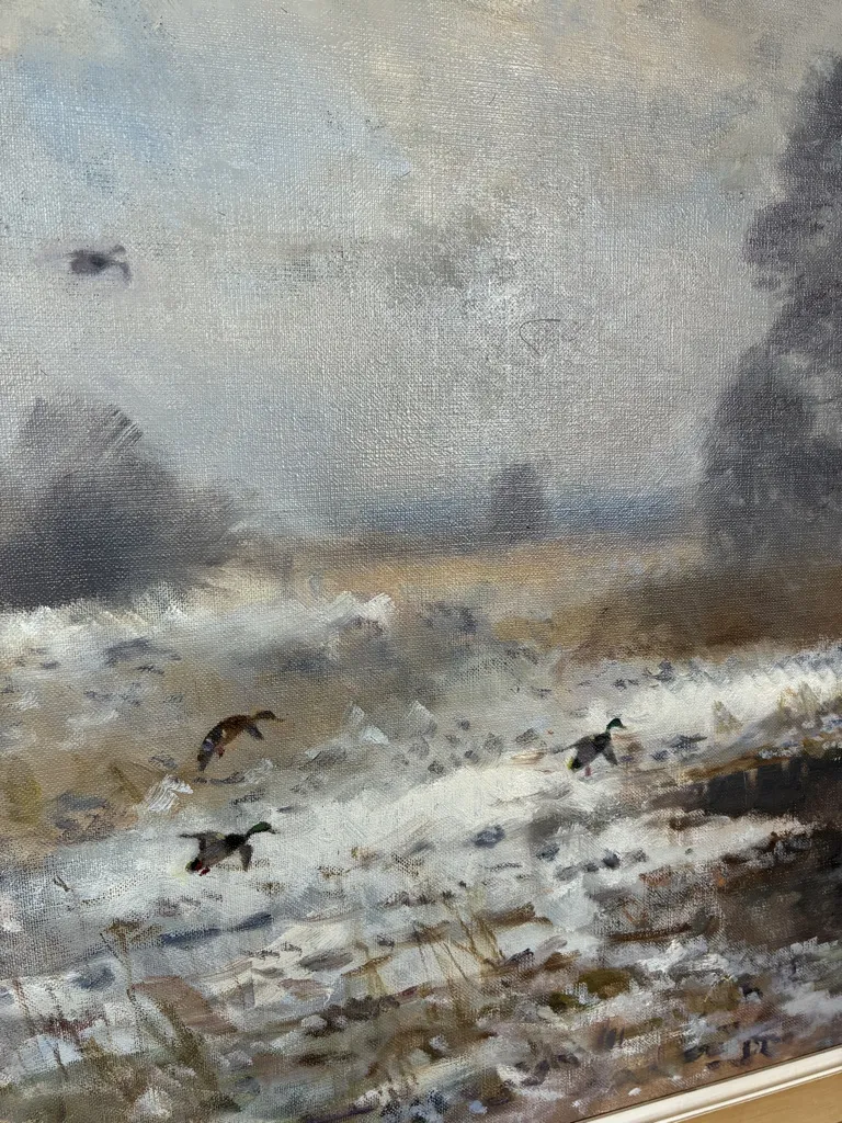 Motiv med änder vid sjö i vinterlandskap. Ramyttermått: 94,5cm x 78cm.