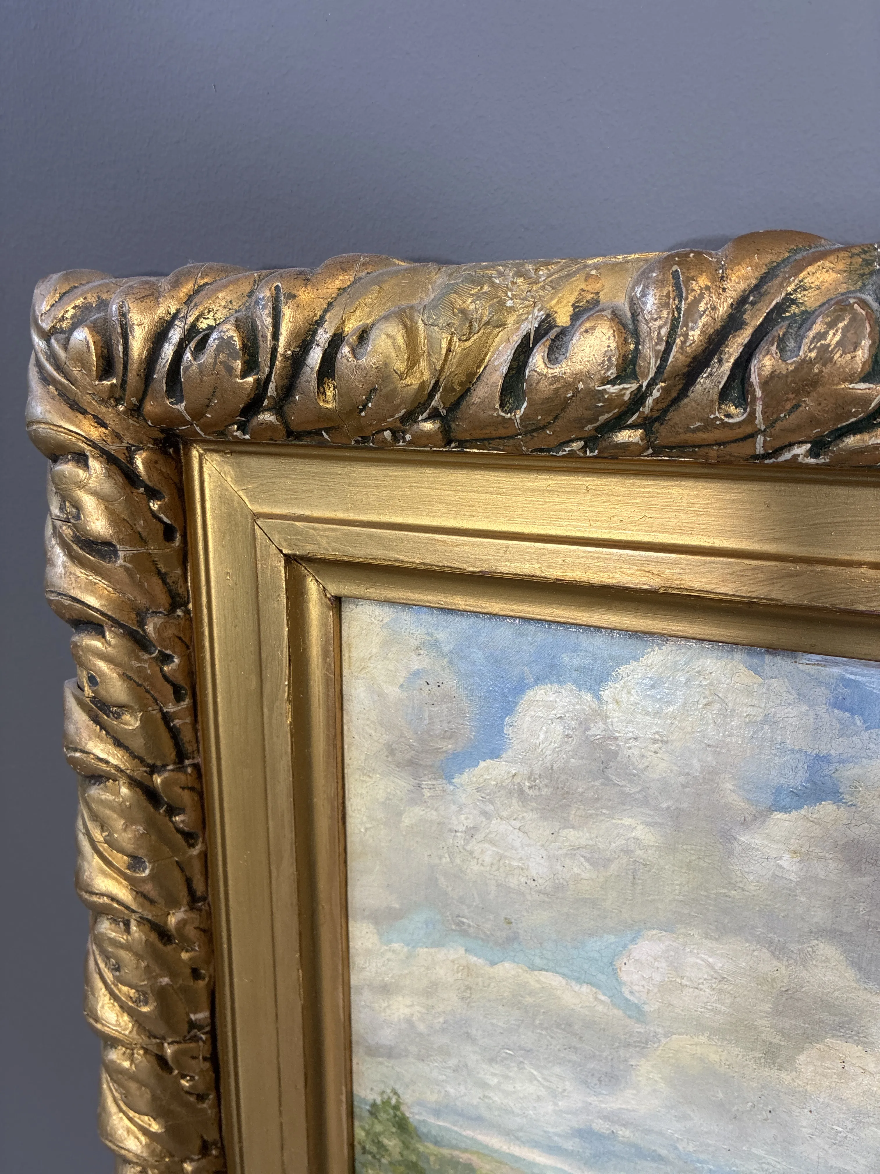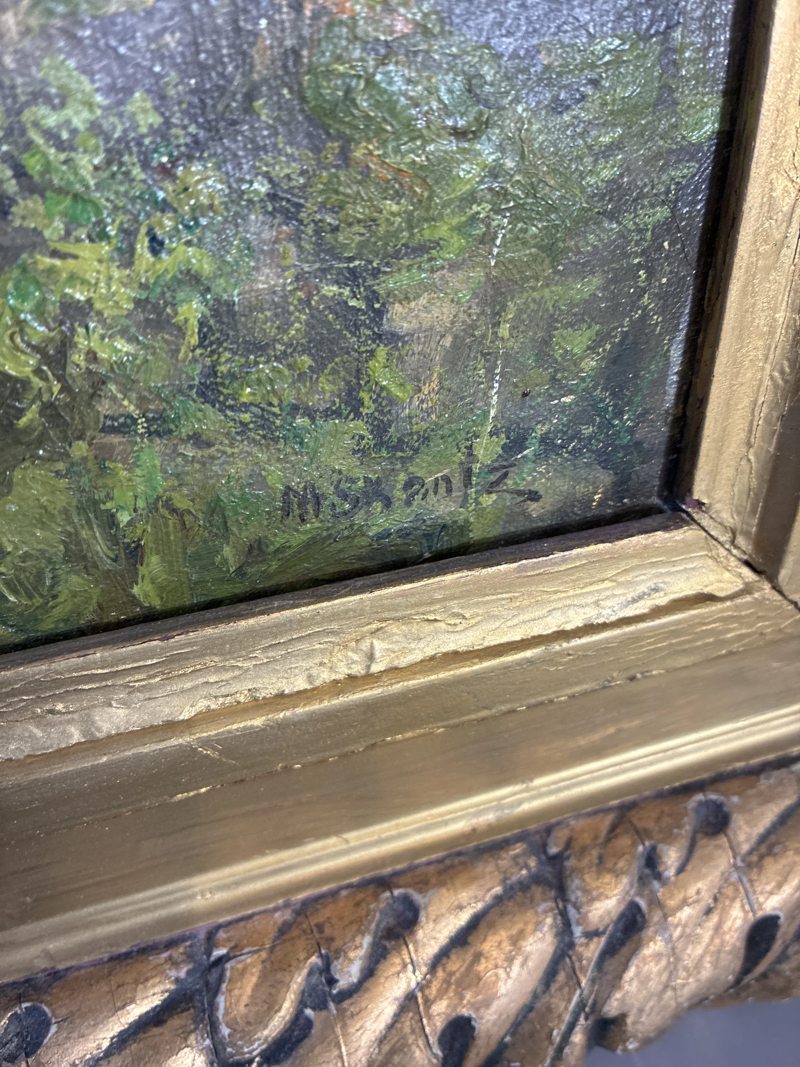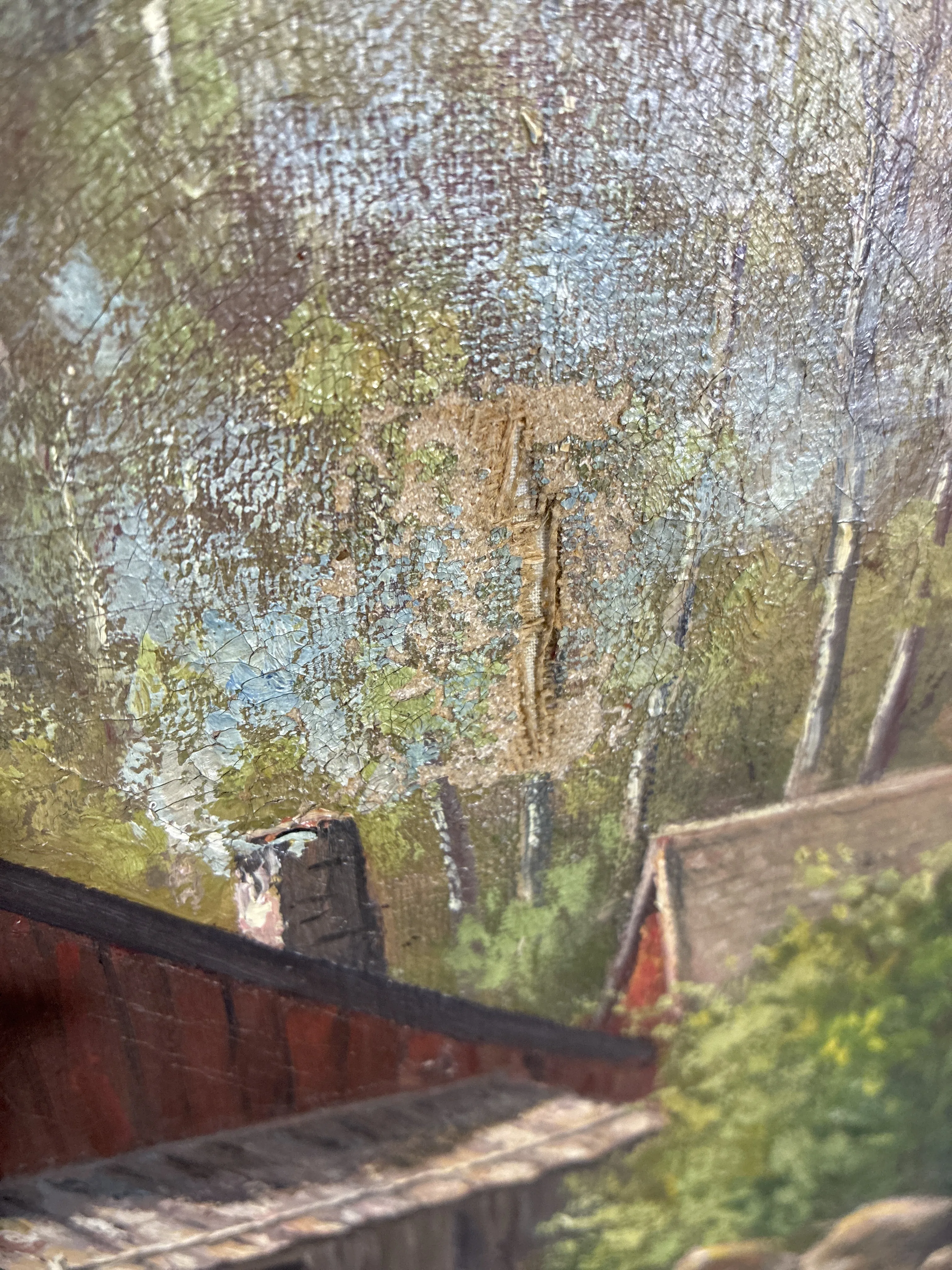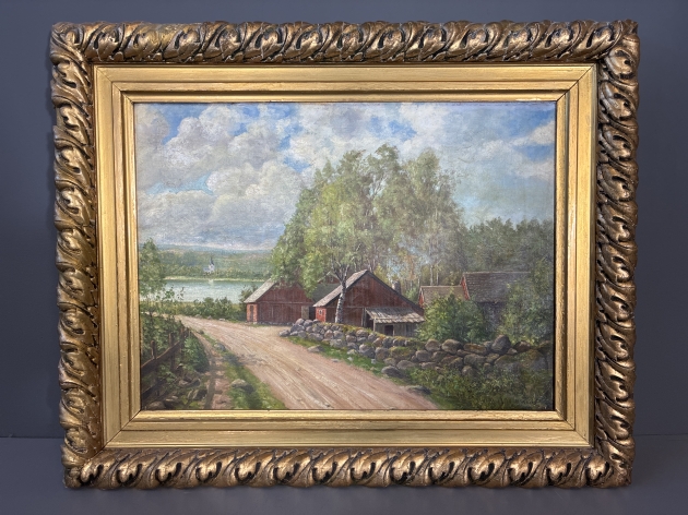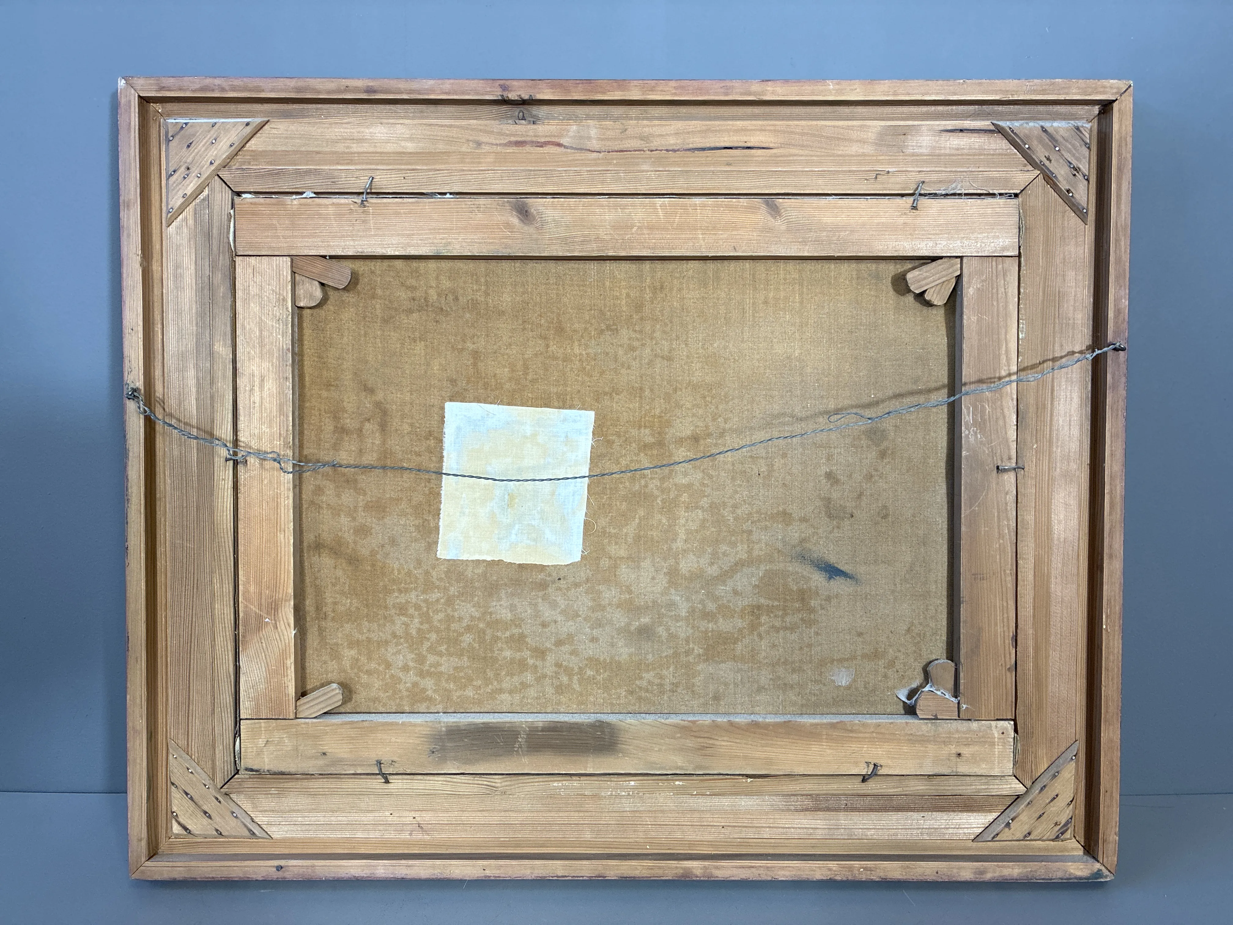 Olja på duk. Skulle behövas spännas. Vacker träram med mått: B90cm x H74cm. Lagningar och åldersslitage.
