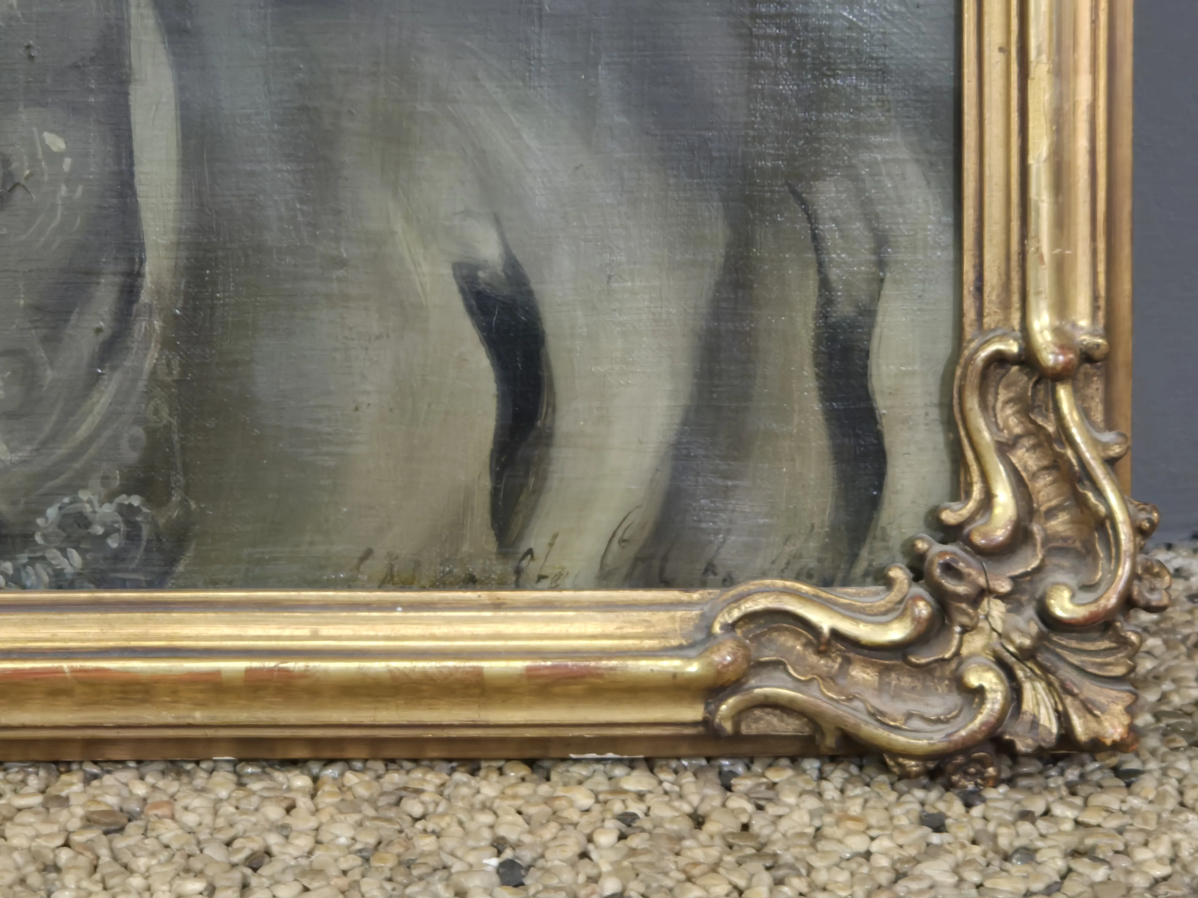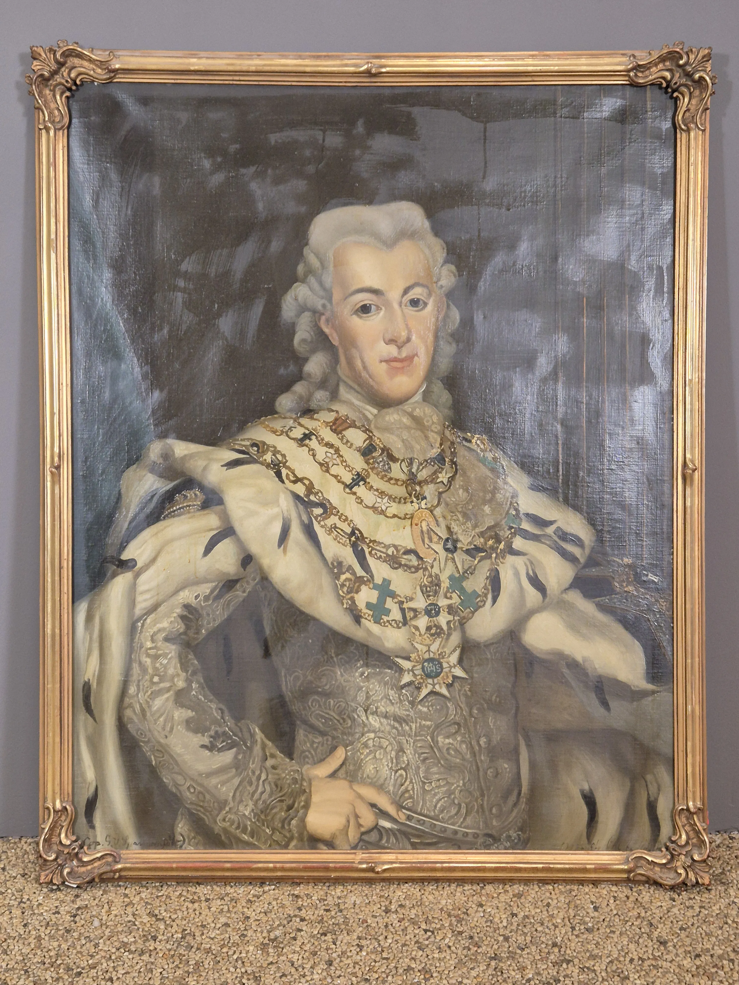 Porträtt av Gustav III. Kopia efter Alexander Roslins målning från 1777. Ramyttermått 103cm x 83cm. Smuts och åldersslitage