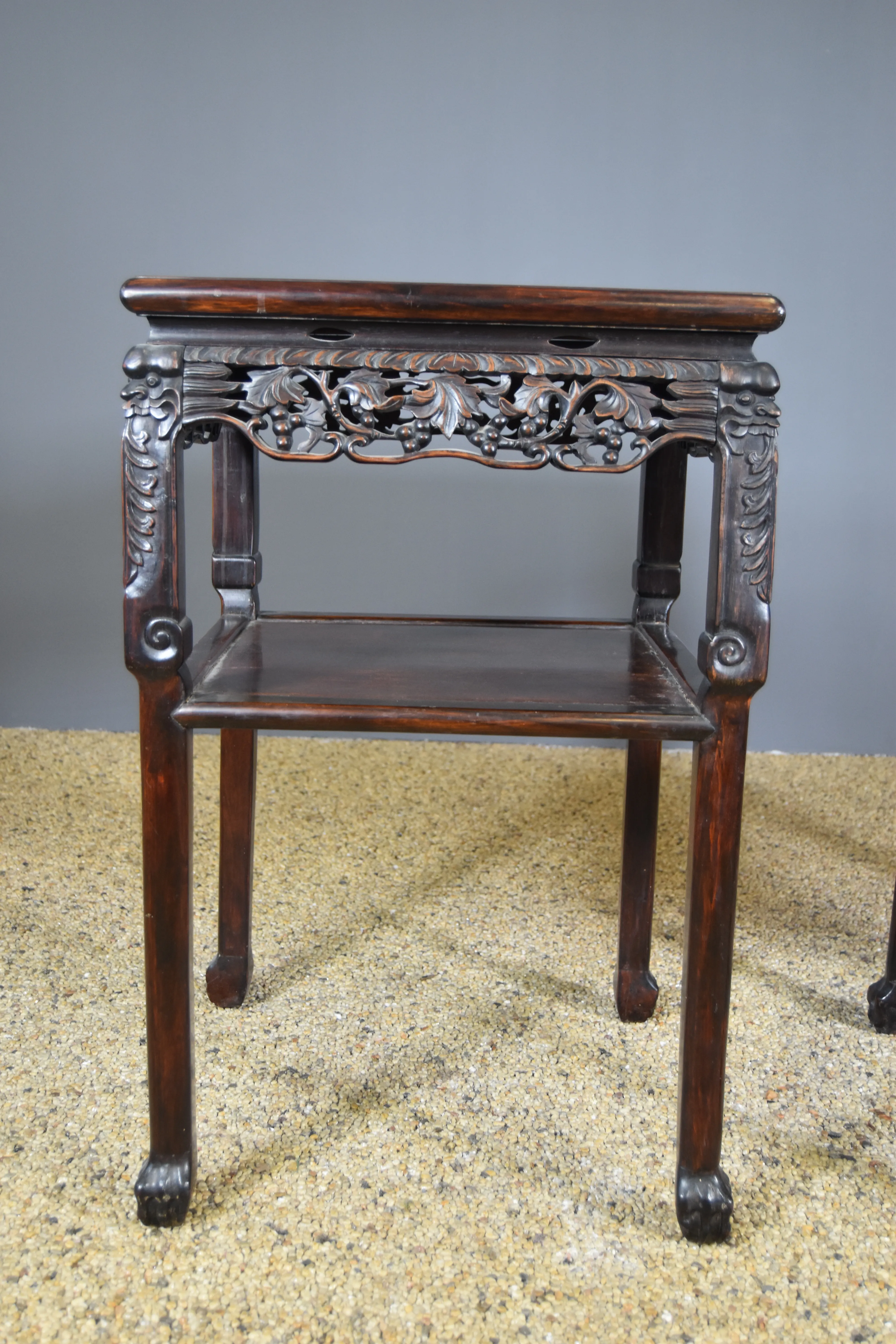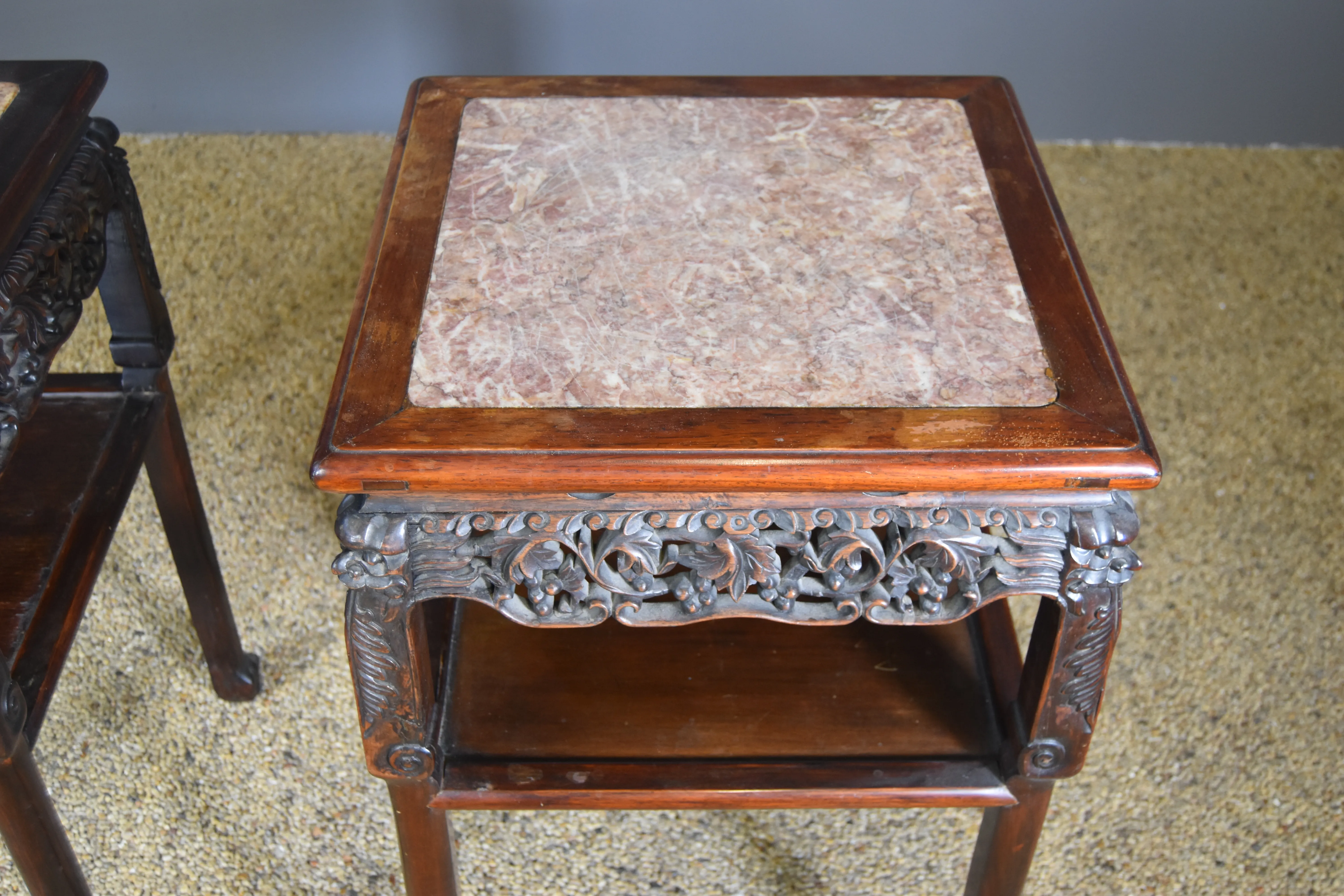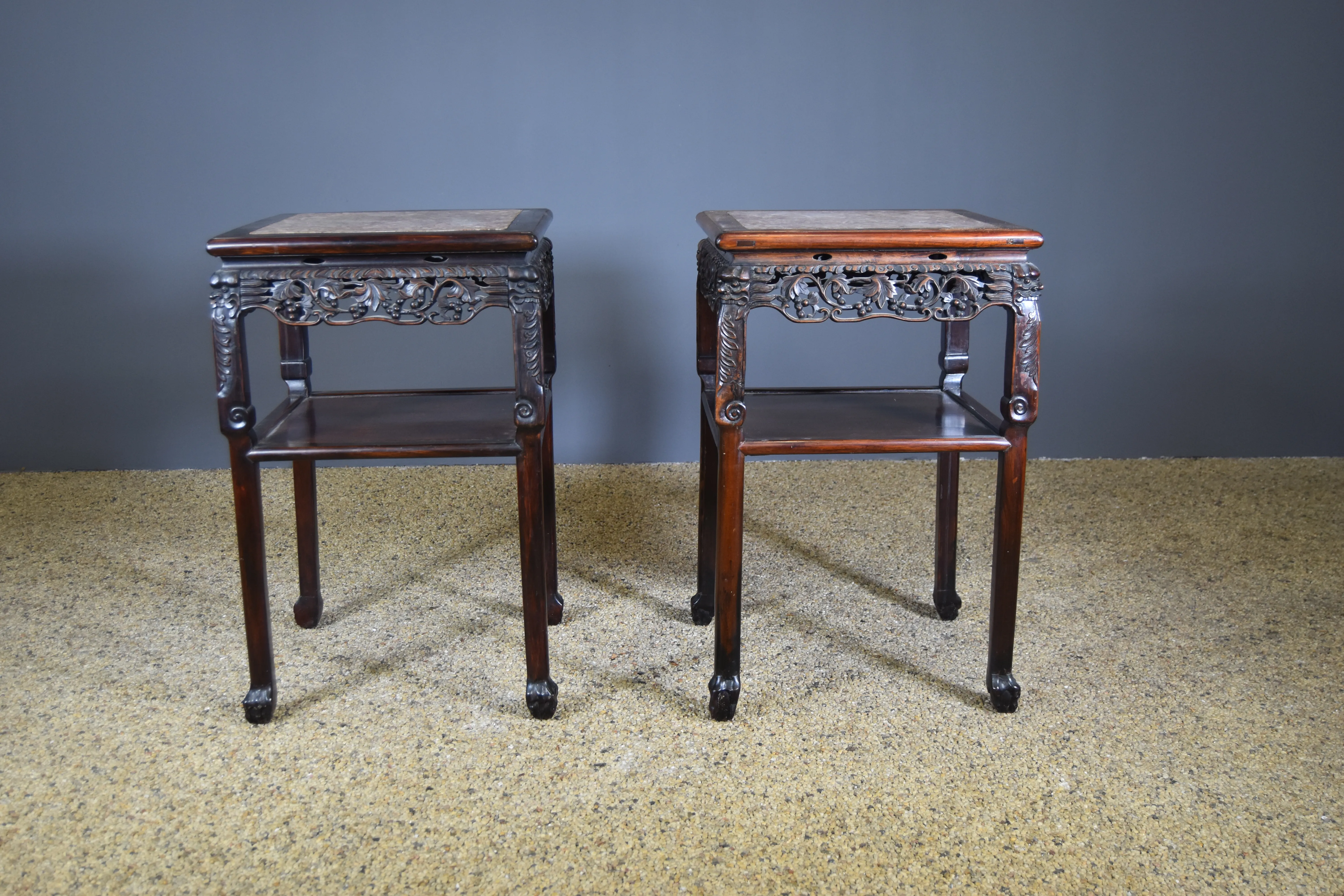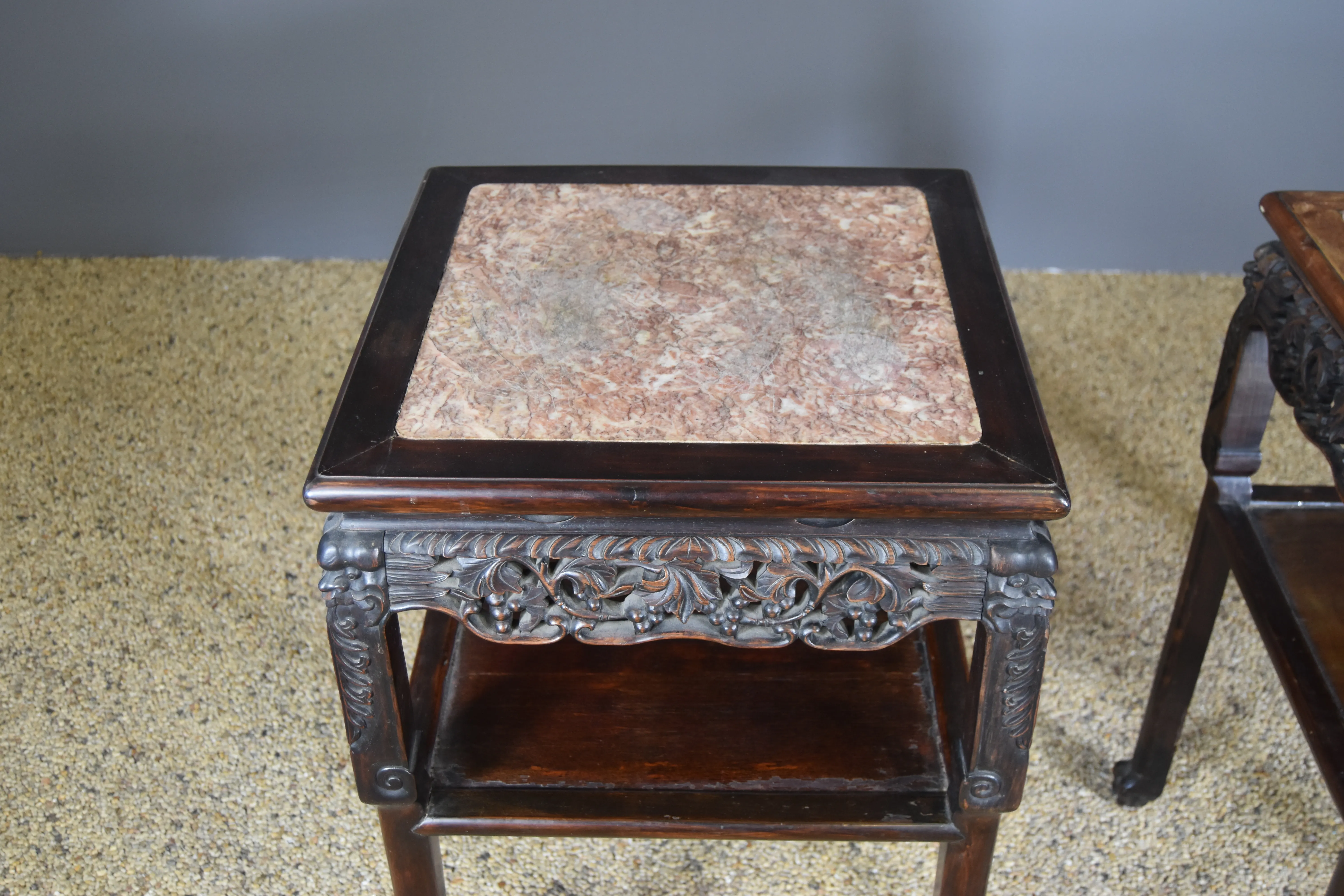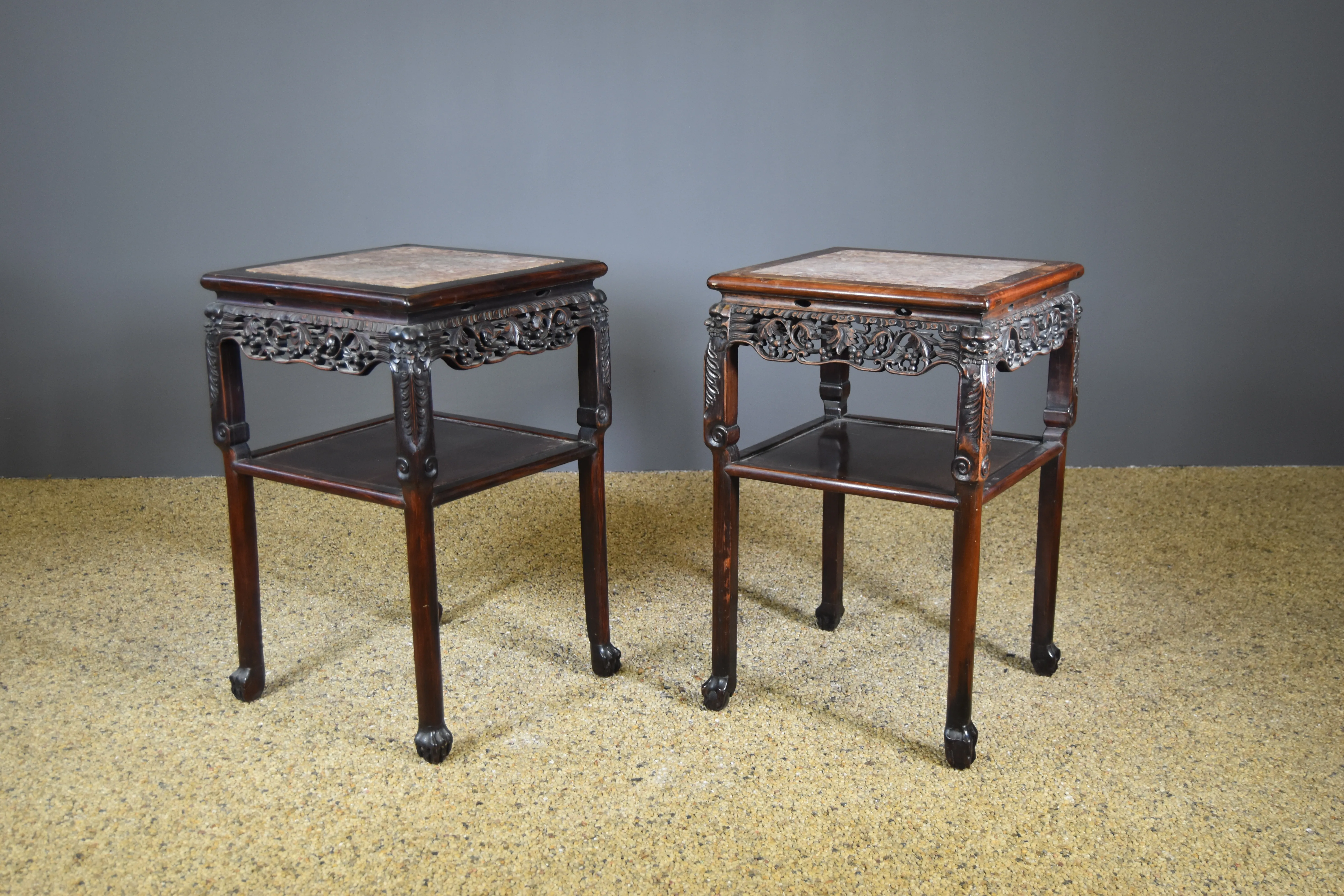 Paret bord med marmorskiva. Kina. 1900-tal.