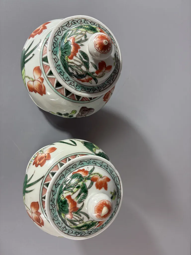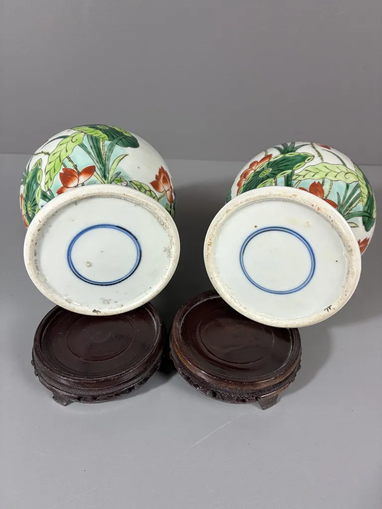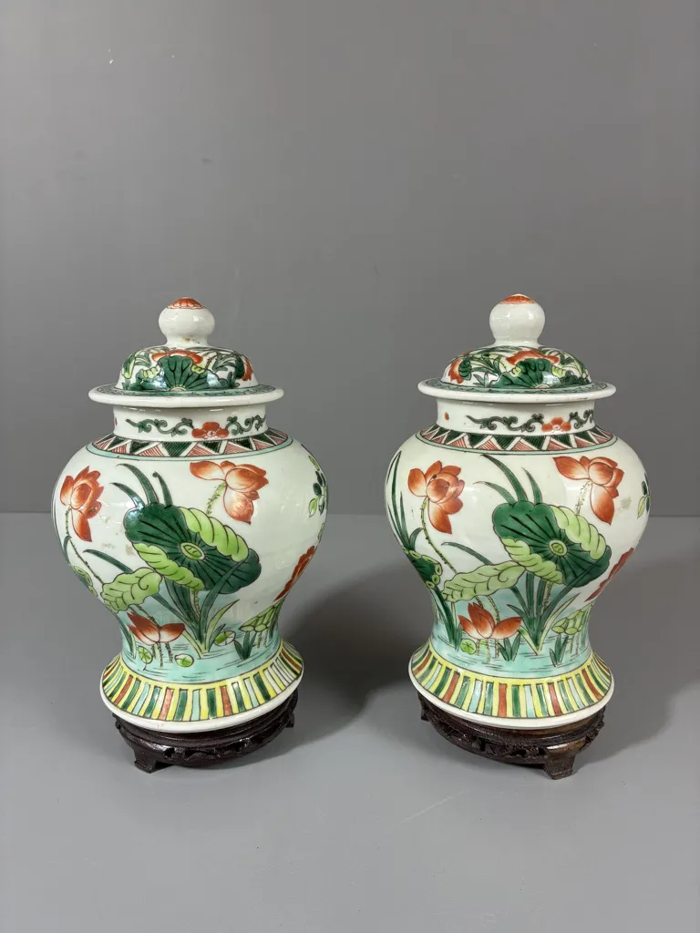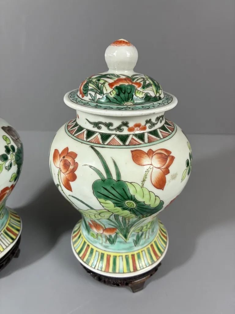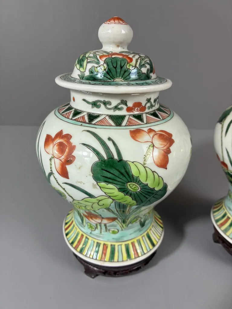 Urnor med målad dekor, underlägg i trä. Åldersslitage och nagg på knopparna. Höjd exklusive underlägg: 20cm.