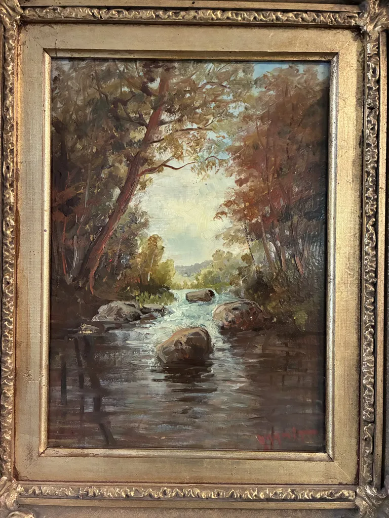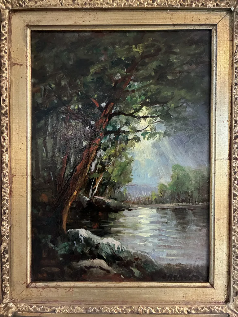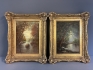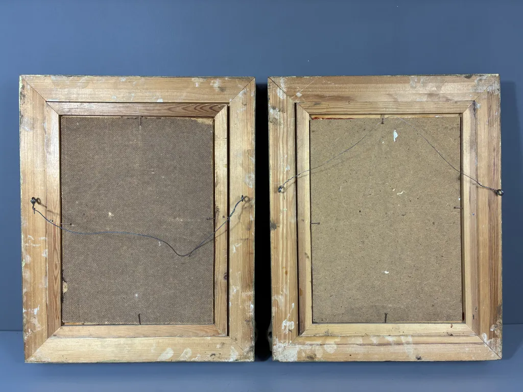 Två målningar på pannå. Okänd konstnär. Ramyttermått: 39cm x 48,5cm.
