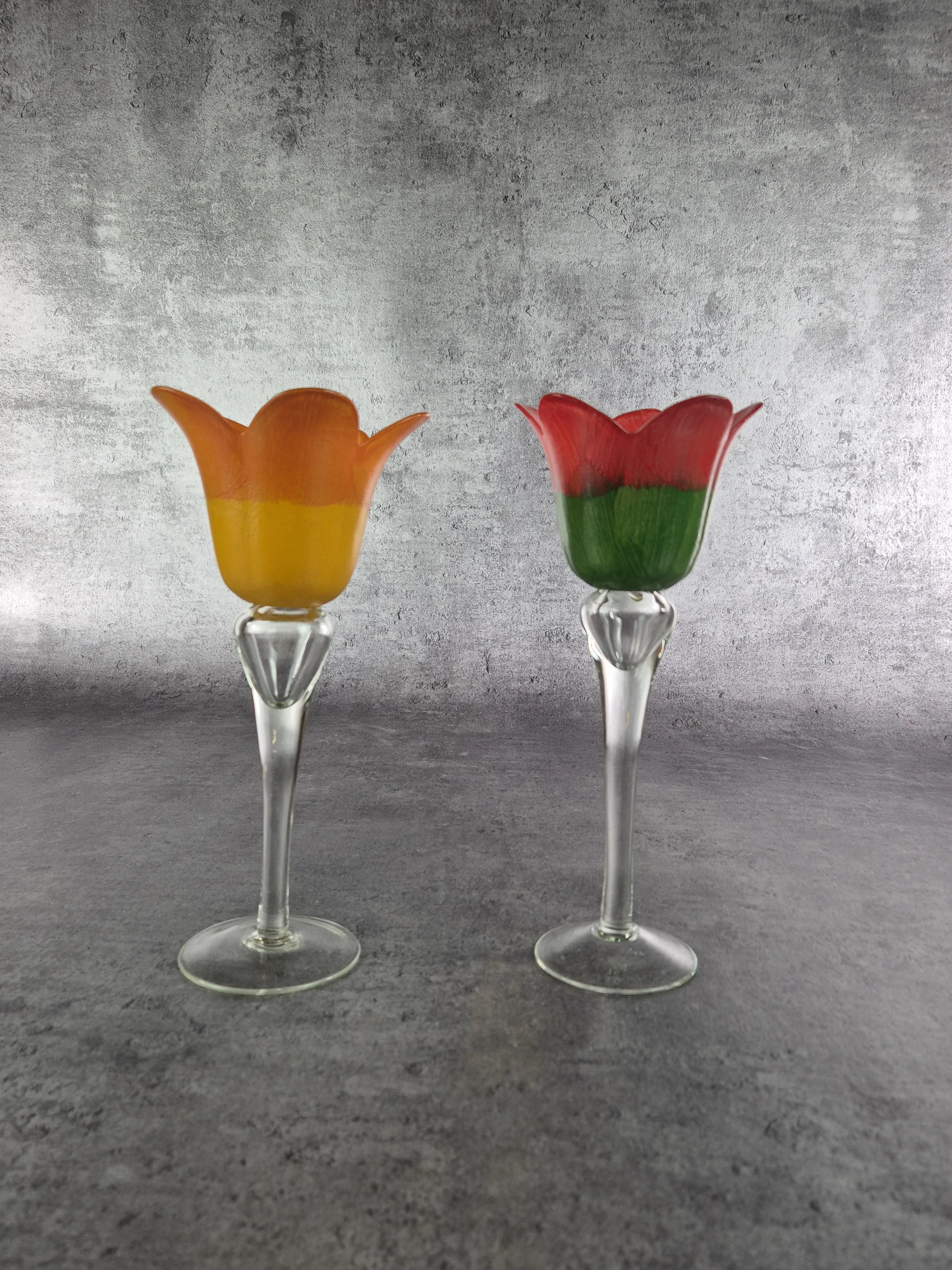 Paret höga glas/ljushållare: Höjd 28cm. Bruksslitage.