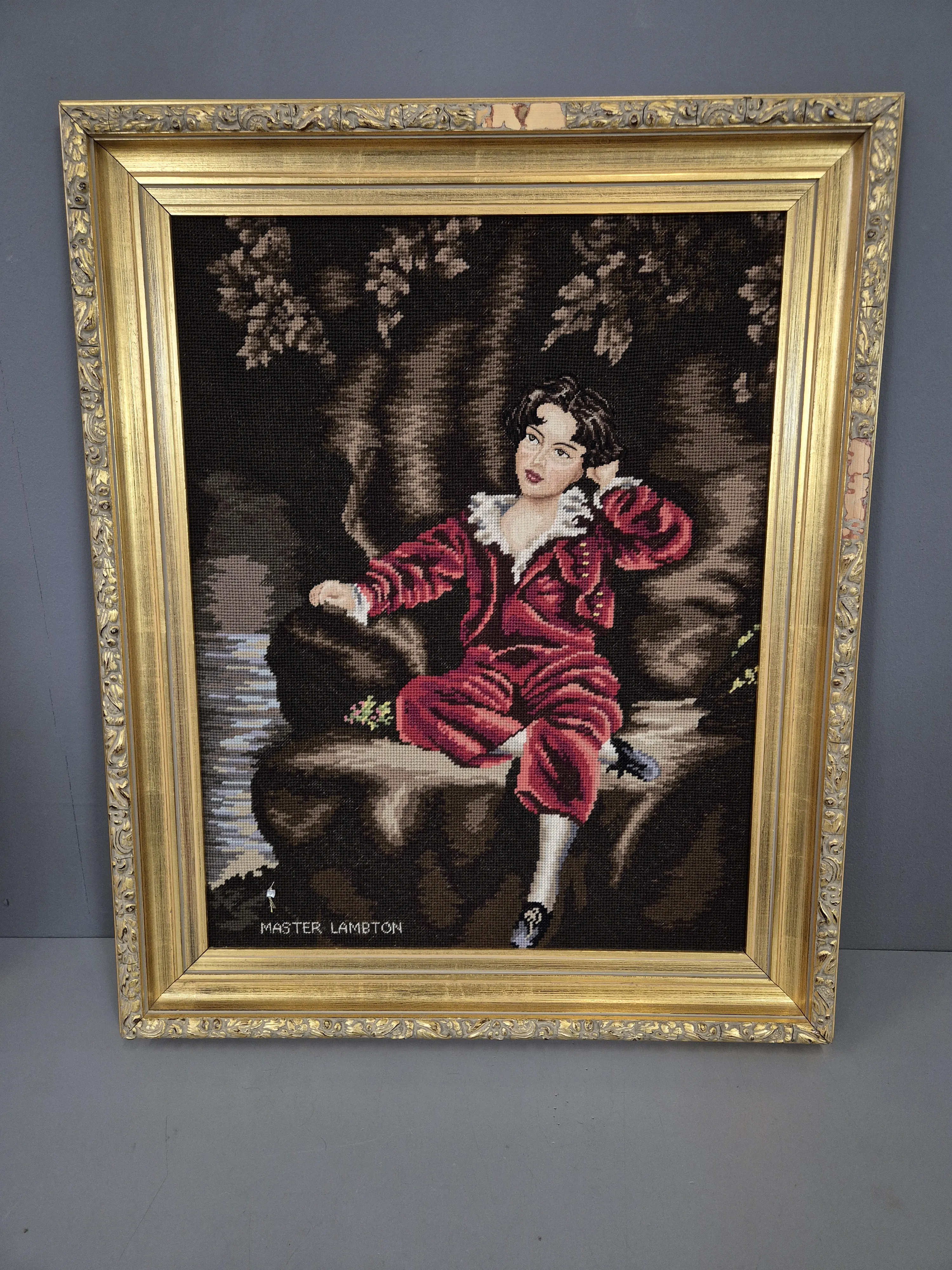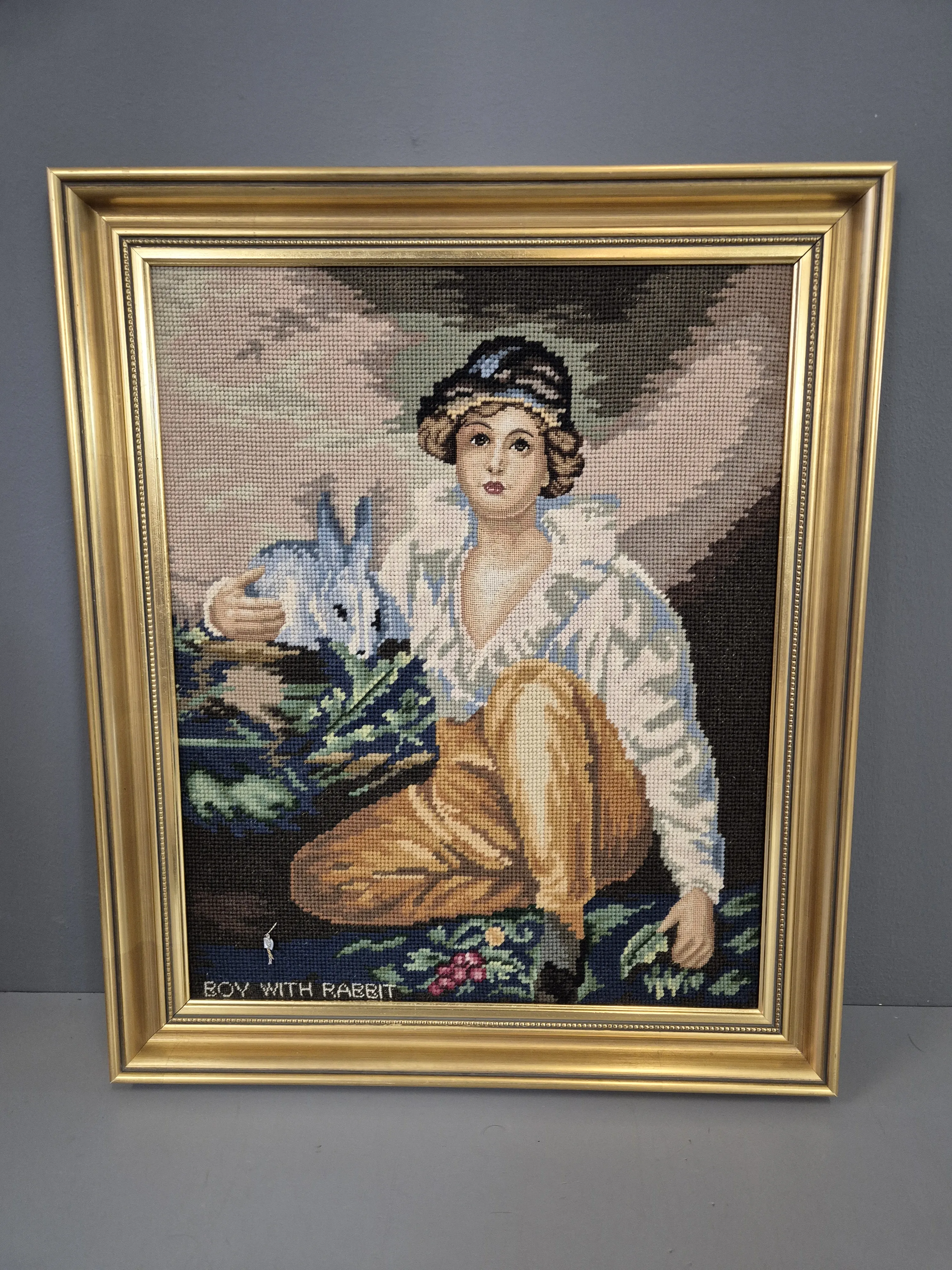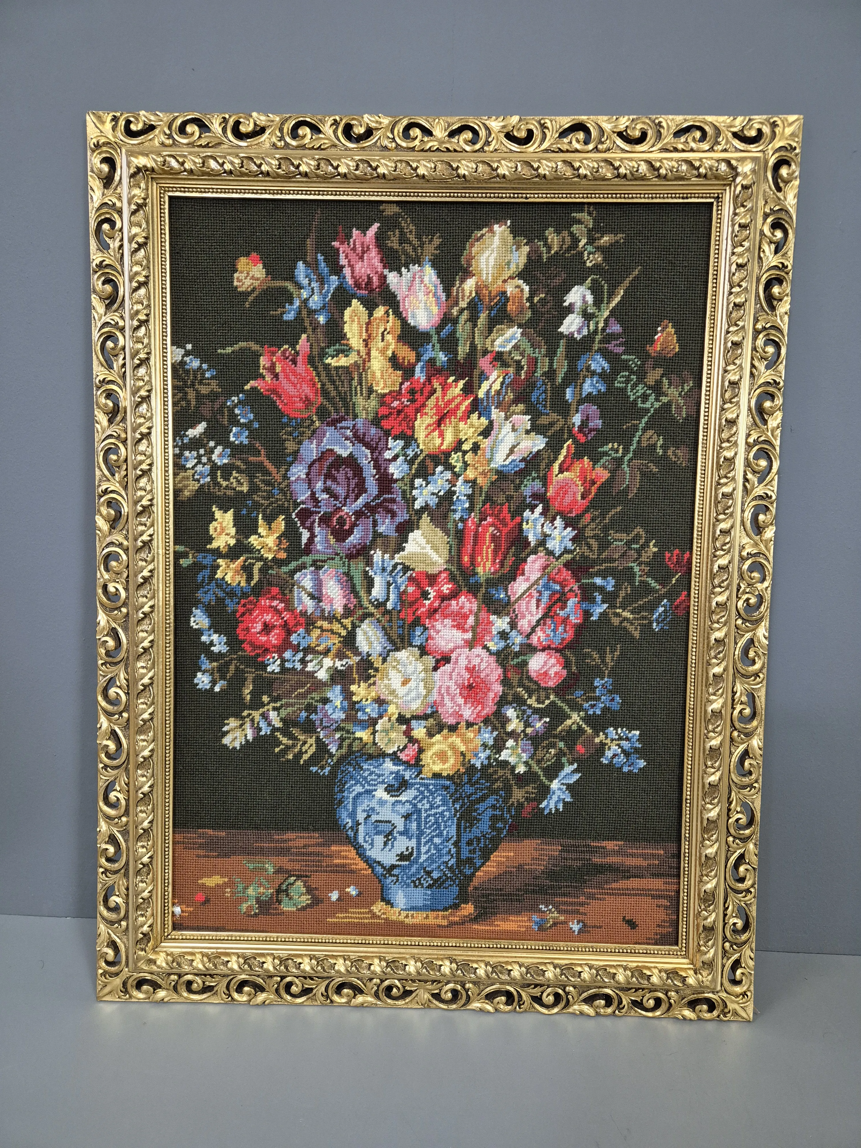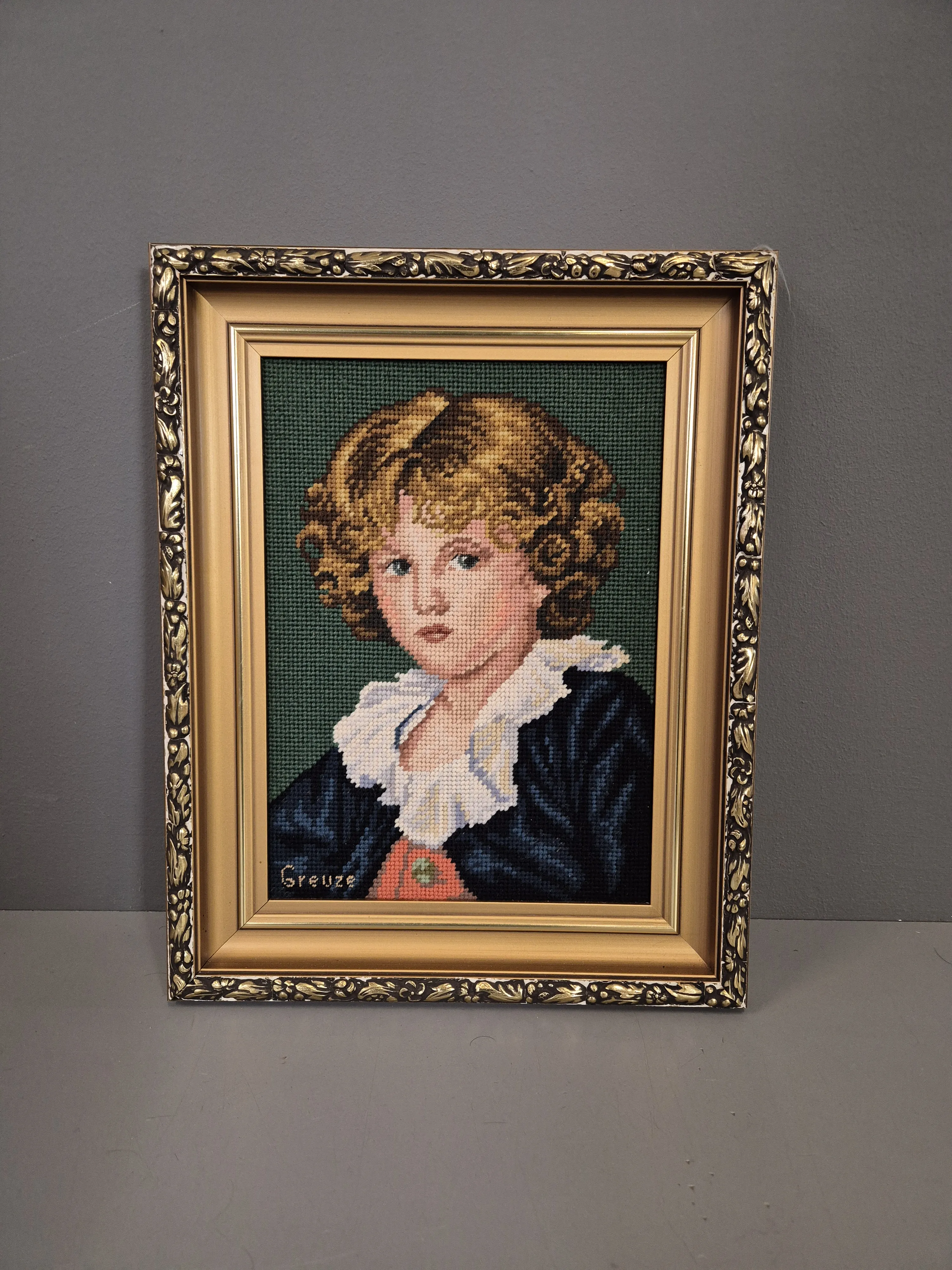 Virkade porträtt och stilleben. Höjd på den högsta: 83,5cm.