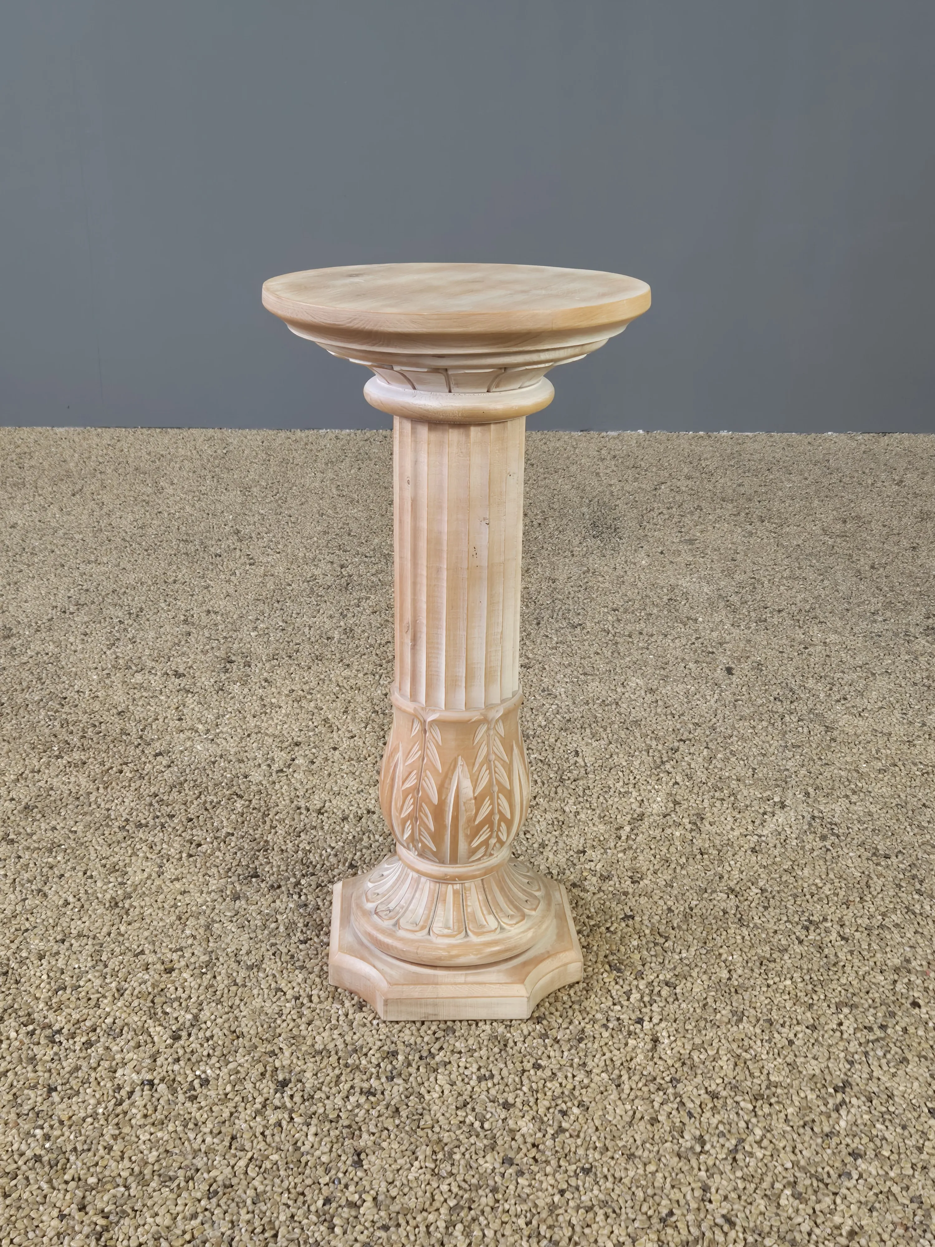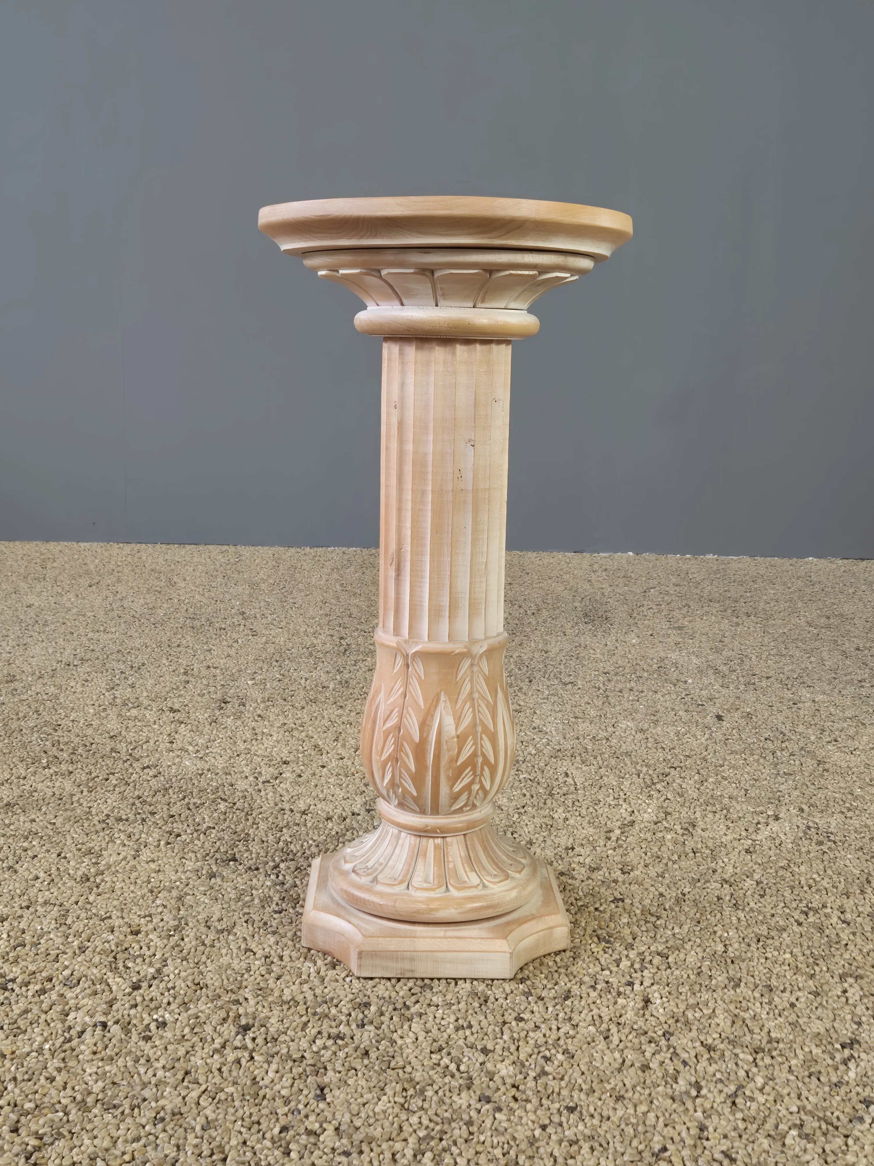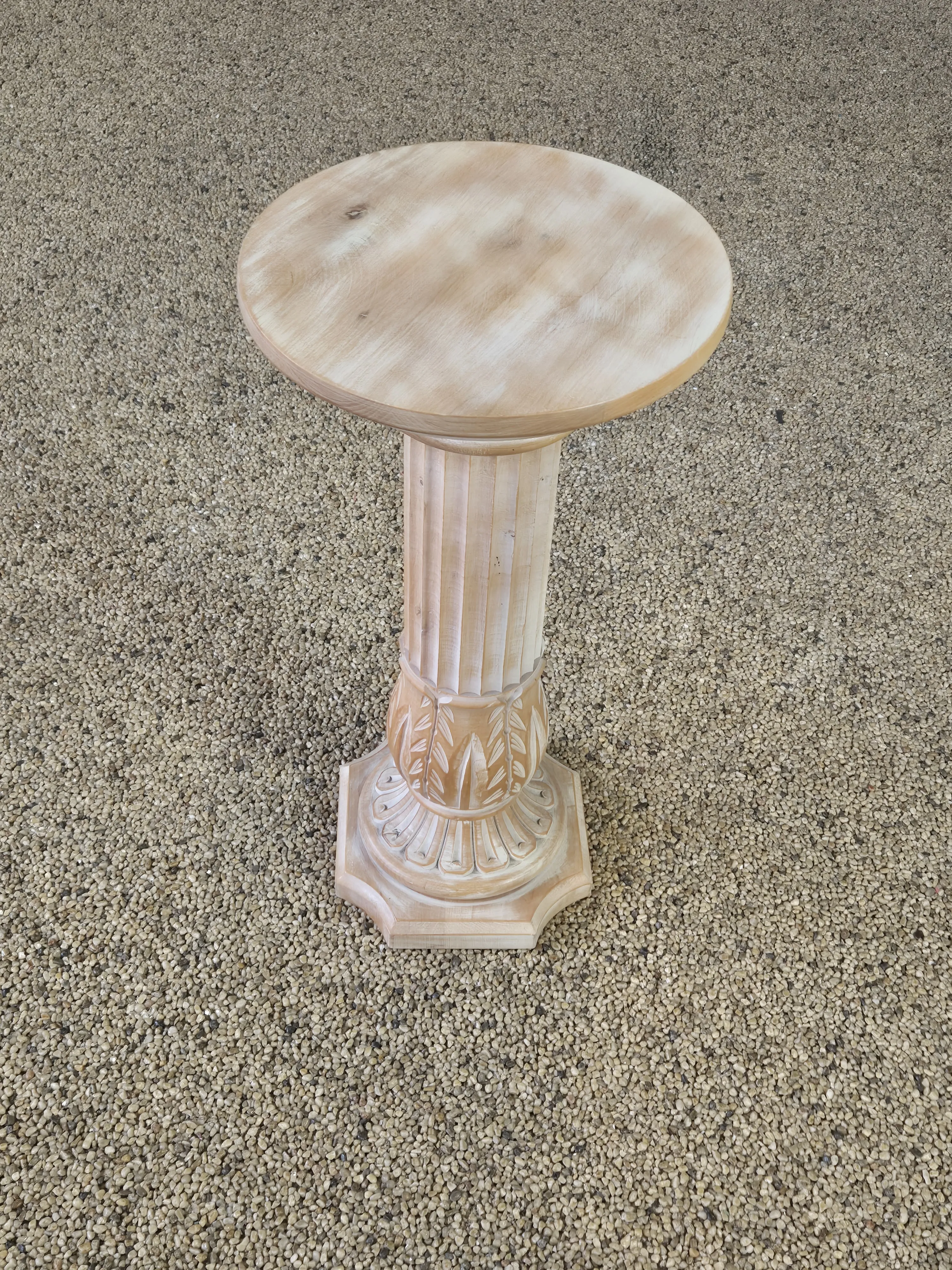 Piedestal i bemålat trä. Spricka förekommer. Höjd: 64 cm. Diameter: 33 cm.