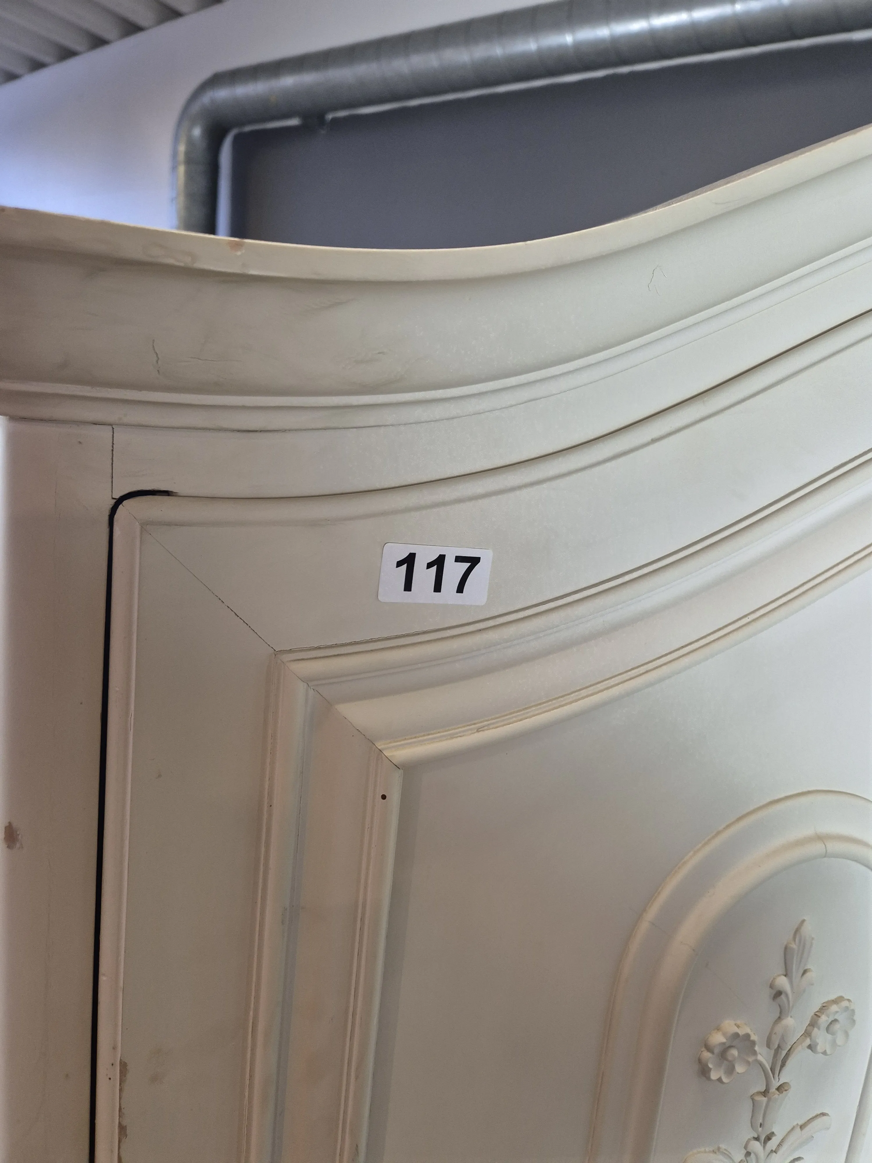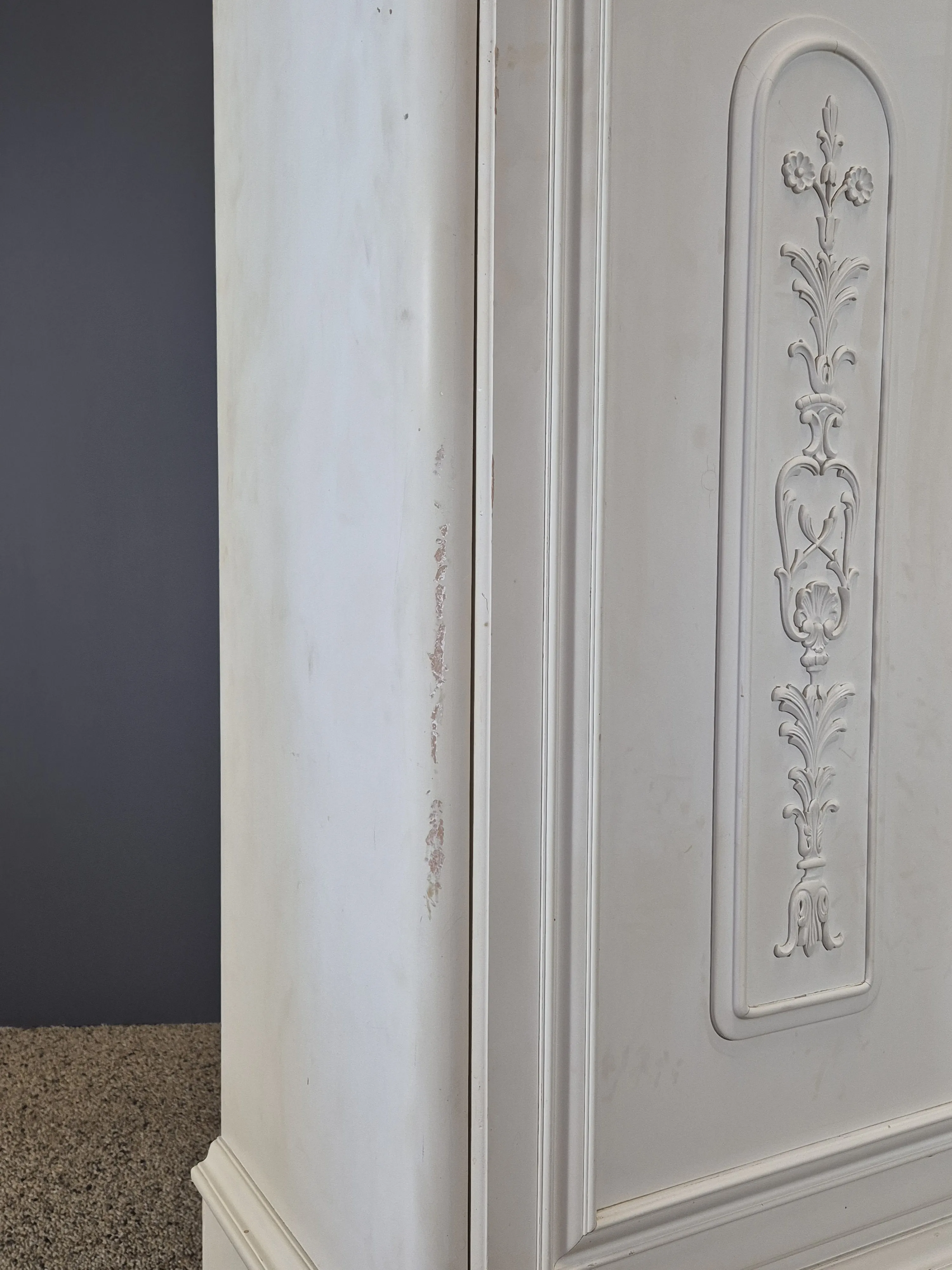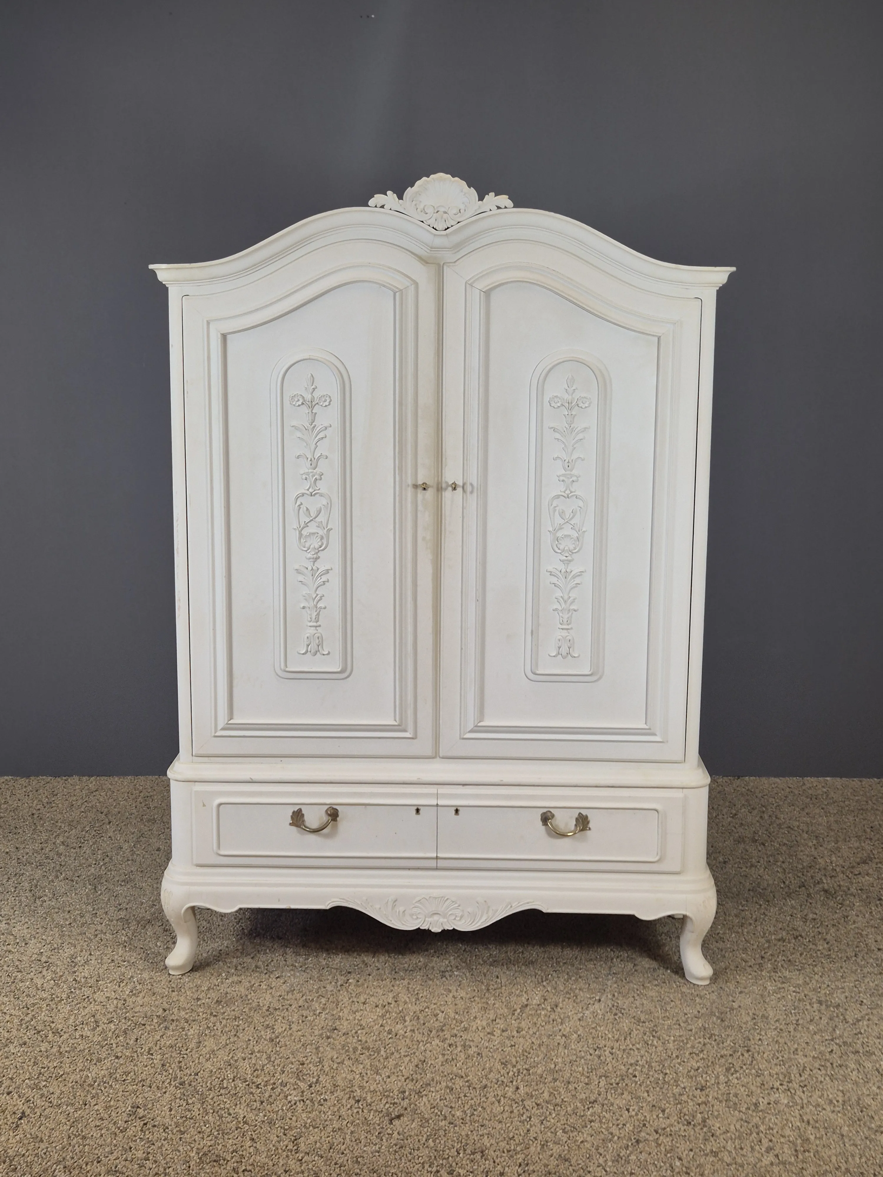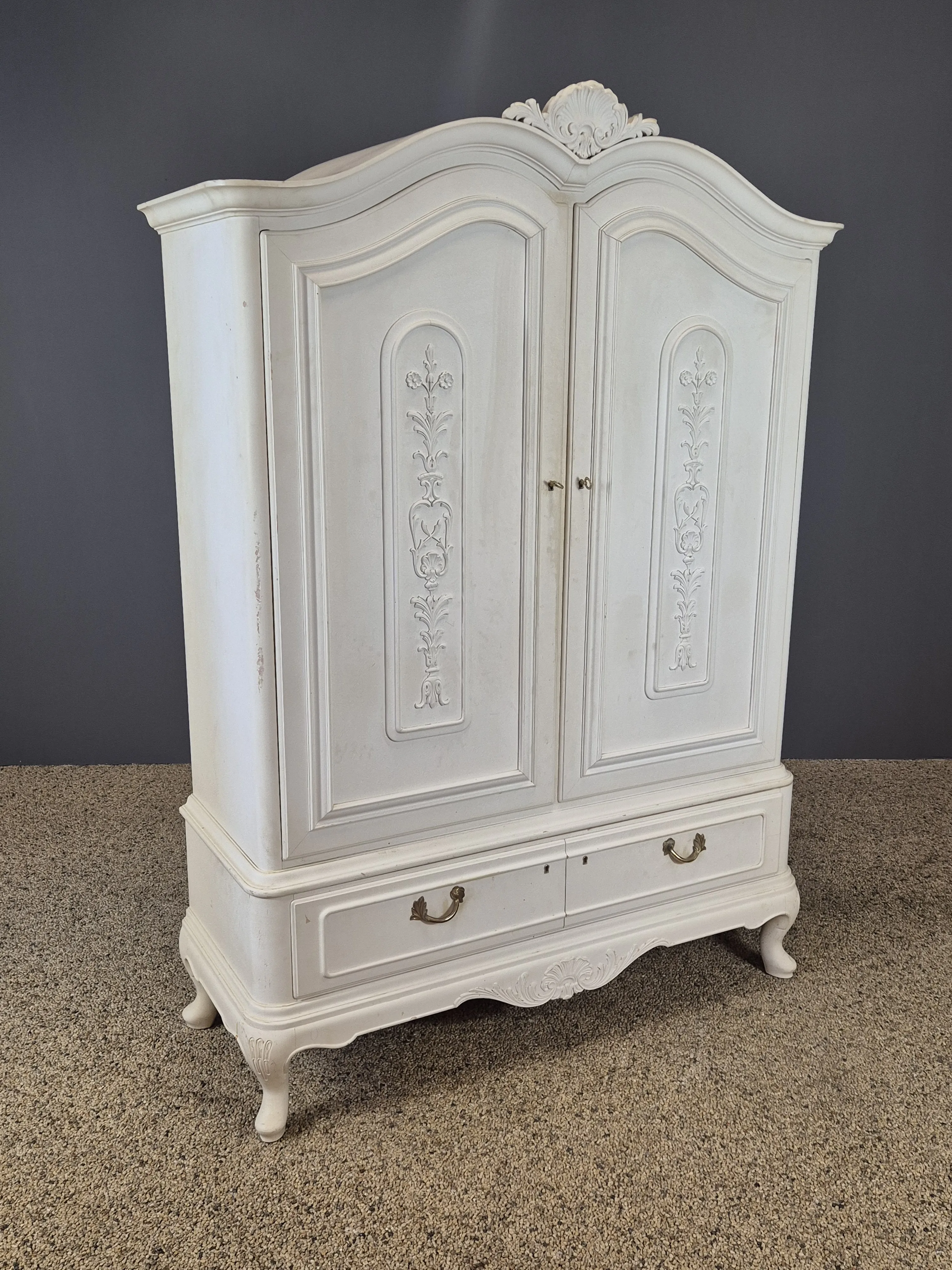 Skåp i bondrokoko-modell. Åldersslitage och missfärgningar förekommer. Höjd: 187cm. Bredd:130cm Djup: 50cm.
