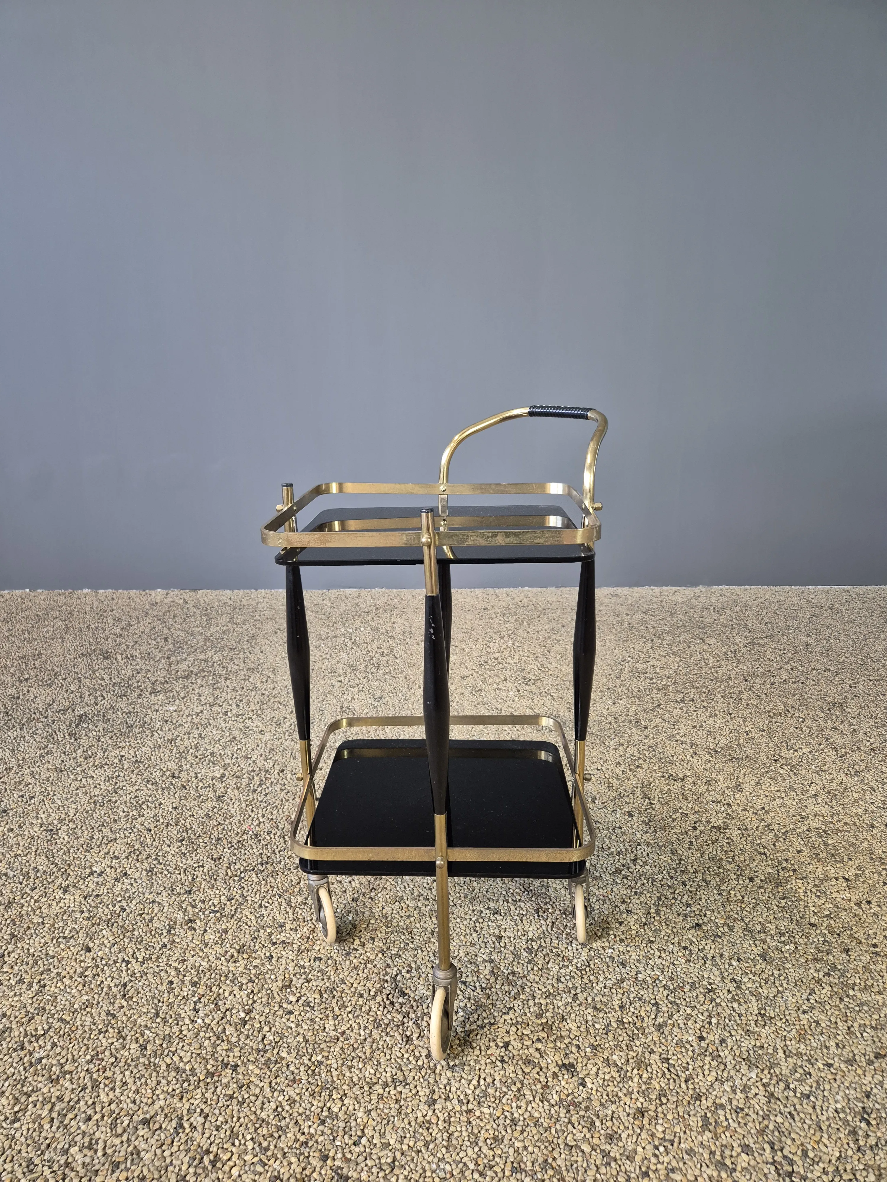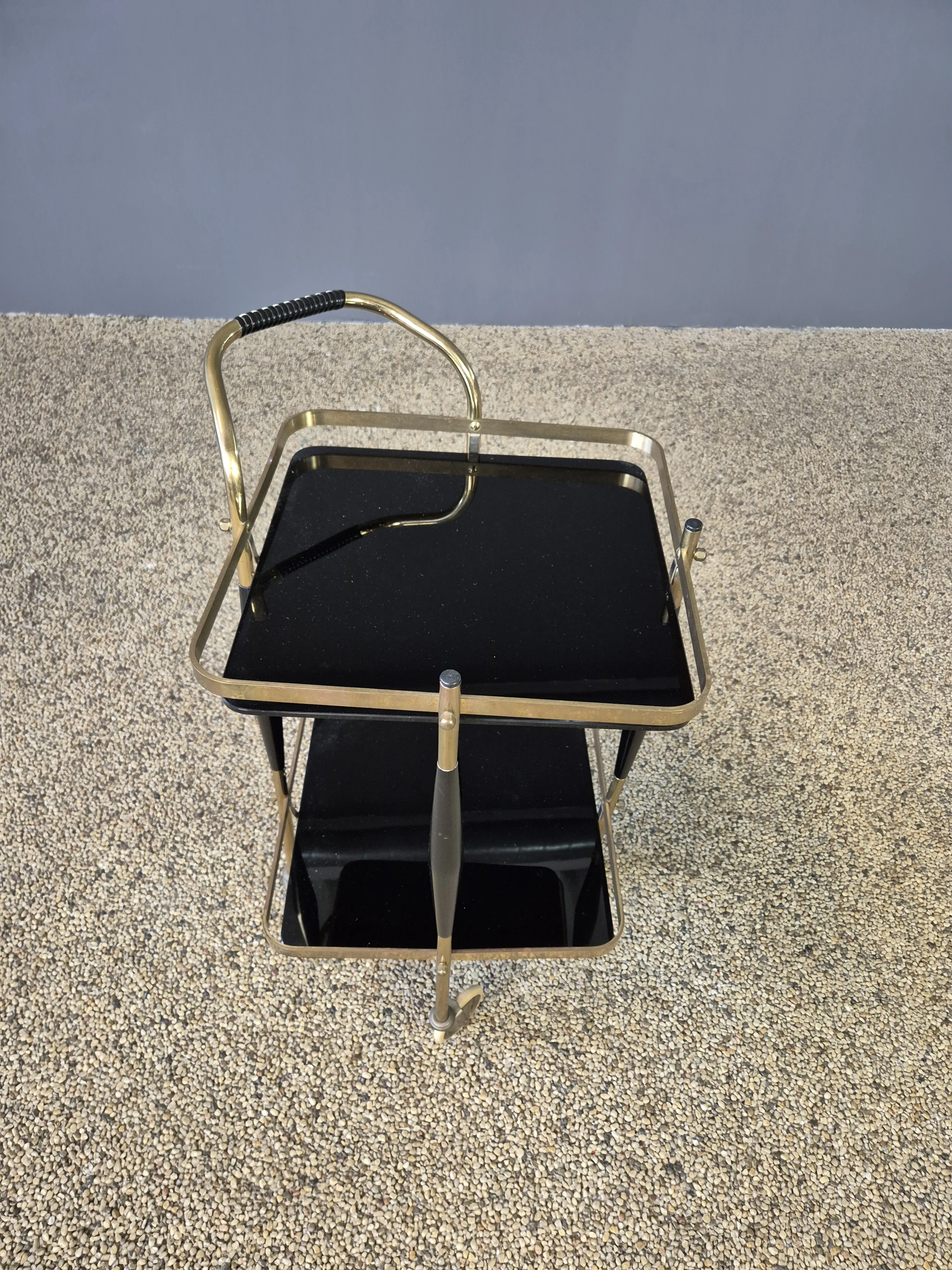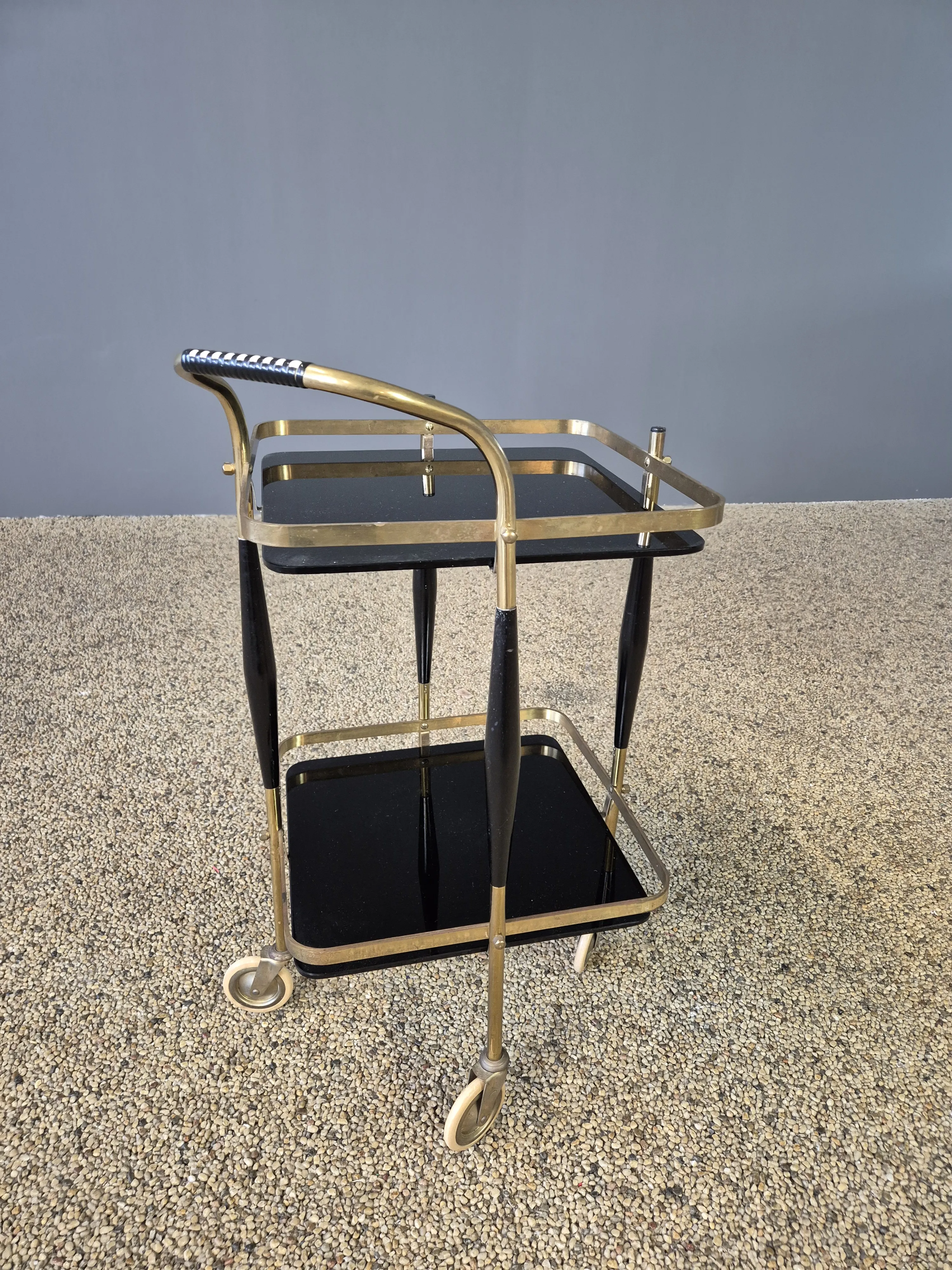 325.Serveringsvagn. Mässing, svärtat trä och glas. 1900-talets mitt.
