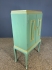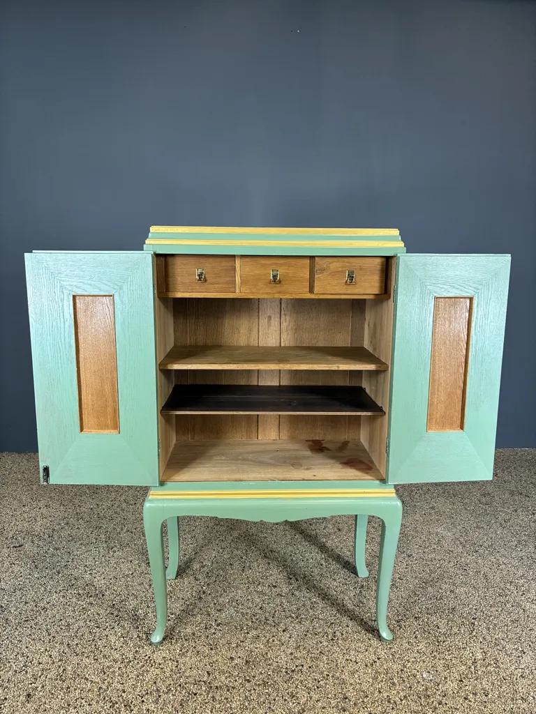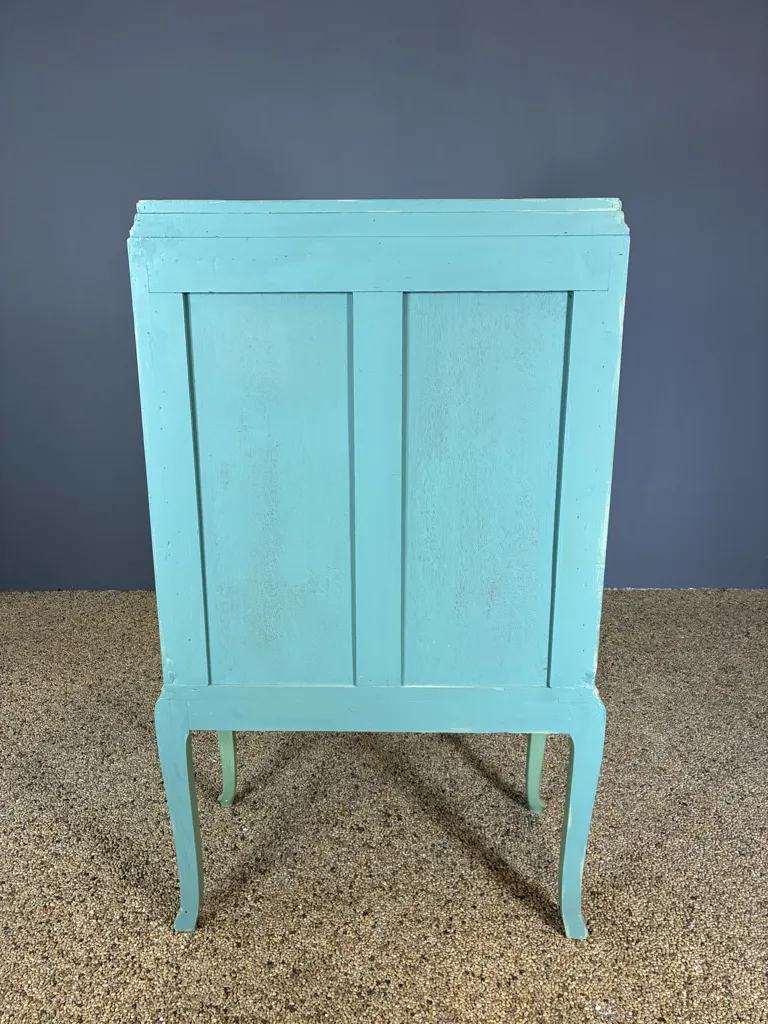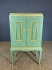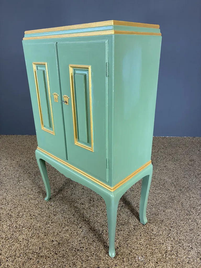 Grönmålat med guldmålade detaljer. Bruksslitage och fläckar. En nyckel finns. Höjd:133cm Bredd:80cm Djup:42cm