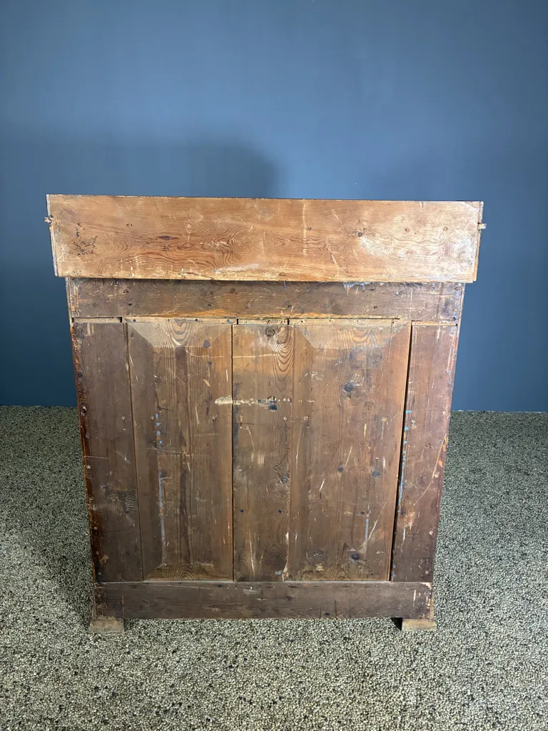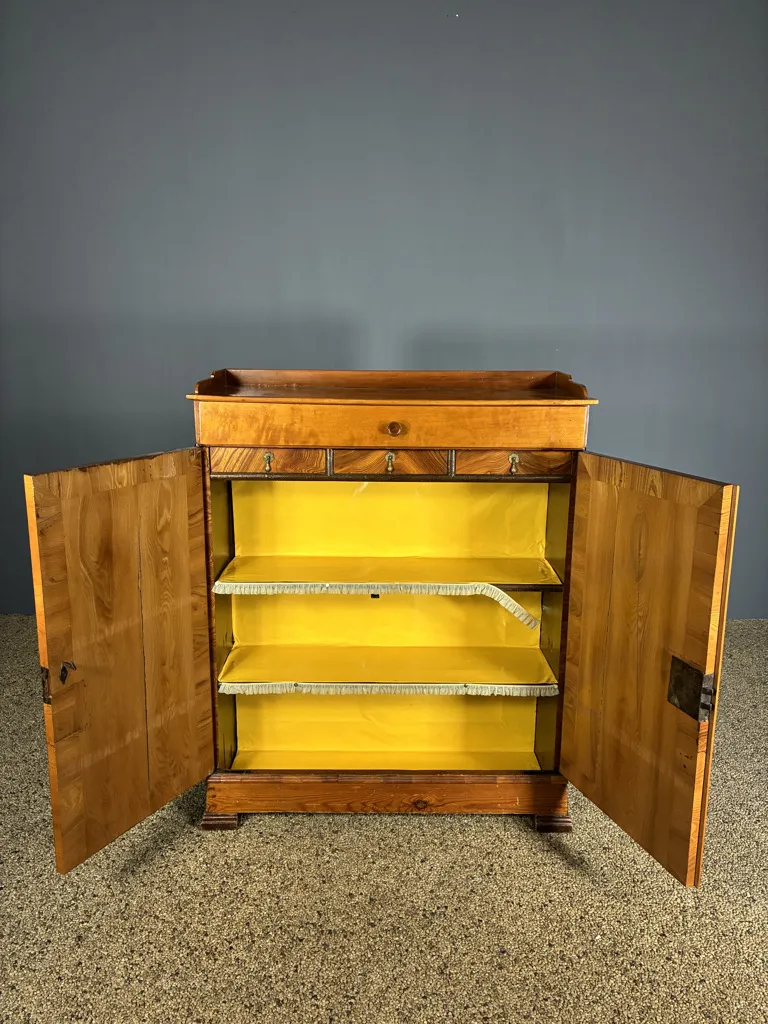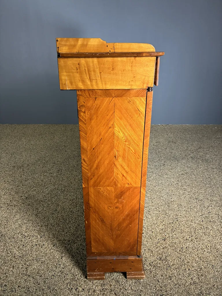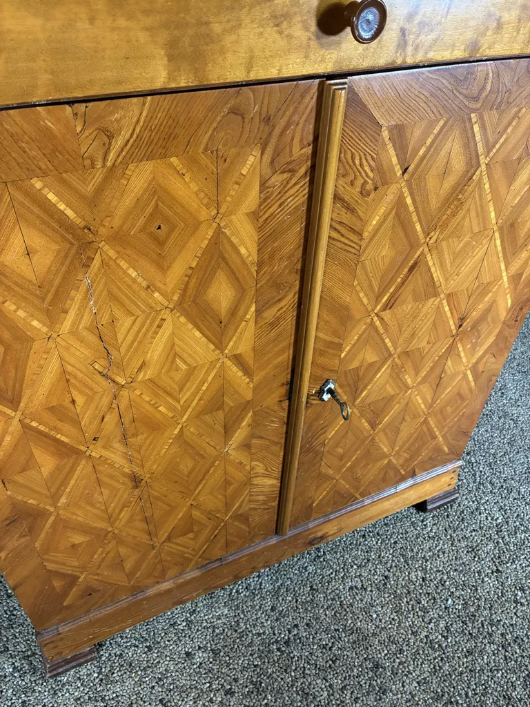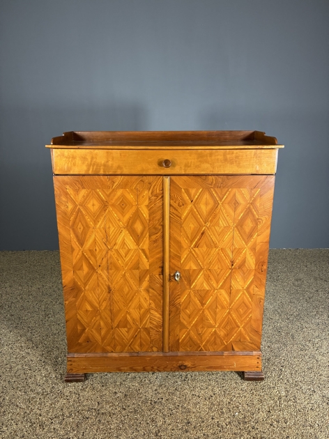 Skåp med inläggningar av flertalet träslag. Överdelen senare påbyggd. En nyckel finns. Åldersslitage och skador. Höjd: 118cm, Bredd: 95,5cm, Djup: 38cm.