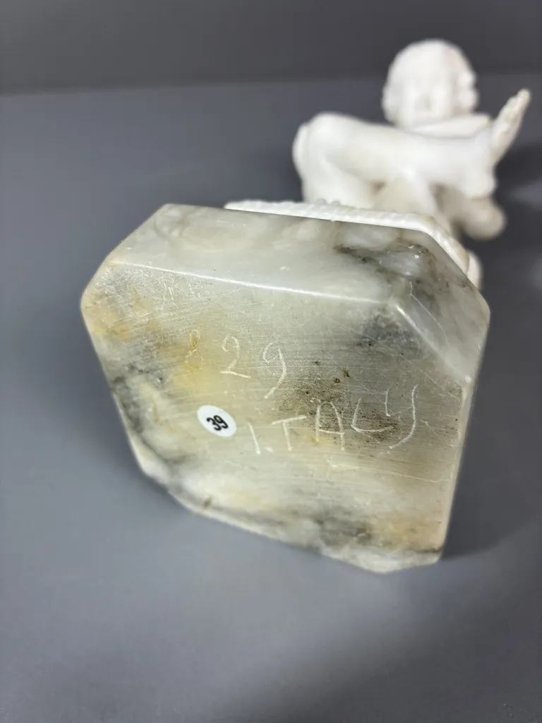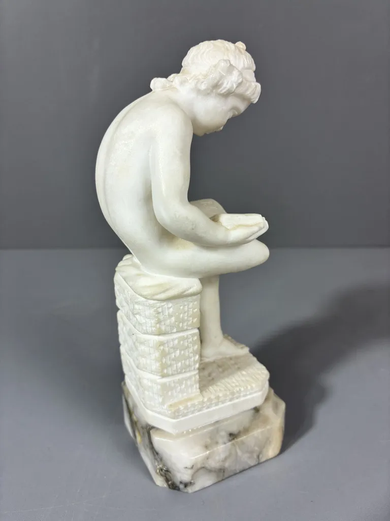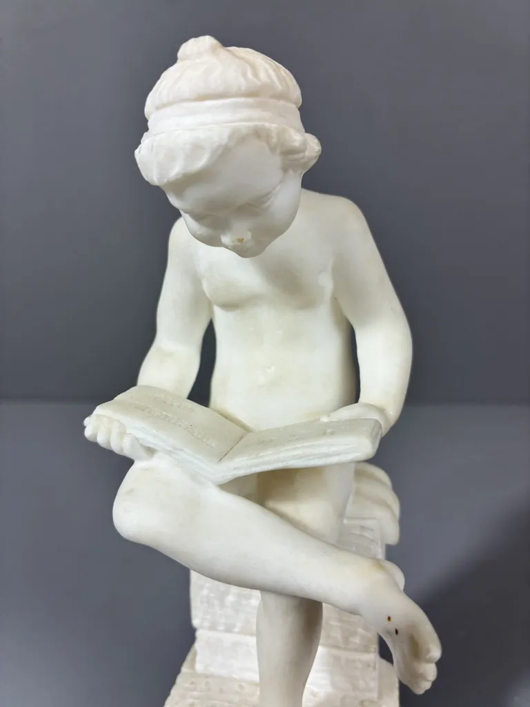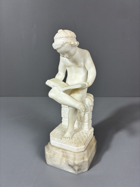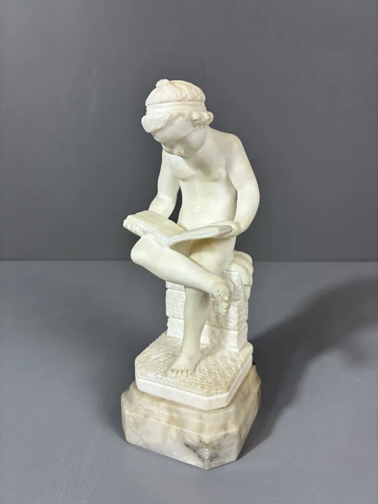 Läsande pojke i alabaster på en fot av marmor. Åldersslitage. Höjd:18cm