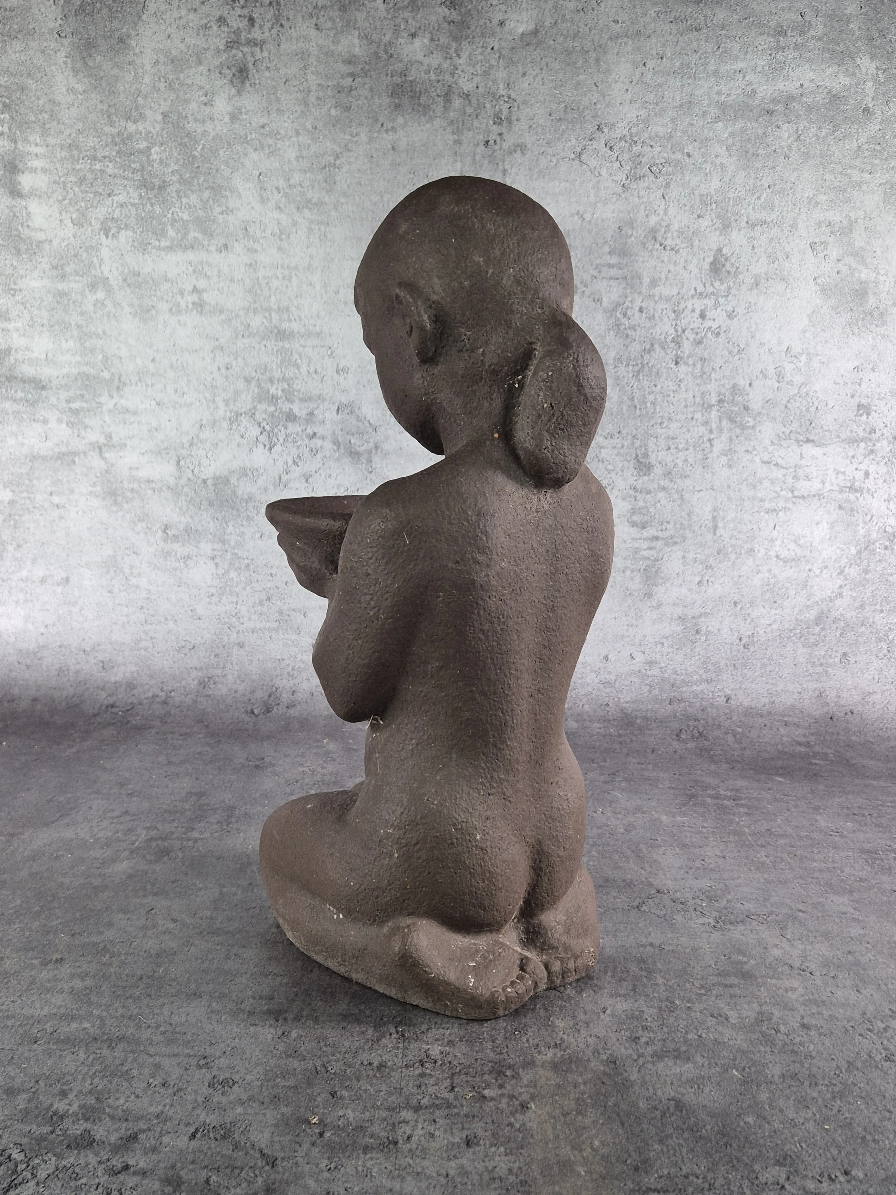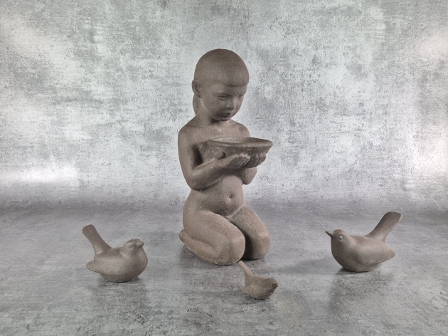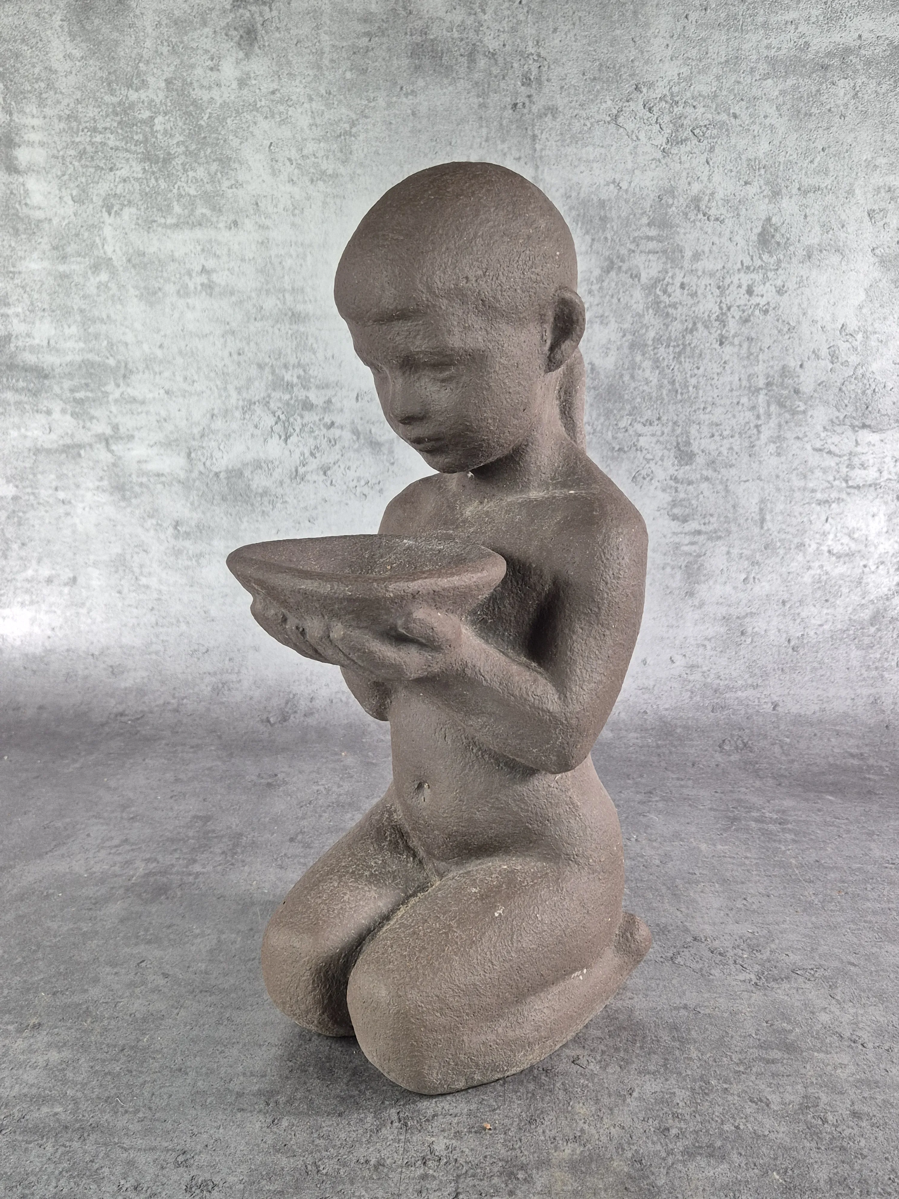 Underbar skulptur/fågelbad, Tillverkad på Knabstrup. Höjd 47cm. Brukslitage. en fågel med nagg på näbben.