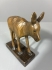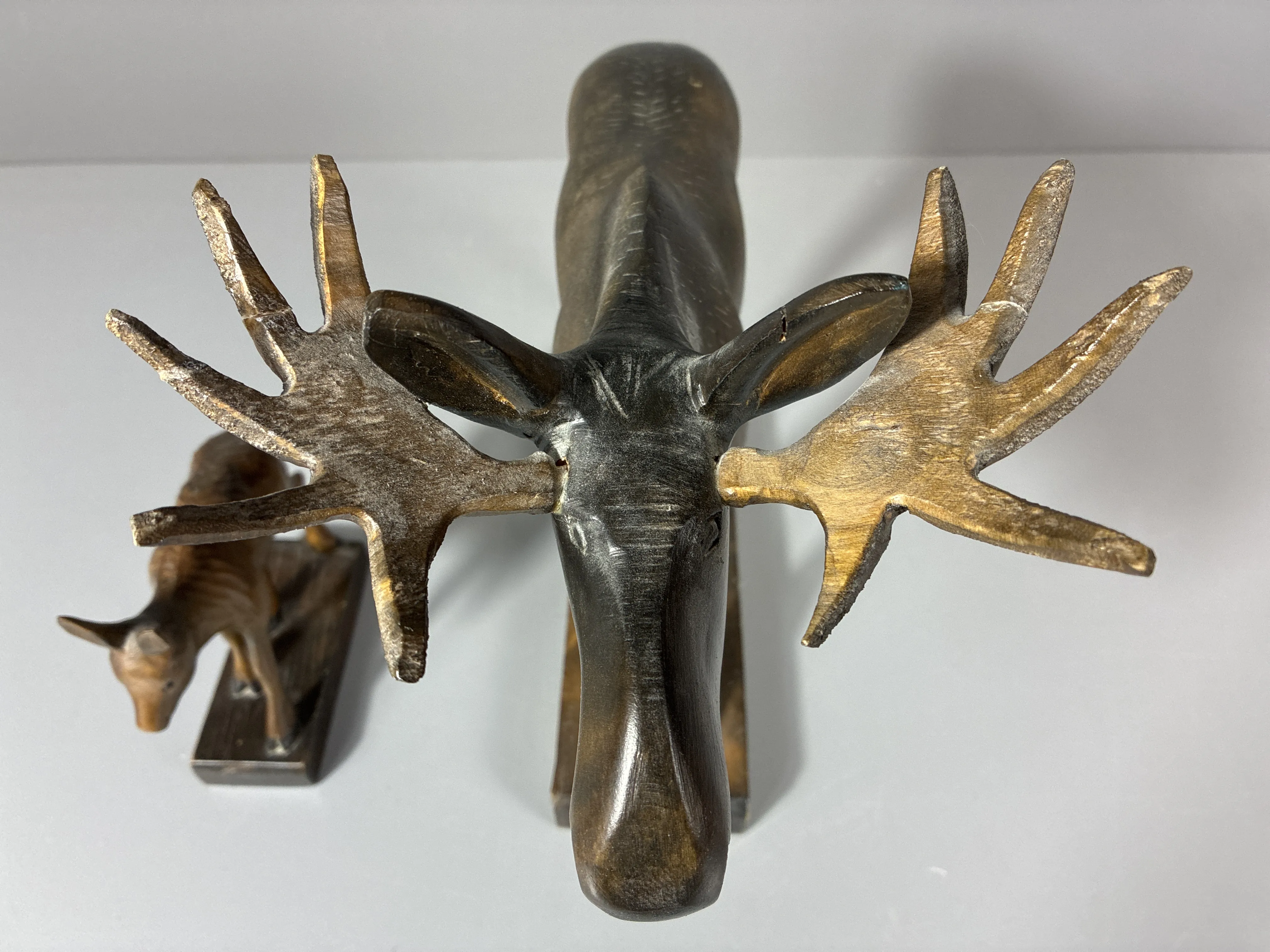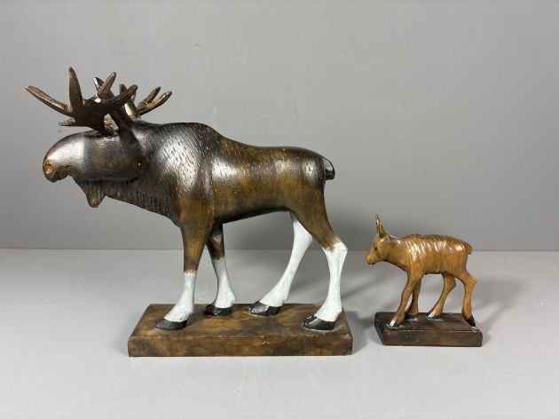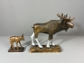 Älgtjur med kalv. Signerad L. Sand. Lagningar i älgkronan. Tjuren, Höjd: 28cm. Längd: 30cm. Kalven, Höjd 14cm. Längd: 13cm.
