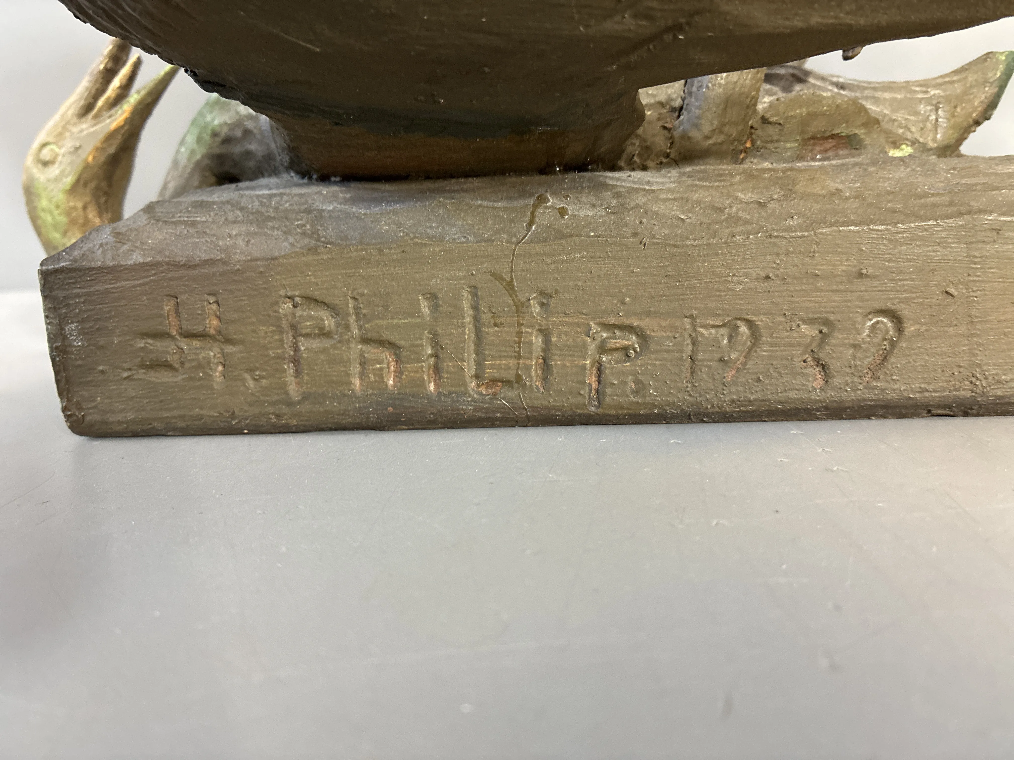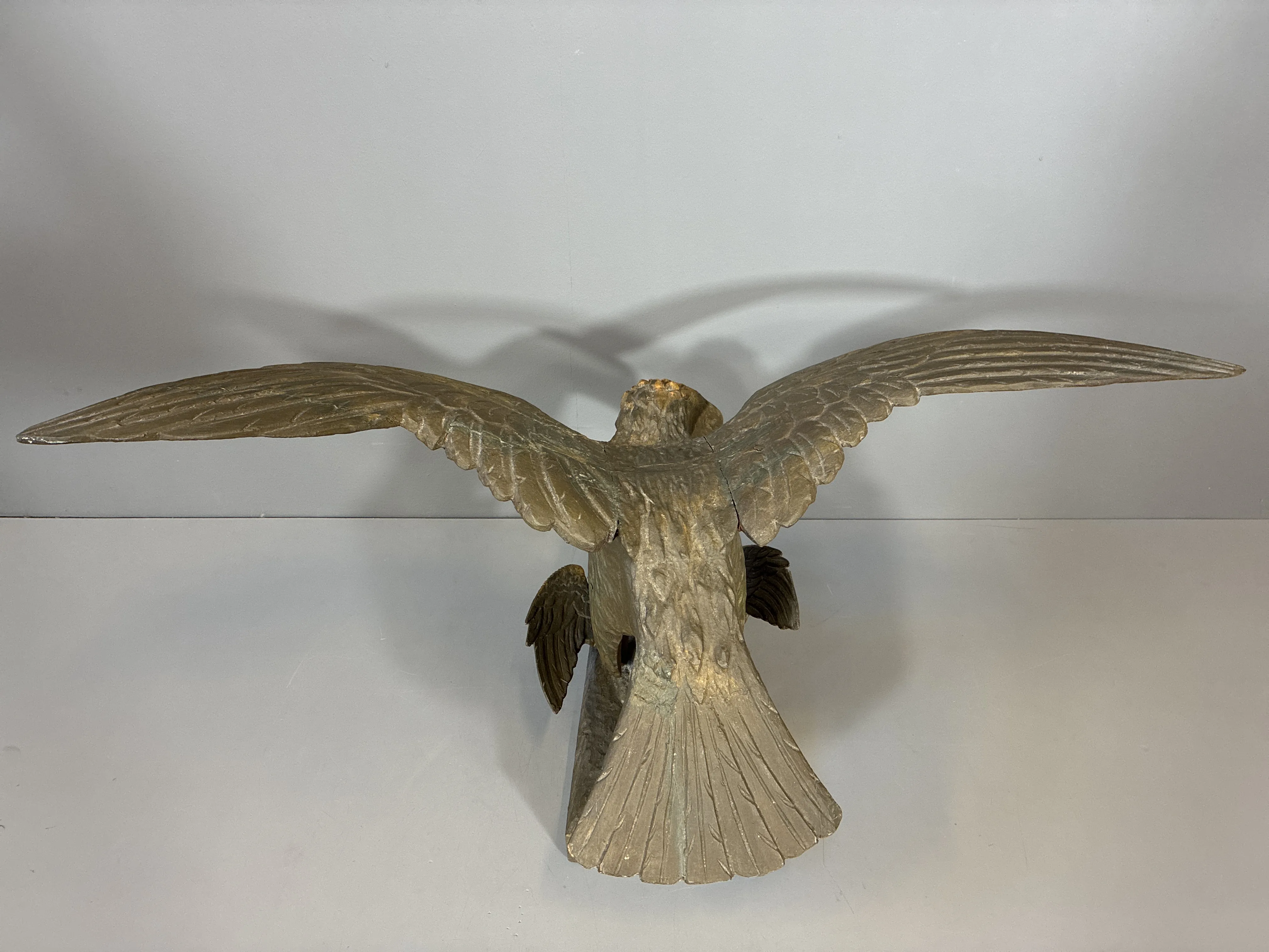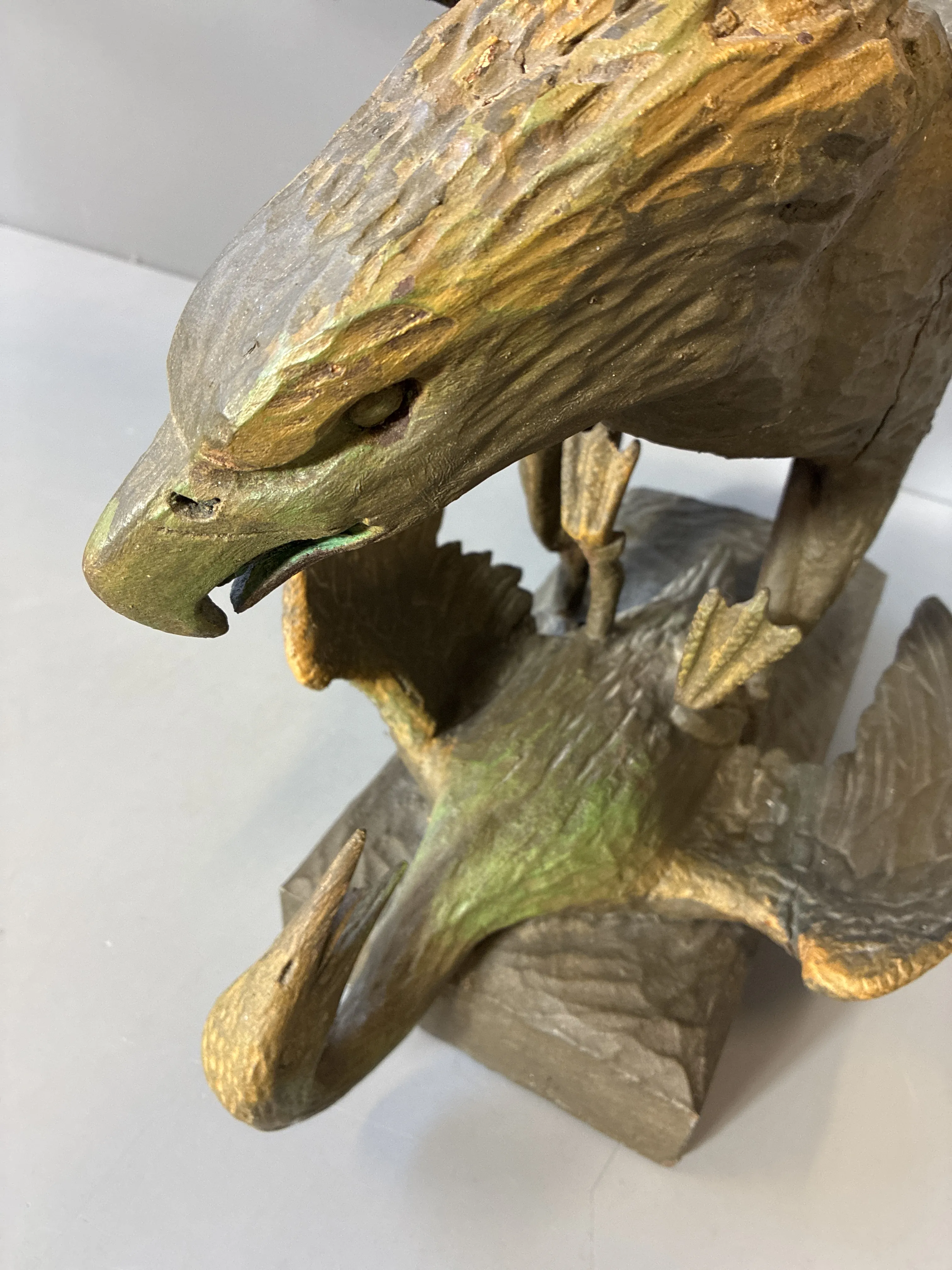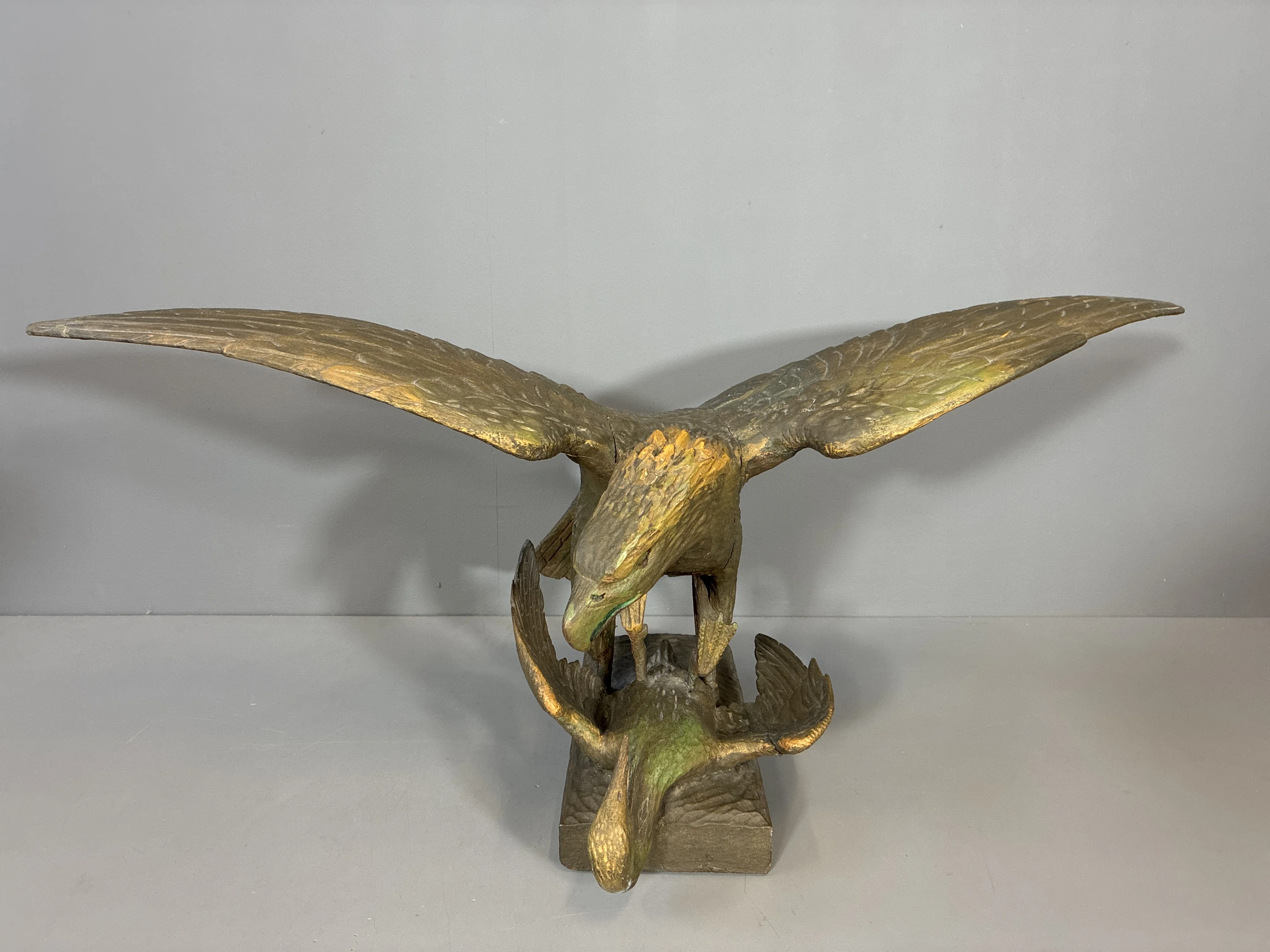 Örn med fällt byte. Vackert snidad i trä. Åldersslitage, sprickor och lagningar. Vingbredd: 109cm. Höjd: 45cm.